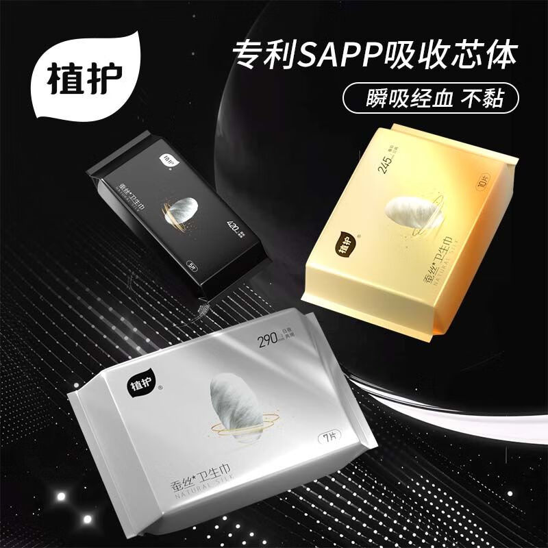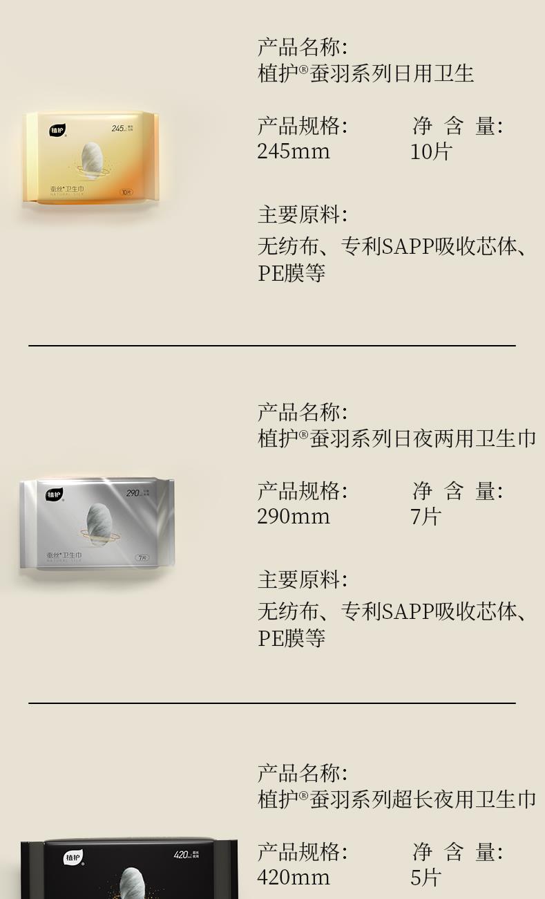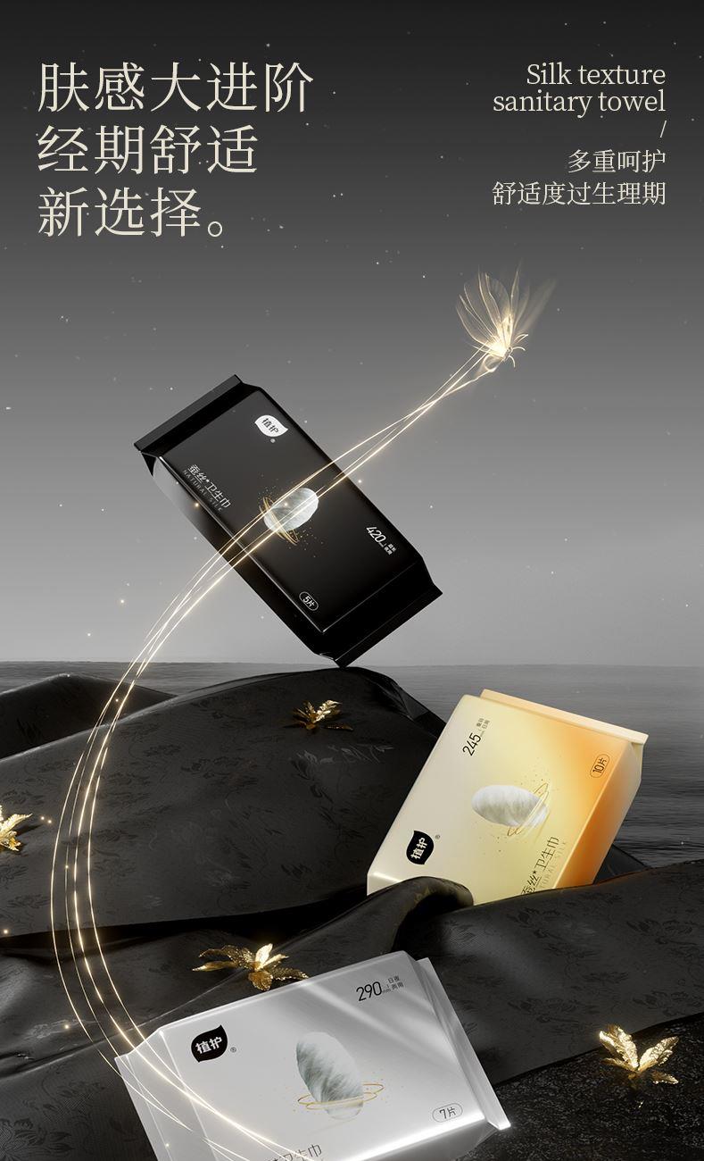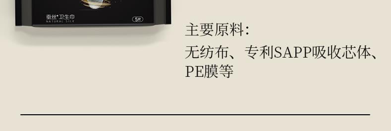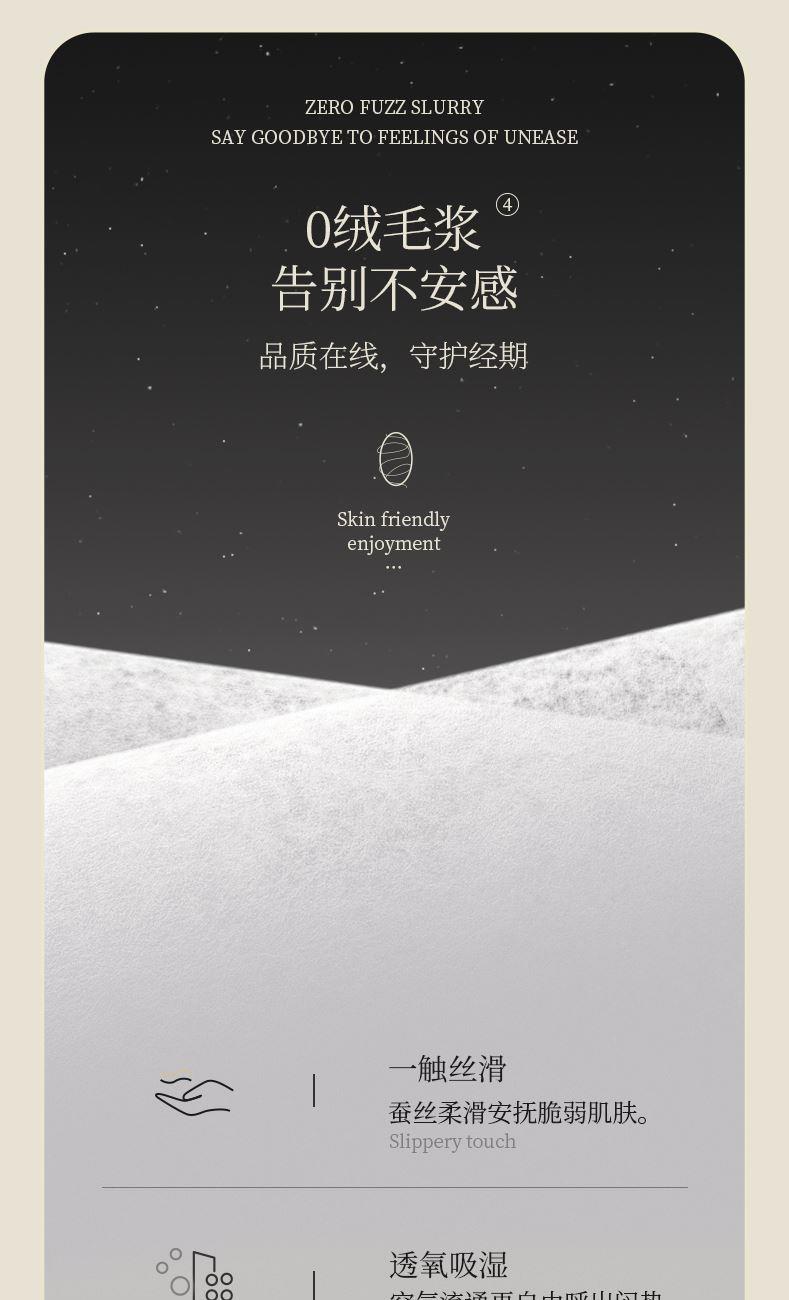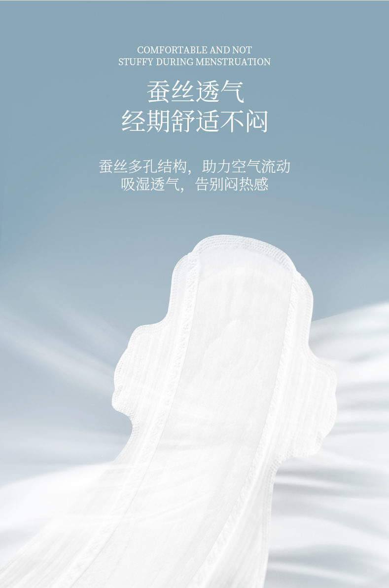 7.卫生巾含蚕丝面层,吸湿透气,丝绸般柔滑触感,呵护经期脆弱肌肤;