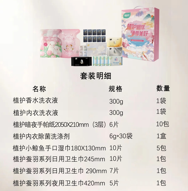 销售规格:植护香水洗衣液 300g/袋 *1袋+植护内衣洗衣液 300g/袋 *1袋+植护手口湿巾10抽*5包+蚕羽系列日用卫生巾 290mm/7片* 1包+日用卫生巾245mm/10片 *1包+夜用卫生巾420mm/5片 *1包+植护内衣洗衣液6g*30袋+植护暗夜手帕纸6片*10包