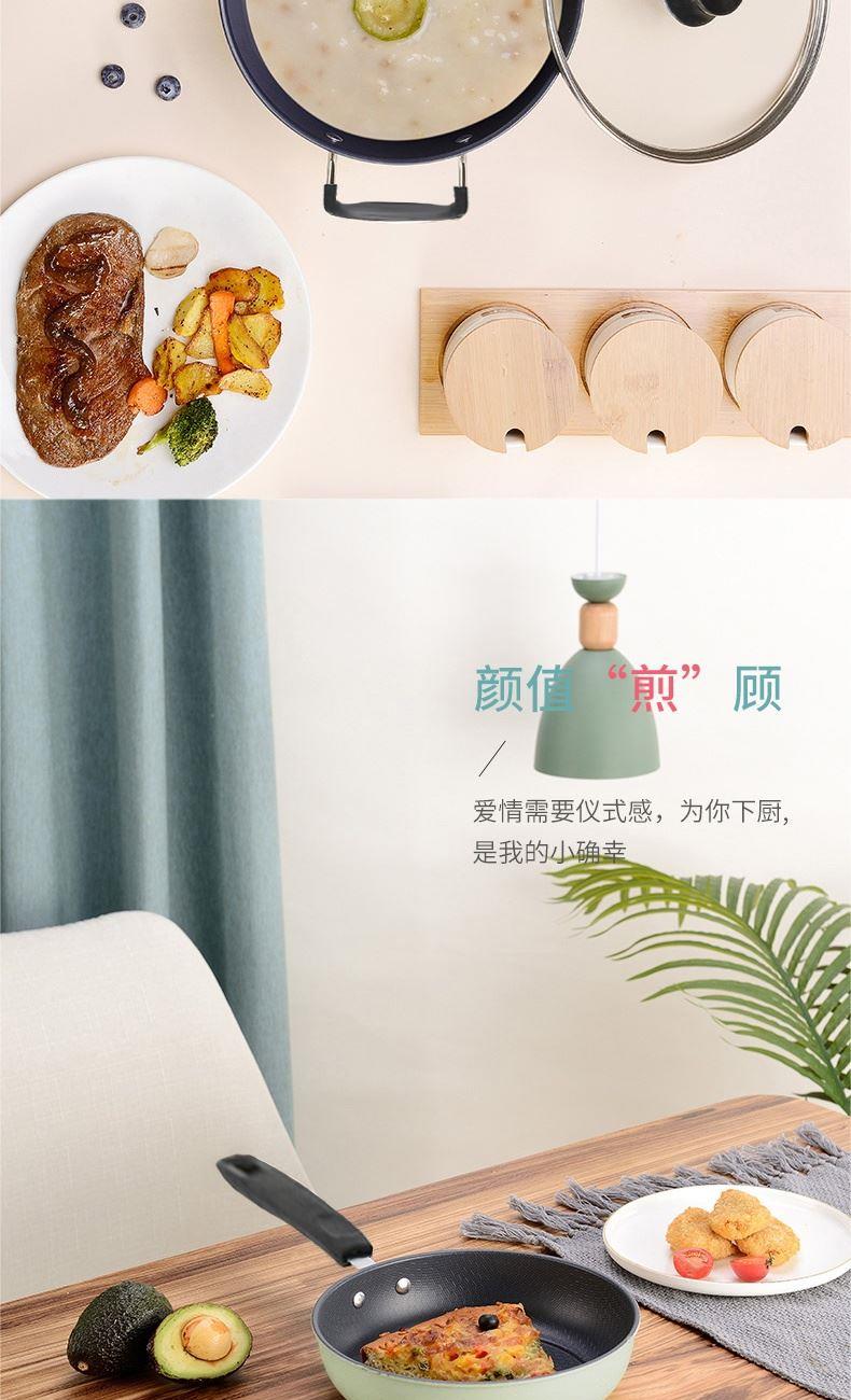 规 格:22cm汤锅+22cm煎锅 材 质 :精铁+麦饭石不粘涂层 精选优质铁基材,锅体采用独特工艺一次模压成型,独特造型优雅大方,尽享时尚烹饪生活;不粘涂层,省油少烟,光洁易亮,耐腐蚀,经久耐用,烹饪味道更可口; 手柄采用胶木手柄,隔热防烫,根据人体工程学设计的手柄,握感舒适,美观大方。