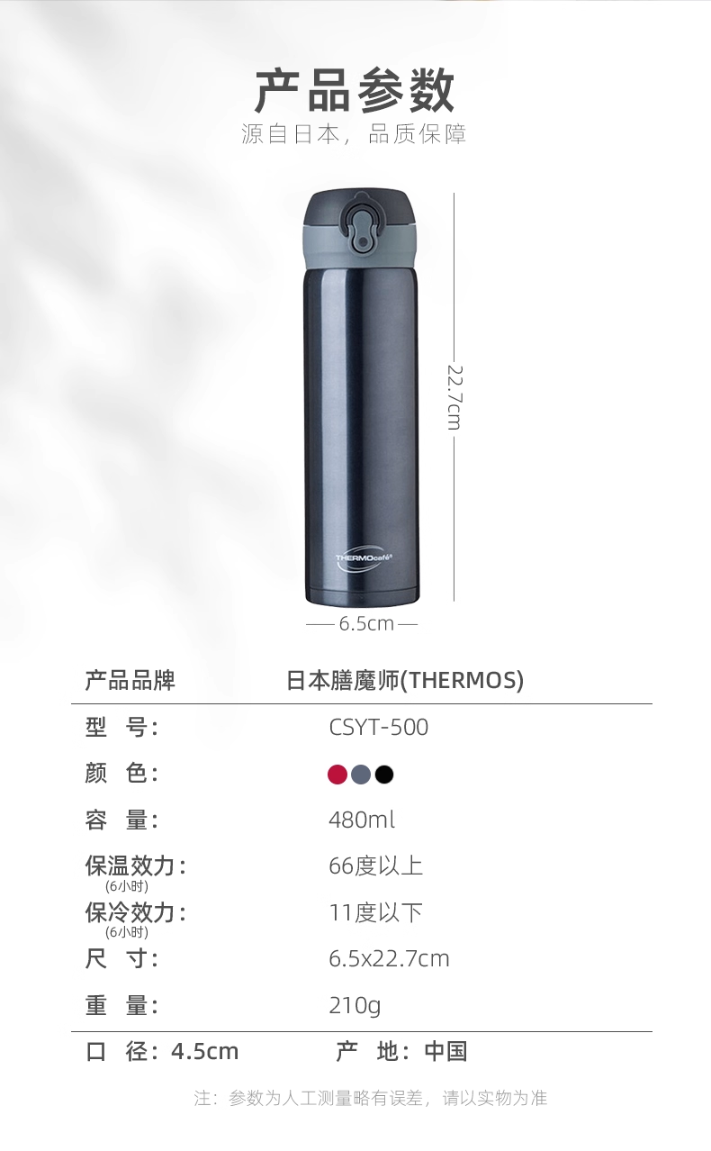 颜 色: ALB黑色 BGD红色 CGY灰色 容 量:500ml 类 型:不锈钢弹盖杯 定 制:可以定制 材 质:304 保 温:6小时约60°C 保 冷:6小时约11°C以下