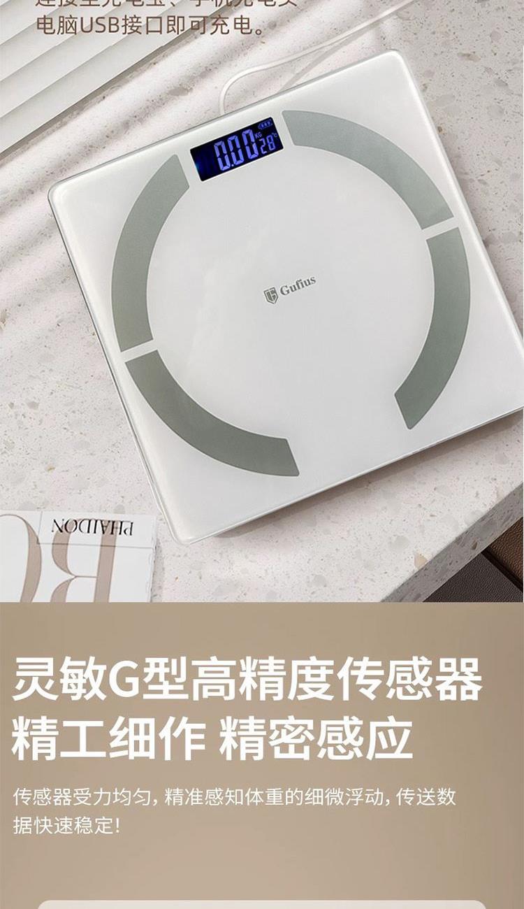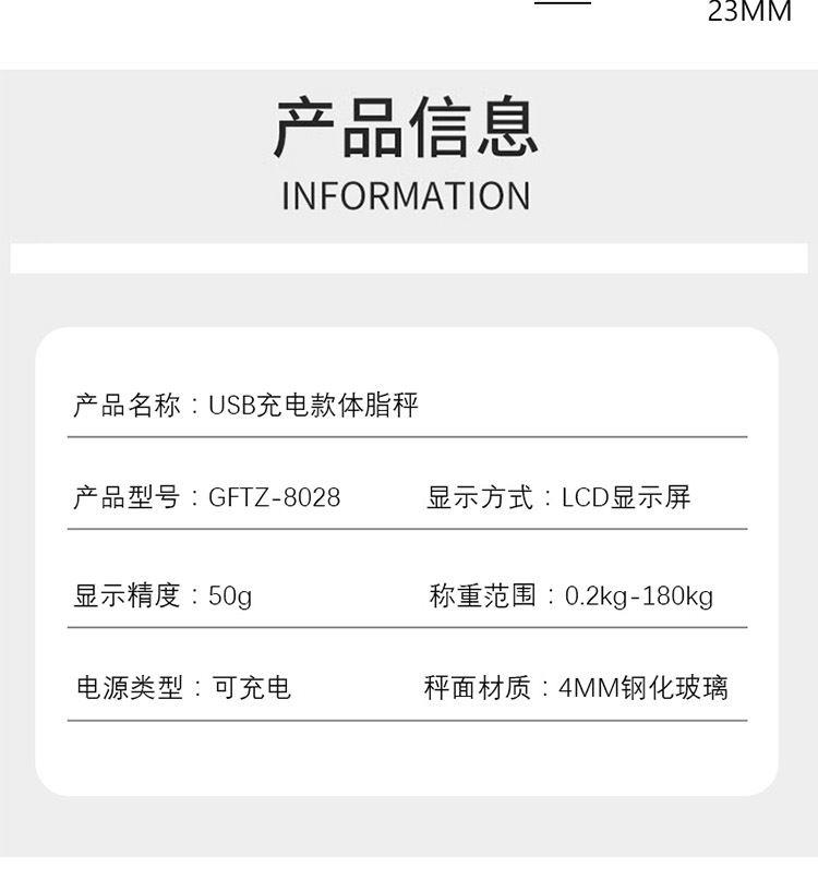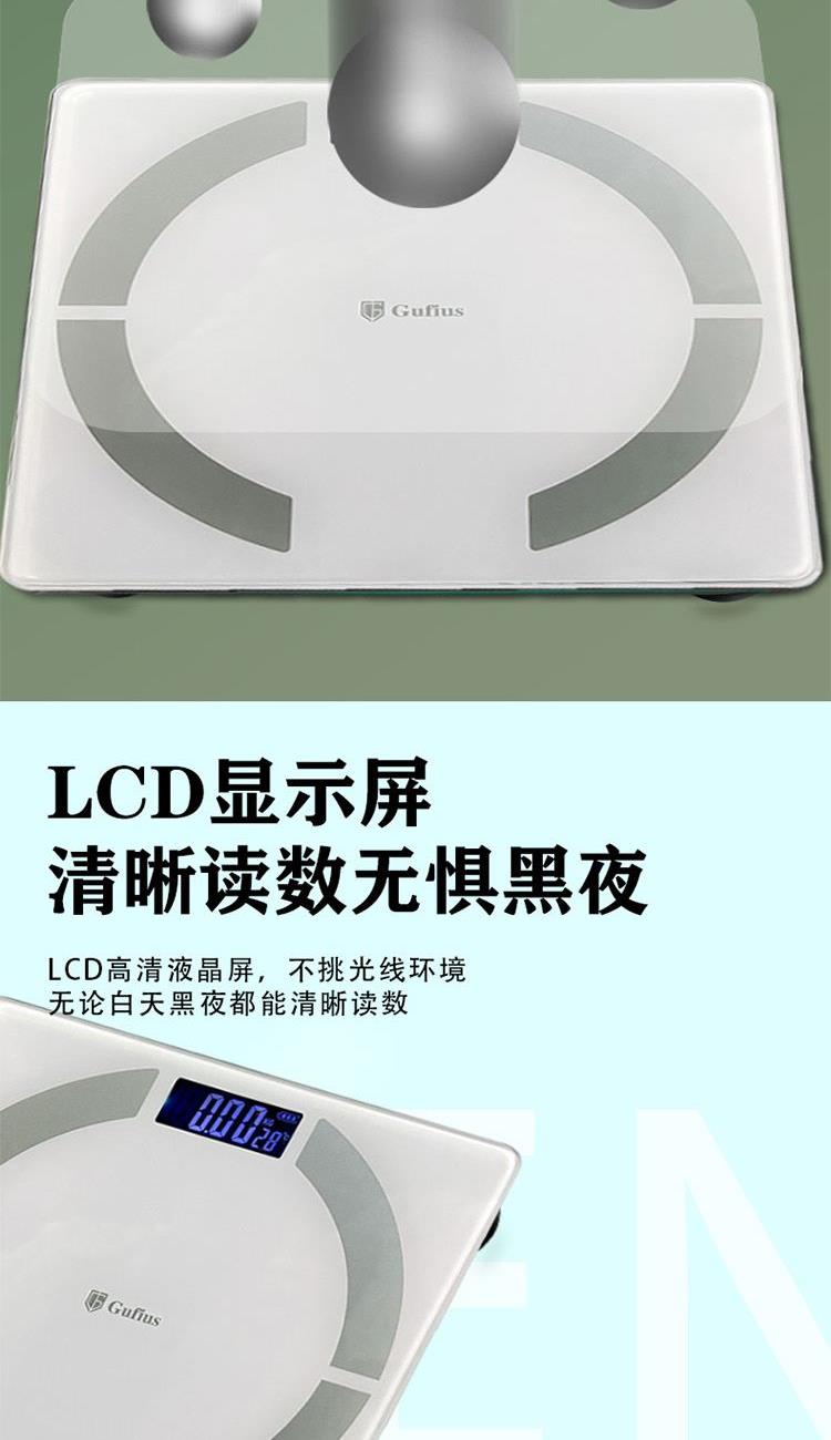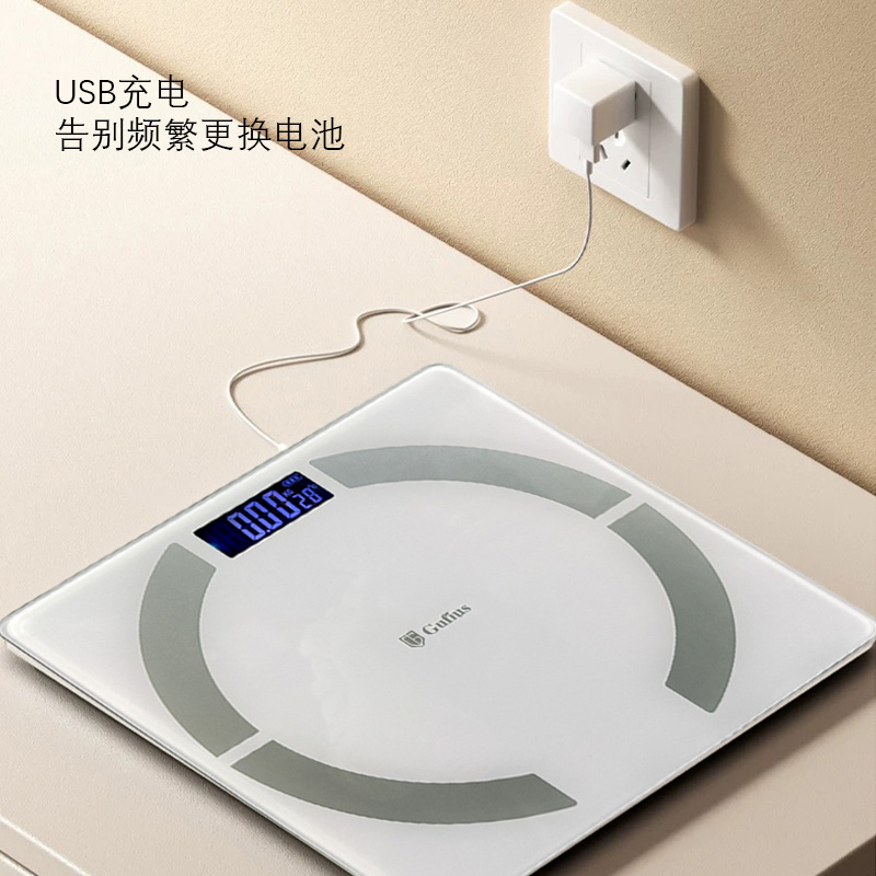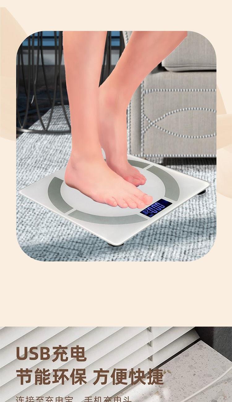 产品规格: 1、显示方式:LCD显示屏 2、称量范围:0.2-180kg 3、秤面材质:4MM钢化玻璃 4、显示精度:50g 5、电源类型:可USB充电 产品特点: 1、200g起称,精 准看得见 2、高强度钢化玻璃,坚固耐用 3、市斤/公斤一键切换,满足全年龄段习惯 4、TPU弹性防滑支撑,杜绝侧翻隐患 5、LCD大屏背光显示,昼夜皆清晰 6、体脂率实时在线检测,时刻提醒身材健康 7、USB充电,使用更便利,更具灵活性。