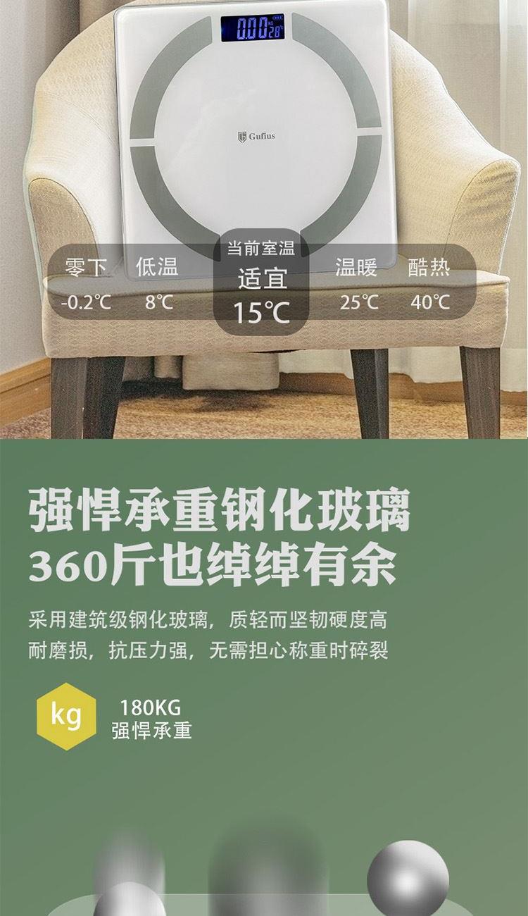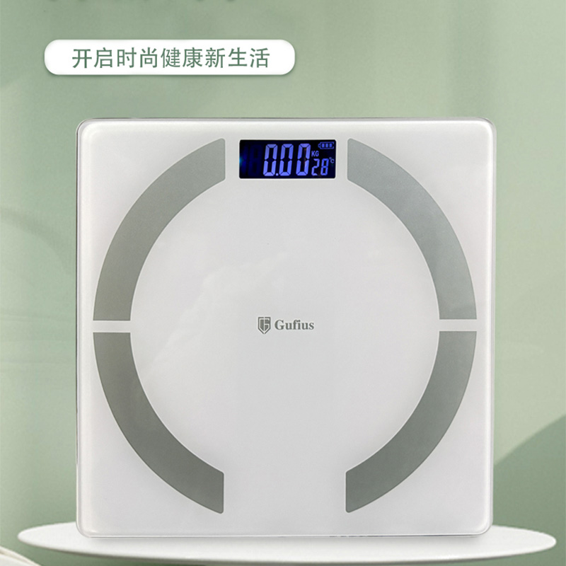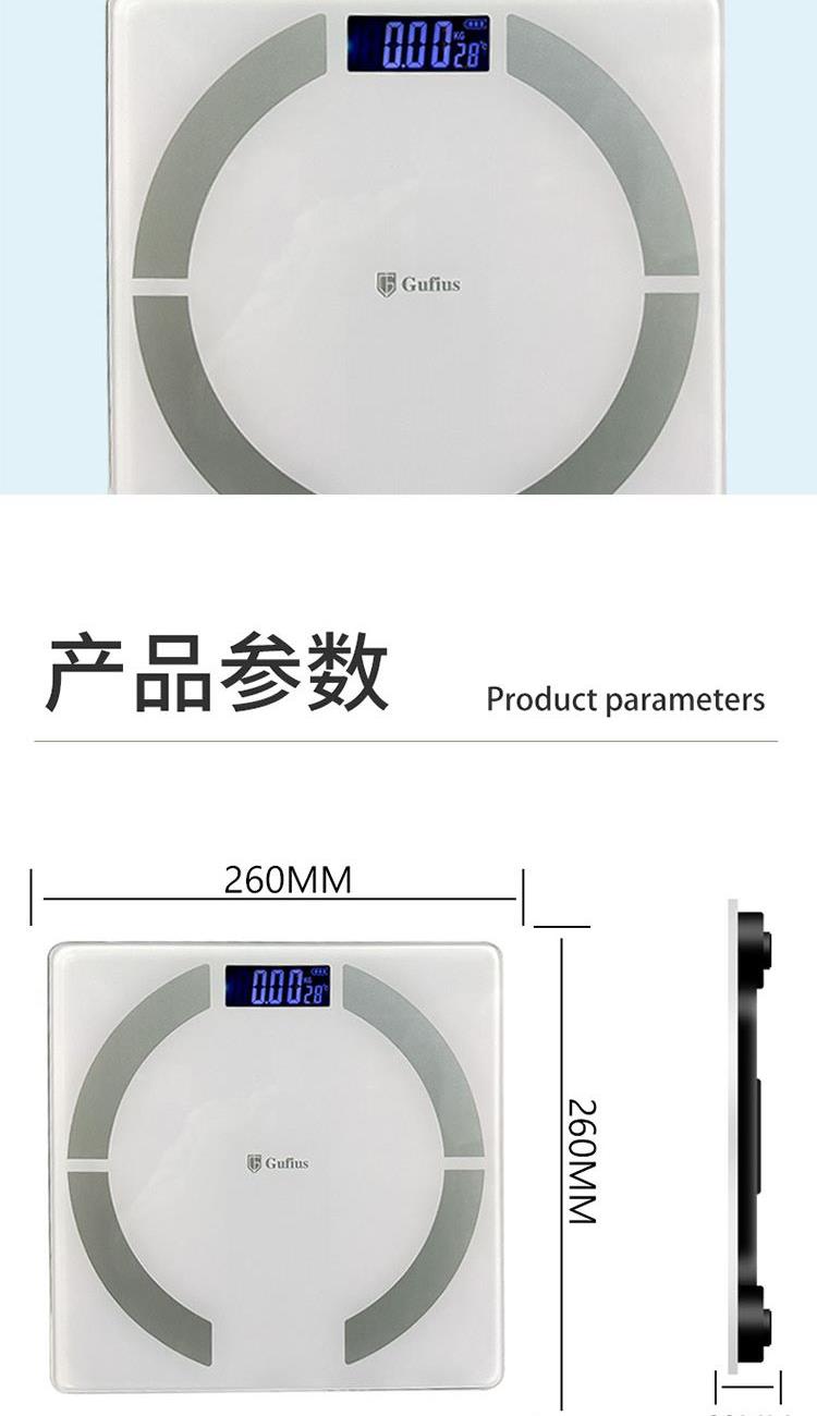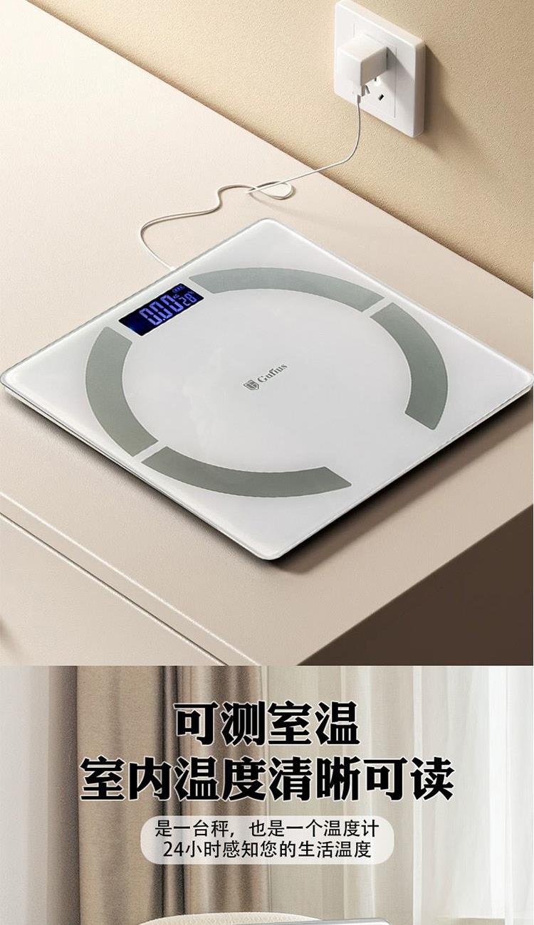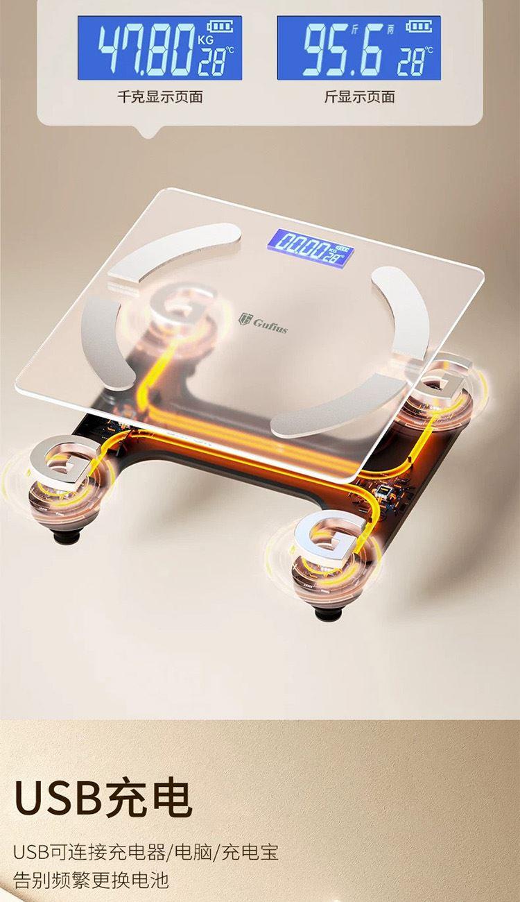产品规格: 1、显示方式:LCD显示屏 2、称量范围:0.2-180kg 3、秤面材质:4MM钢化玻璃 4、显示精度:50g 5、电源类型:可USB充电 产品特点: 1、200g起称,精 准看得见 2、高强度钢化玻璃,坚固耐用 3、市斤/公斤一键切换,满足全年龄段习惯 4、TPU弹性防滑支撑,杜绝侧翻隐患 5、LCD大屏背光显示,昼夜皆清晰 6、体脂率实时在线检测,时刻提醒身材健康 7、USB充电,使用更便利,更具灵活性。