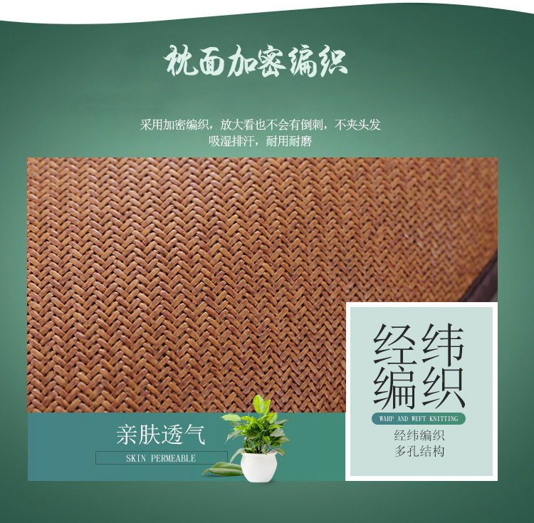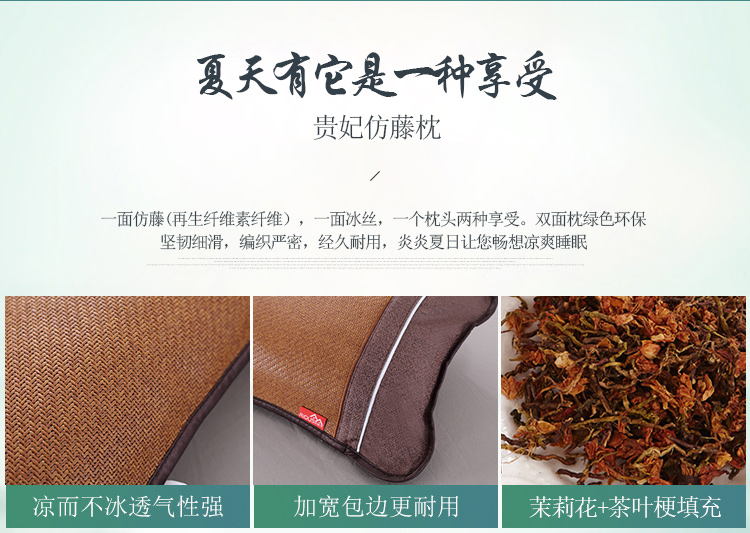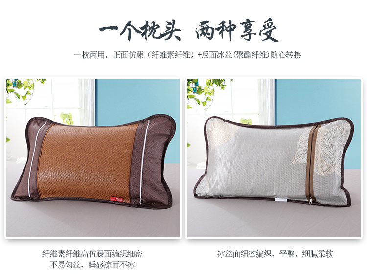 规 格:33*55cm 花 型:卡其色 面 料: 再生纤维素纤维 填充物:茉莉花+茶叶梗 双面不同材质,一面仿藤面料编织细密,不易勾丝,凉而不冰,舒适透气,一面冰丝,一个枕头两种享受,不夹头发,双面可用绿色环保,枕套和内芯可拆分,方便清洗枕套,内芯采用茶叶茉莉花填充清香入眠。