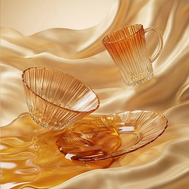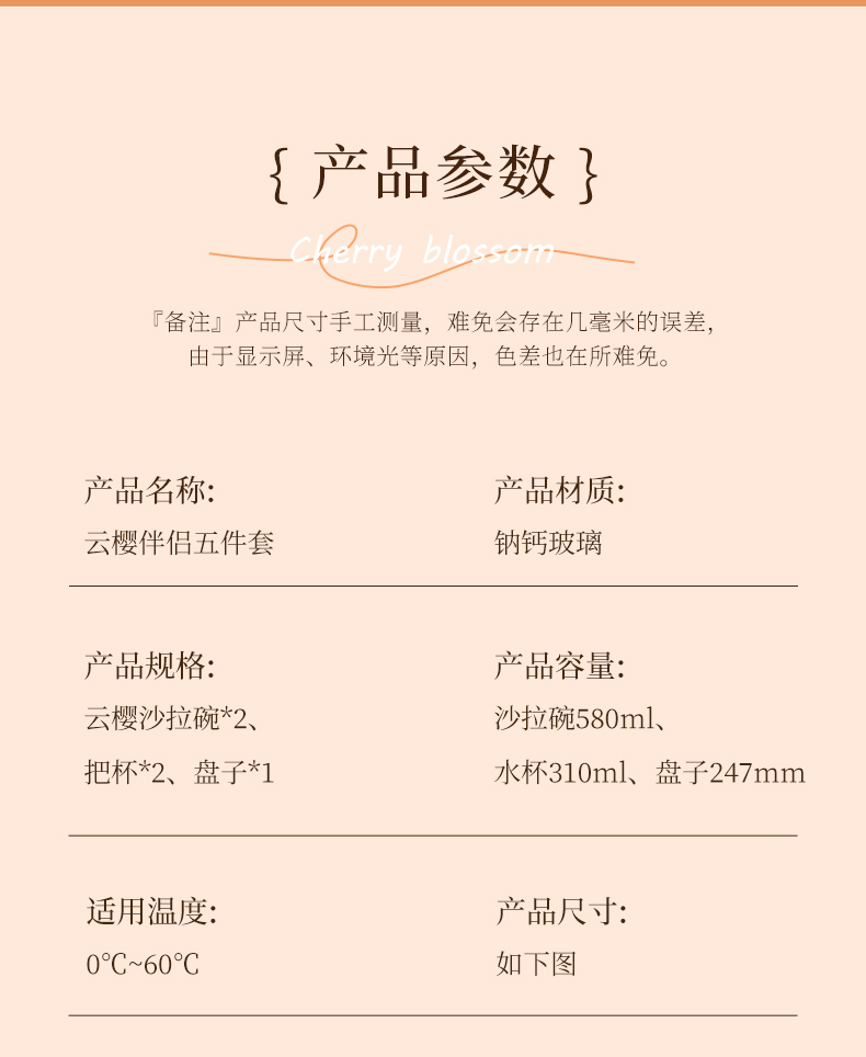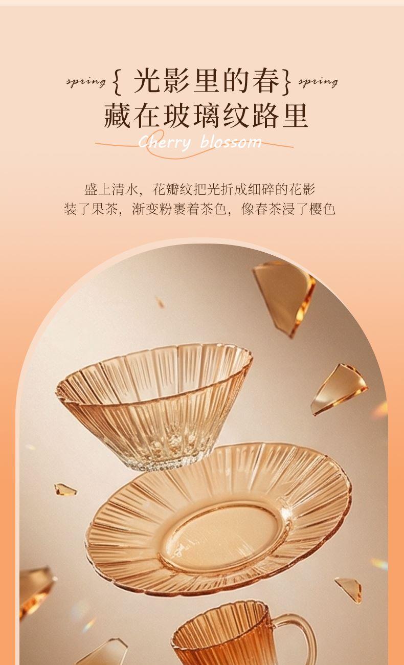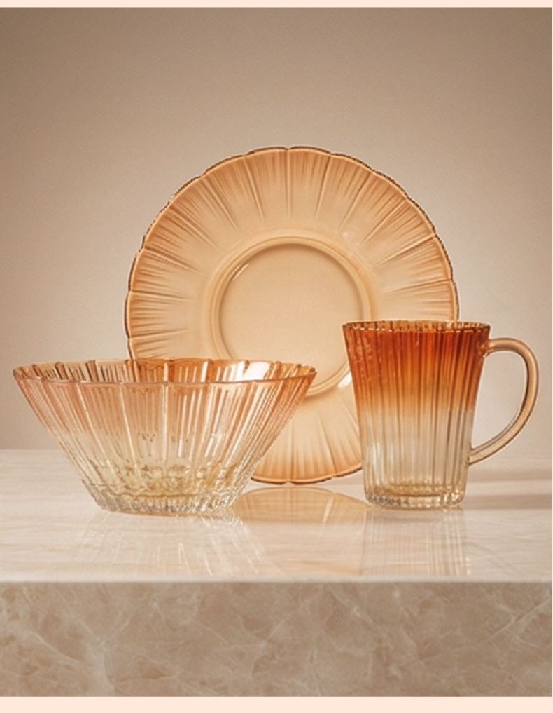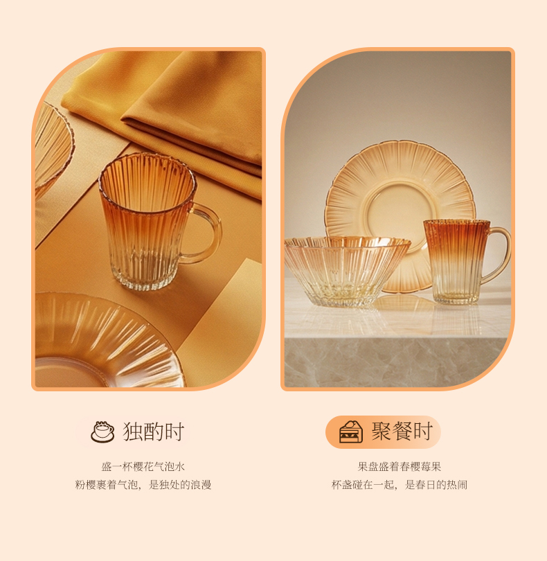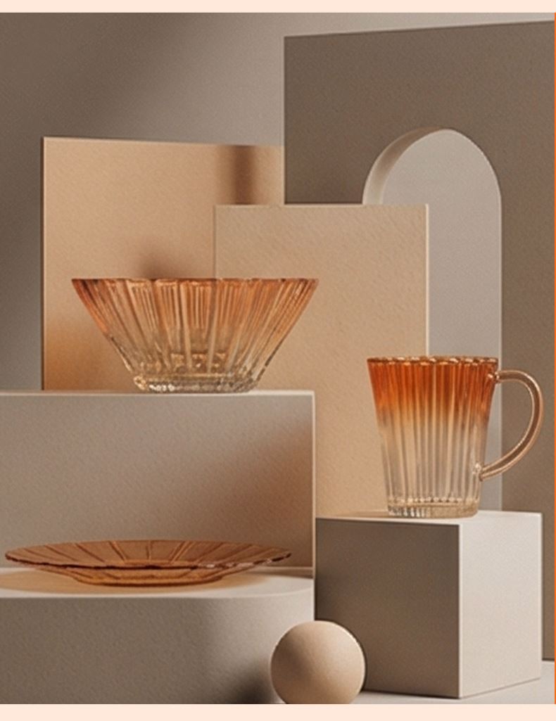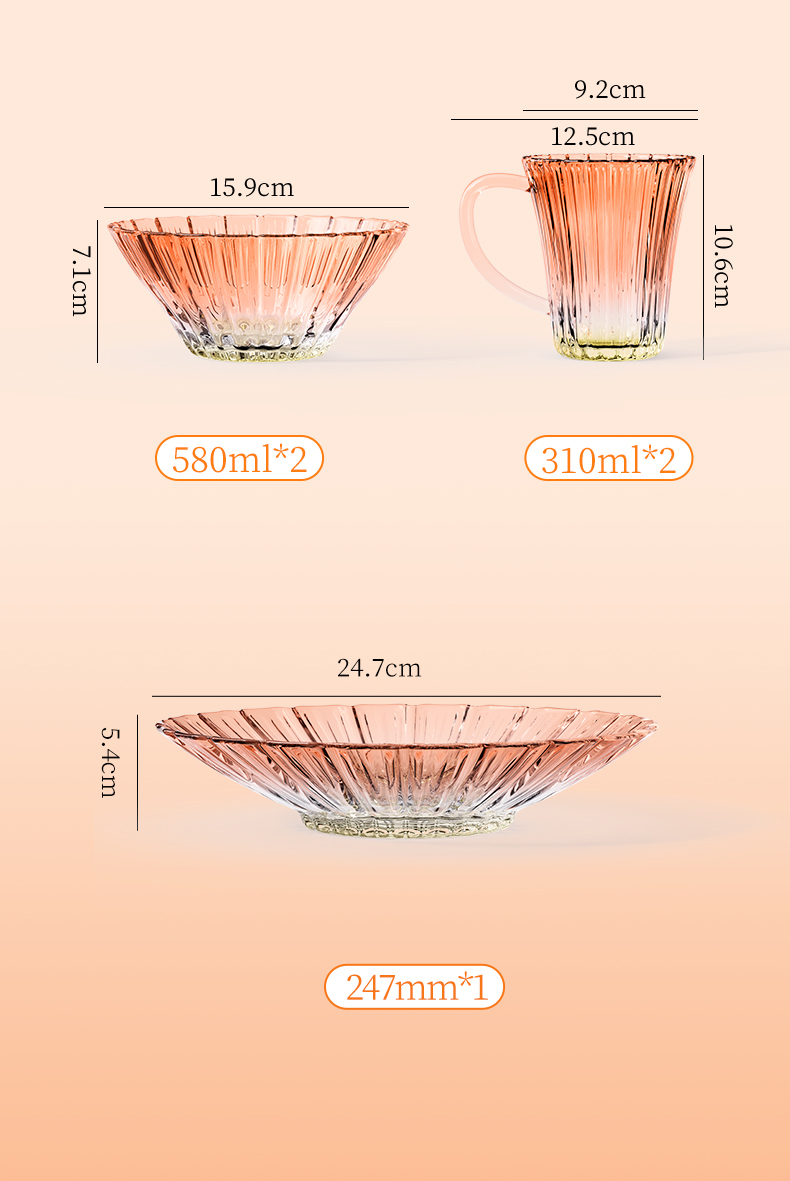适用温度:0°C-60°C 材 质:钠钙玻璃 产品参数:沙拉碗580ml*2、水杯310ml*2、果盘247*54mm 彩盒尺寸:422*100*378mm 外箱尺寸:62.4*43.6*39.4cm 产品卖点:1.采用温暖的高颜值渐变玻璃工艺,色彩从深到浅过渡自然。 2.多元场景,点亮精致生活一套包含水杯、沙拉碗和点心盘,轻松驾驭各种日常需求。 3.高颜值玻璃餐具上市发售咯,复古竖纹搭配高 级琥珀渐变,自带轻奢氛围感。