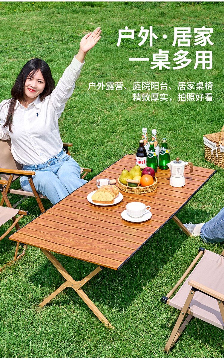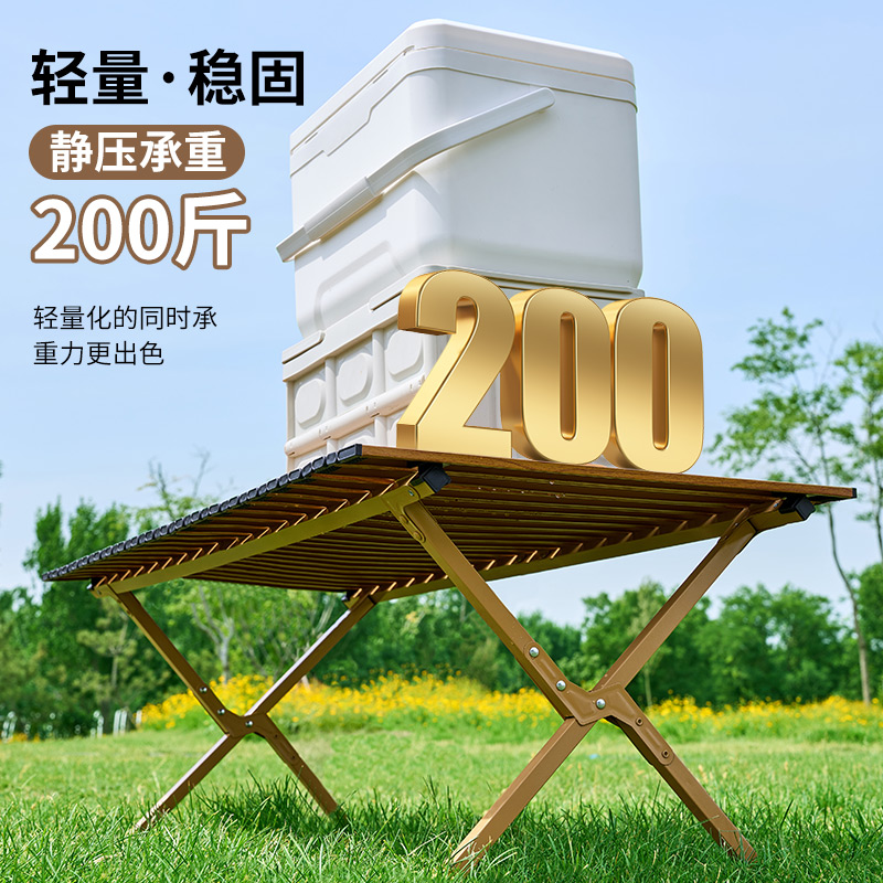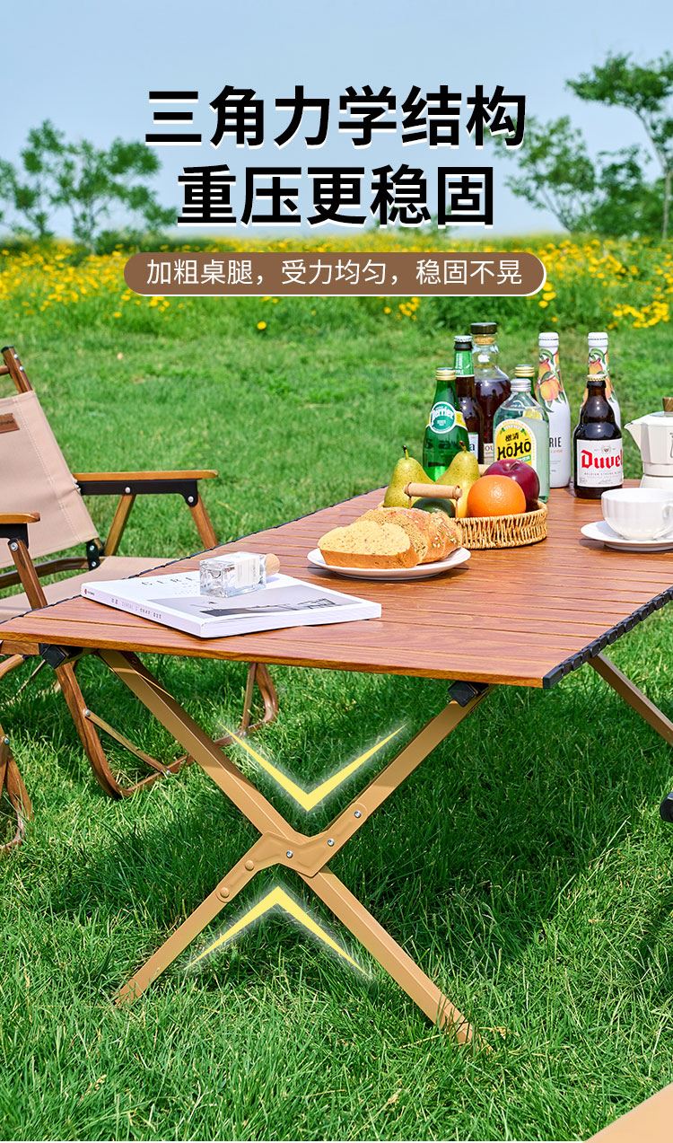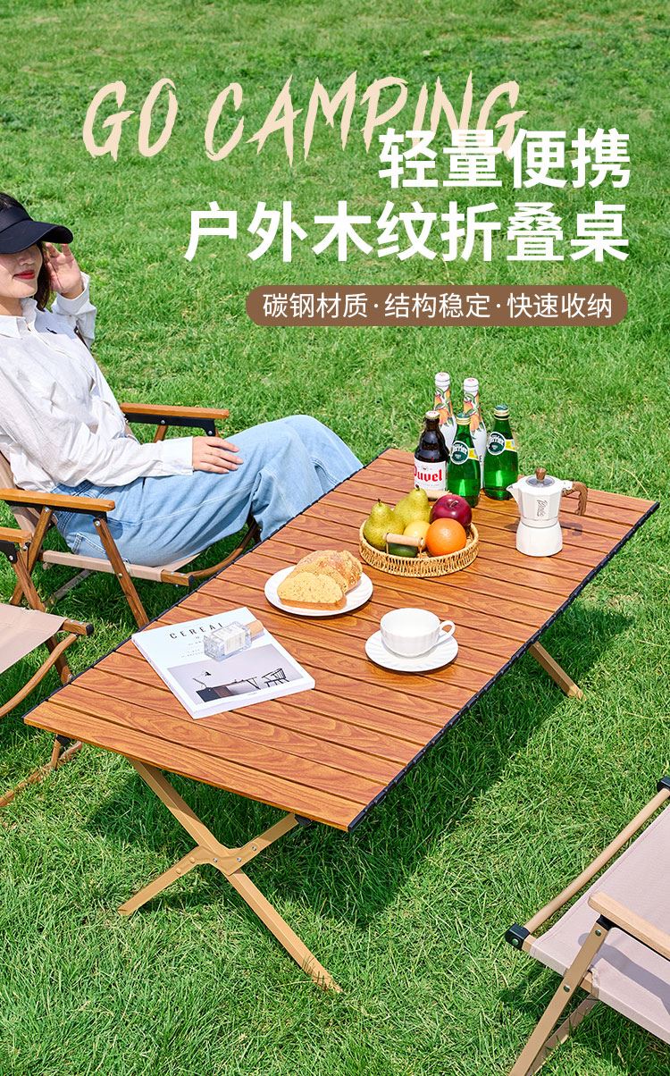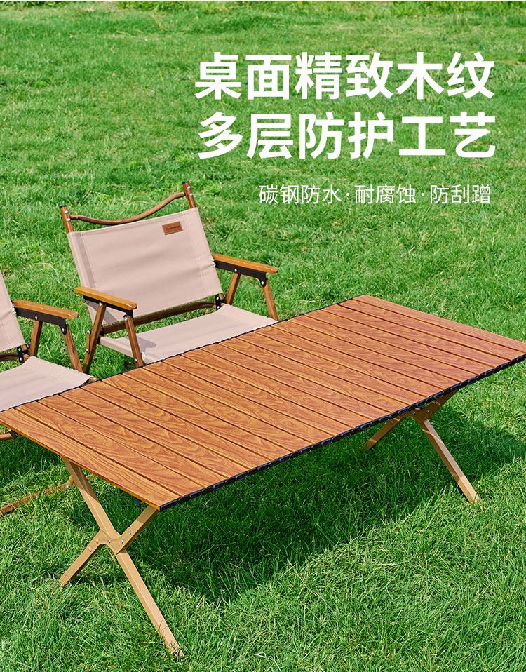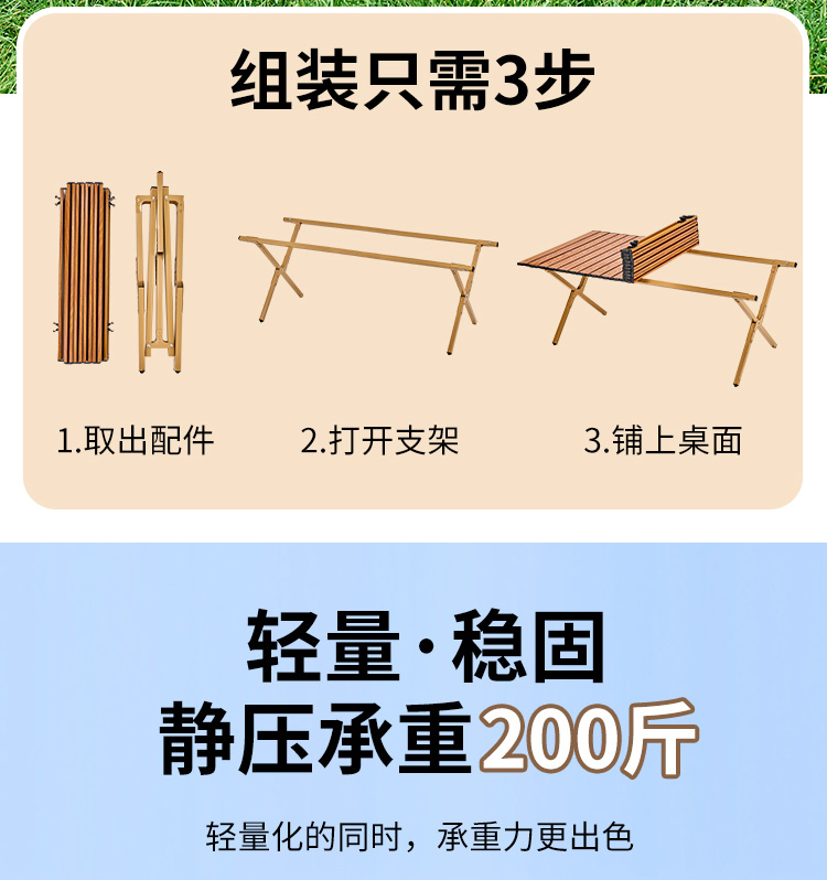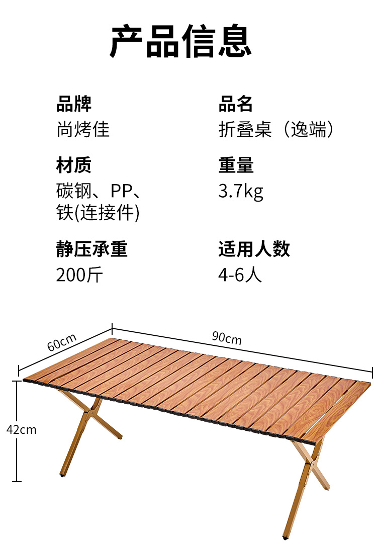 材质碳钢、PP、铁(连接件) 静压承重200斤 重量3.7kg 适用人数4-6人 结构稳固、宽大桌面、仿木纹桌面、轻量便携、快速收纳、清洁方便、 精选优质碳钢经久耐用 桌面精致木纹多层防护工艺 碳钢防水·耐腐蚀·防刮蹭
