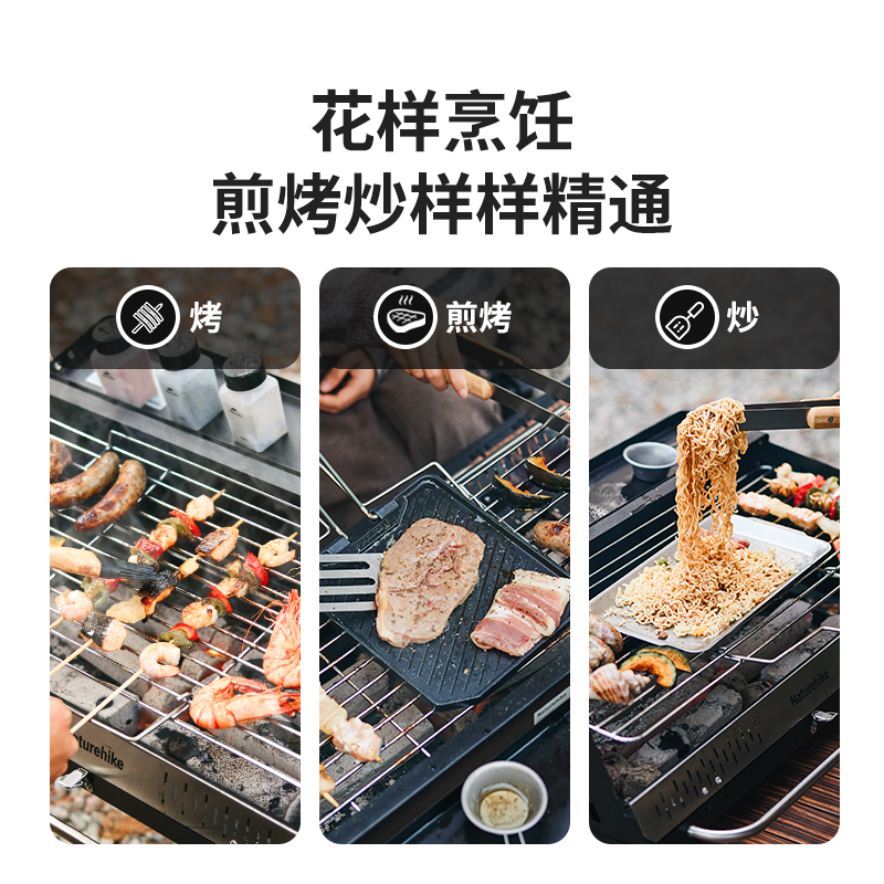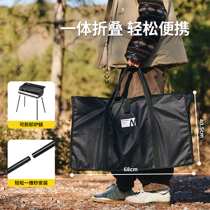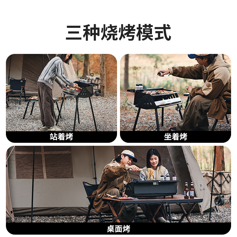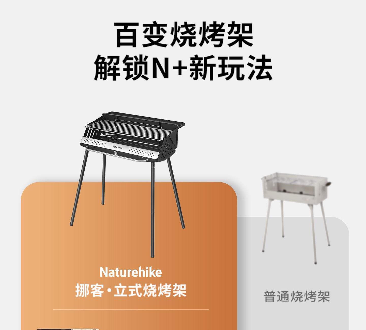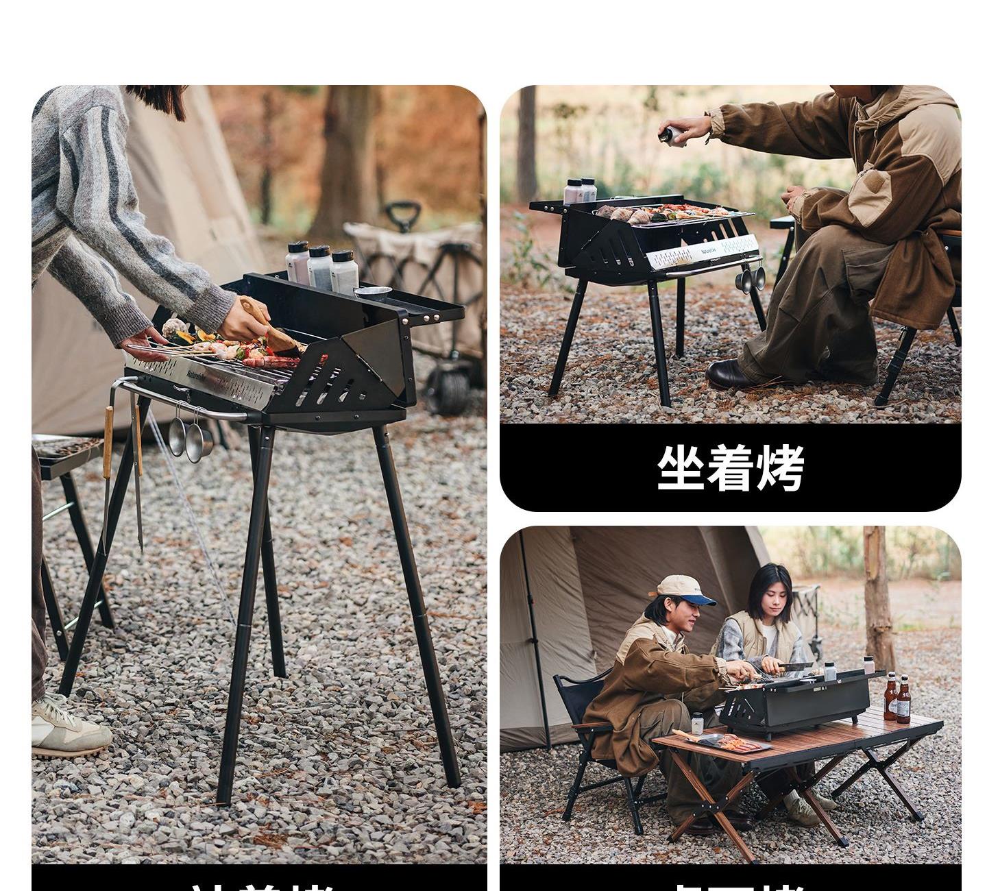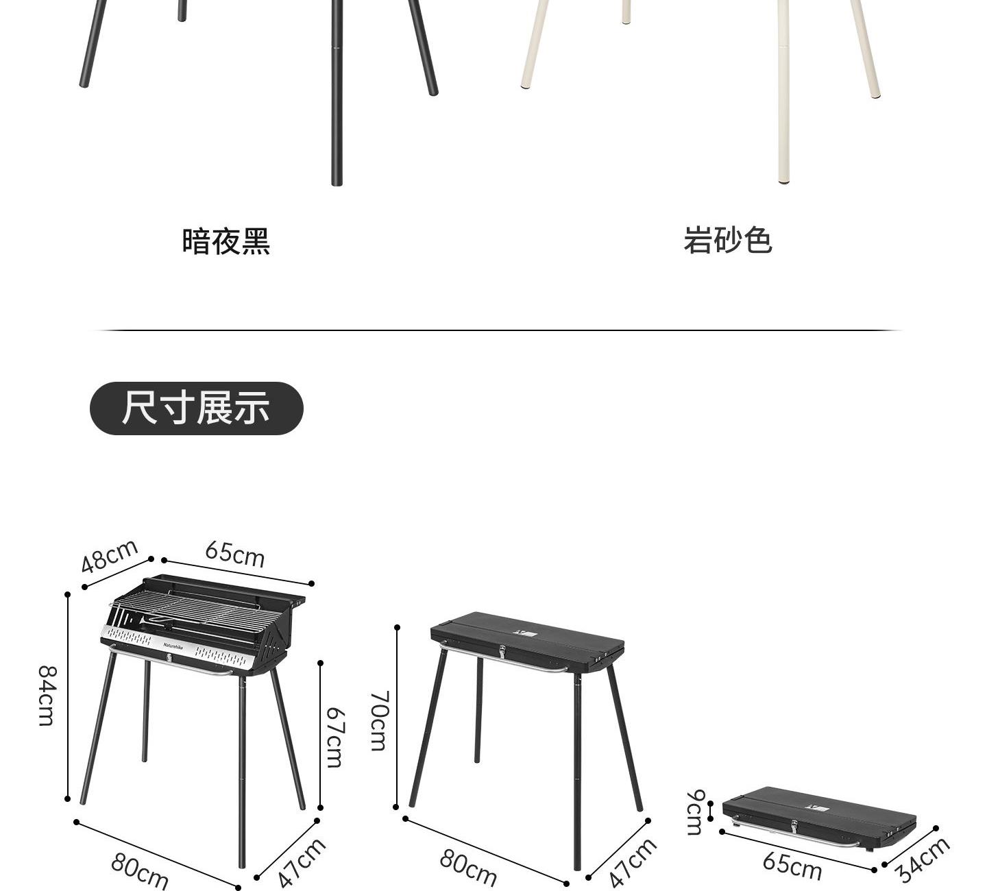 Naturehike CNK2300015 墨烟立式烧烤架 尺寸:80*48*84cm重量:约6.7kg 颜色:暗夜黑、岩砂色 材质:冷轧板、不锈钢、搪瓷 产品特点: 烧烤架新升级,解锁N+新玩法 三种烧烤模式,站着坐着都能烤。 轻松开合,携带更方便。 独立搪瓷炭盆一擦即净易清灰。 加粗八角形炉腿扎实稳固不晃。