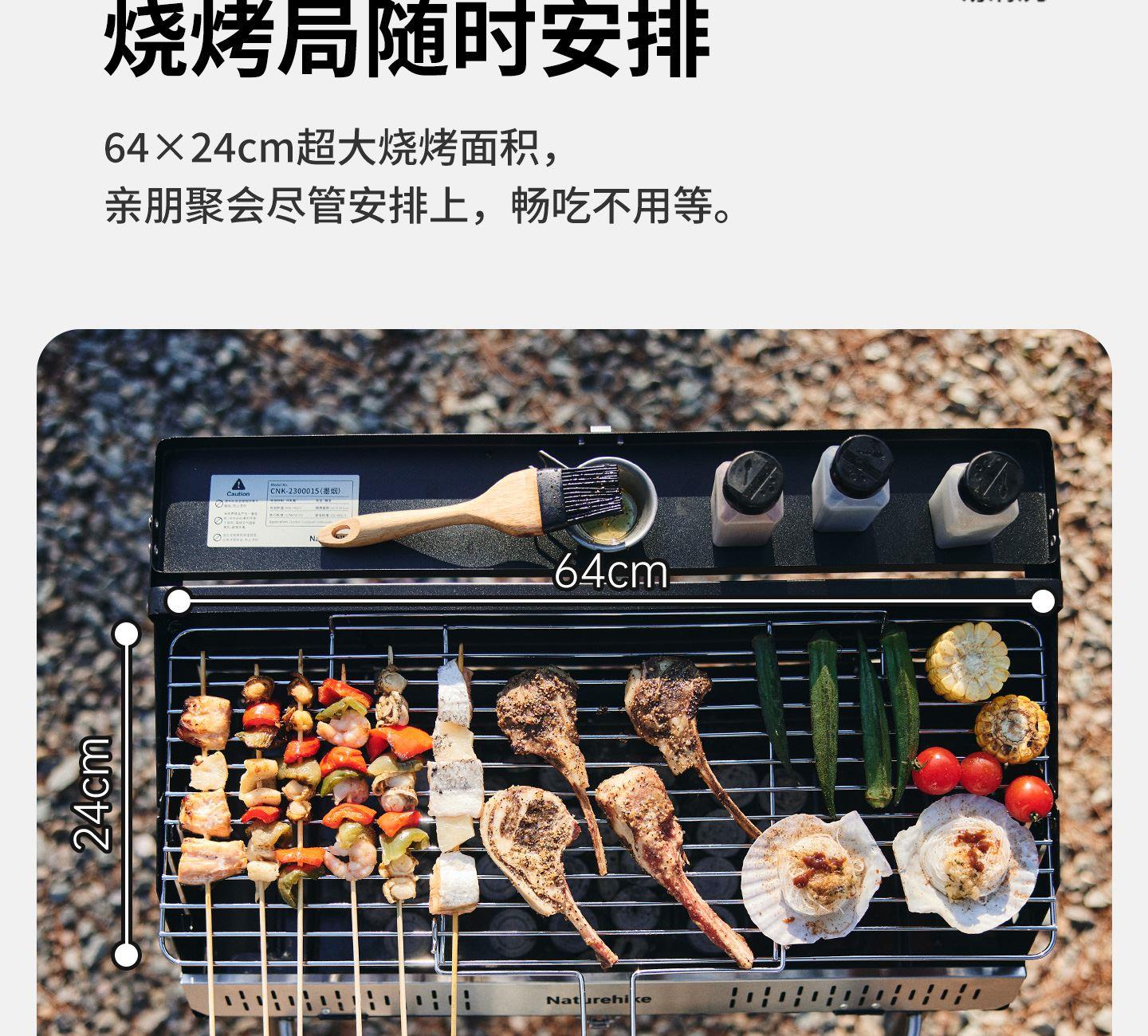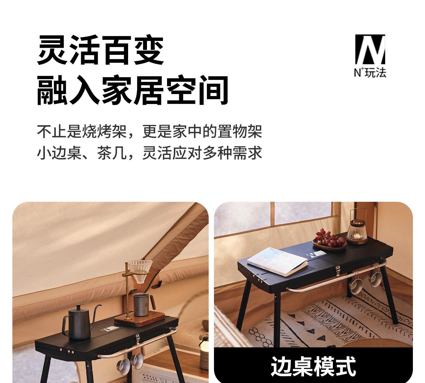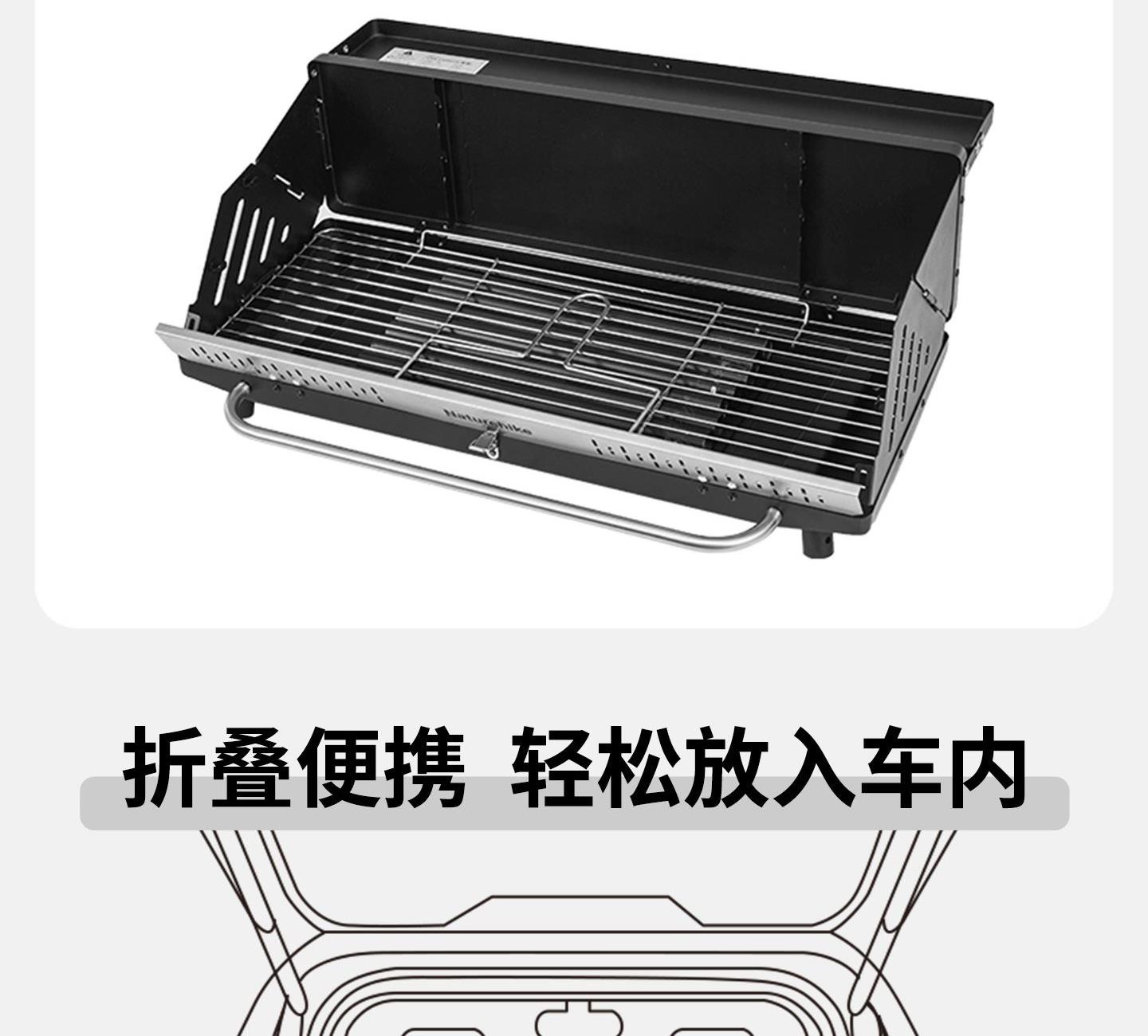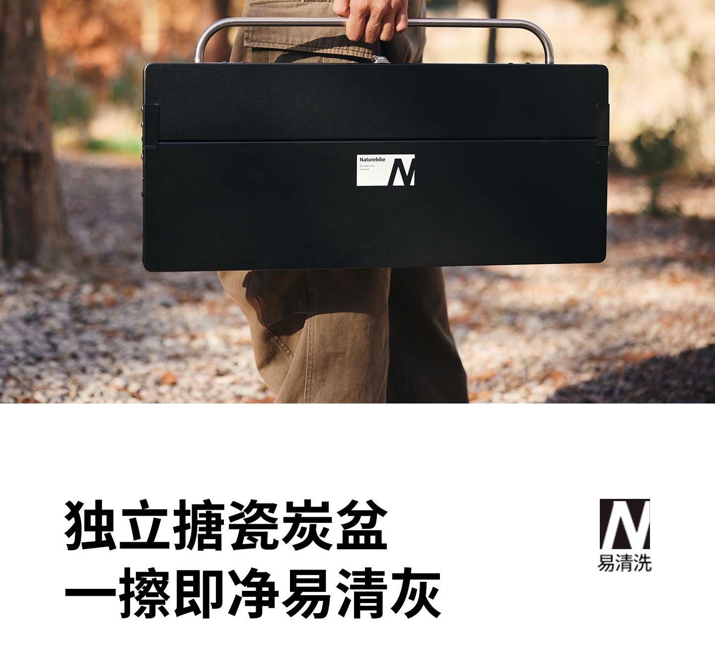 Naturehike CNK2300015 墨烟立式烧烤架 尺寸:80*48*84cm重量:约6.7kg 颜色:暗夜黑、岩砂色 材质:冷轧板、不锈钢、搪瓷 产品特点: 烧烤架新升级,解锁N+新玩法 三种烧烤模式,站着坐着都能烤。 轻松开合,携带更方便。 独立搪瓷炭盆一擦即净易清灰。 加粗八角形炉腿扎实稳固不晃。