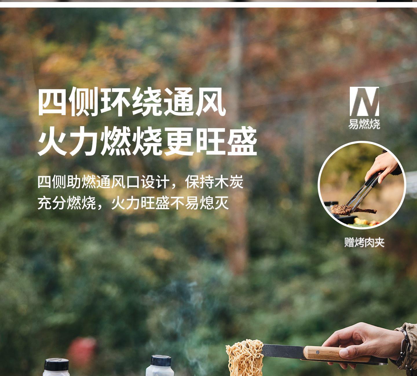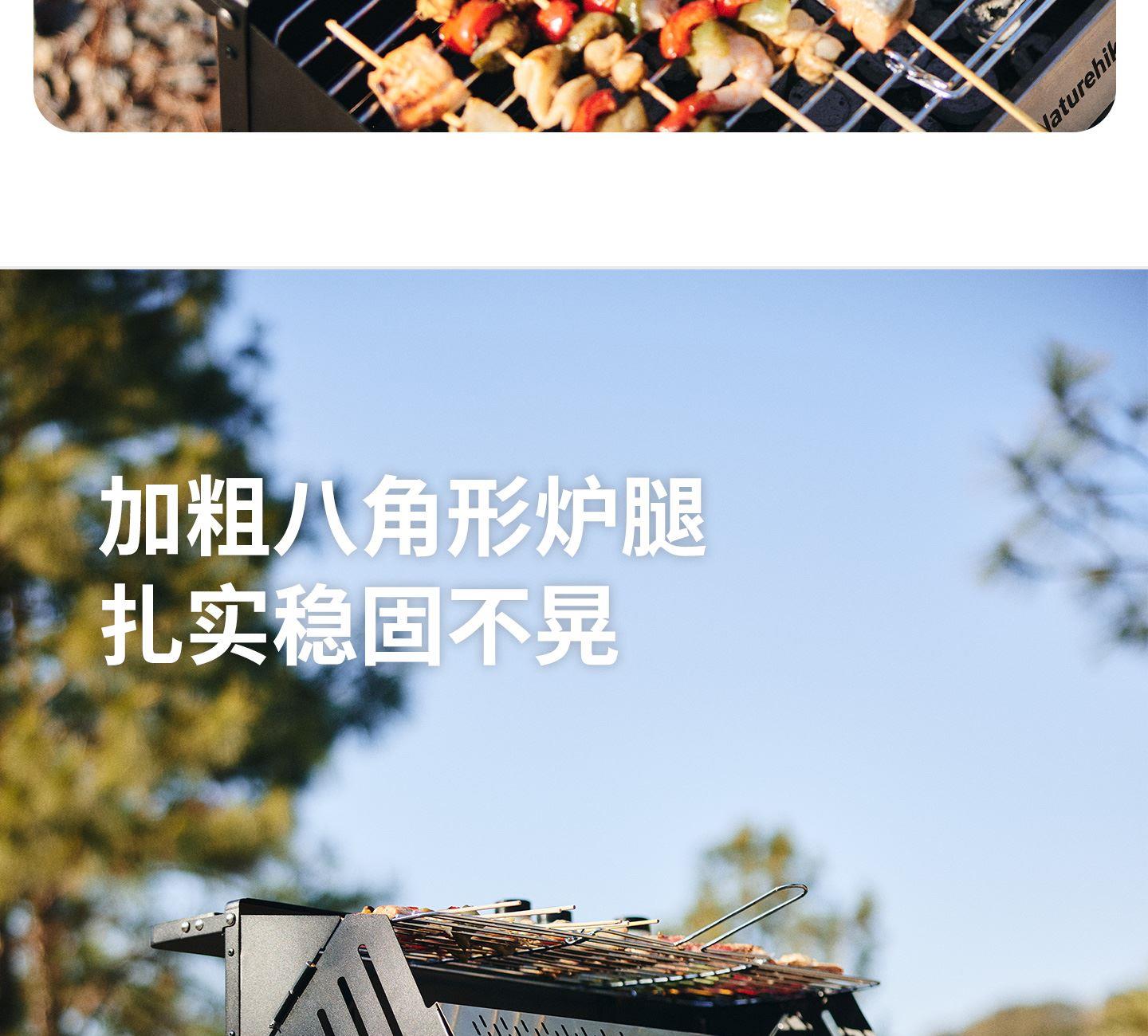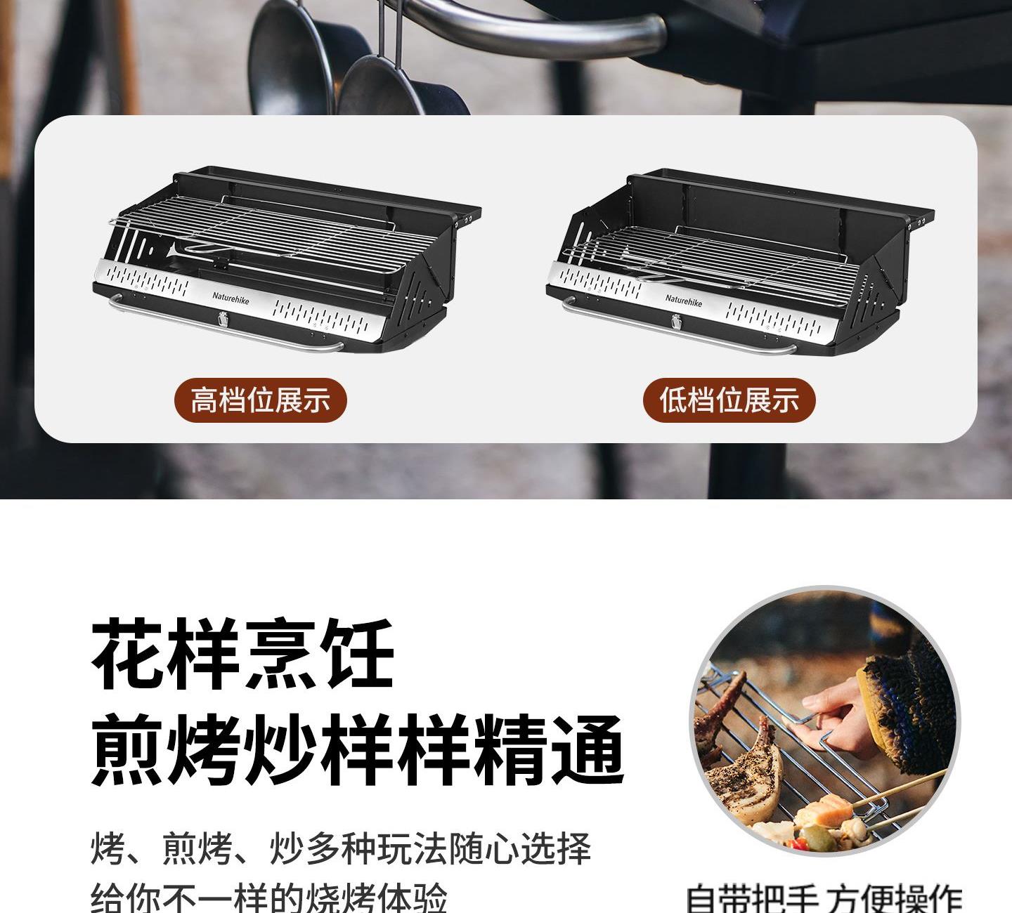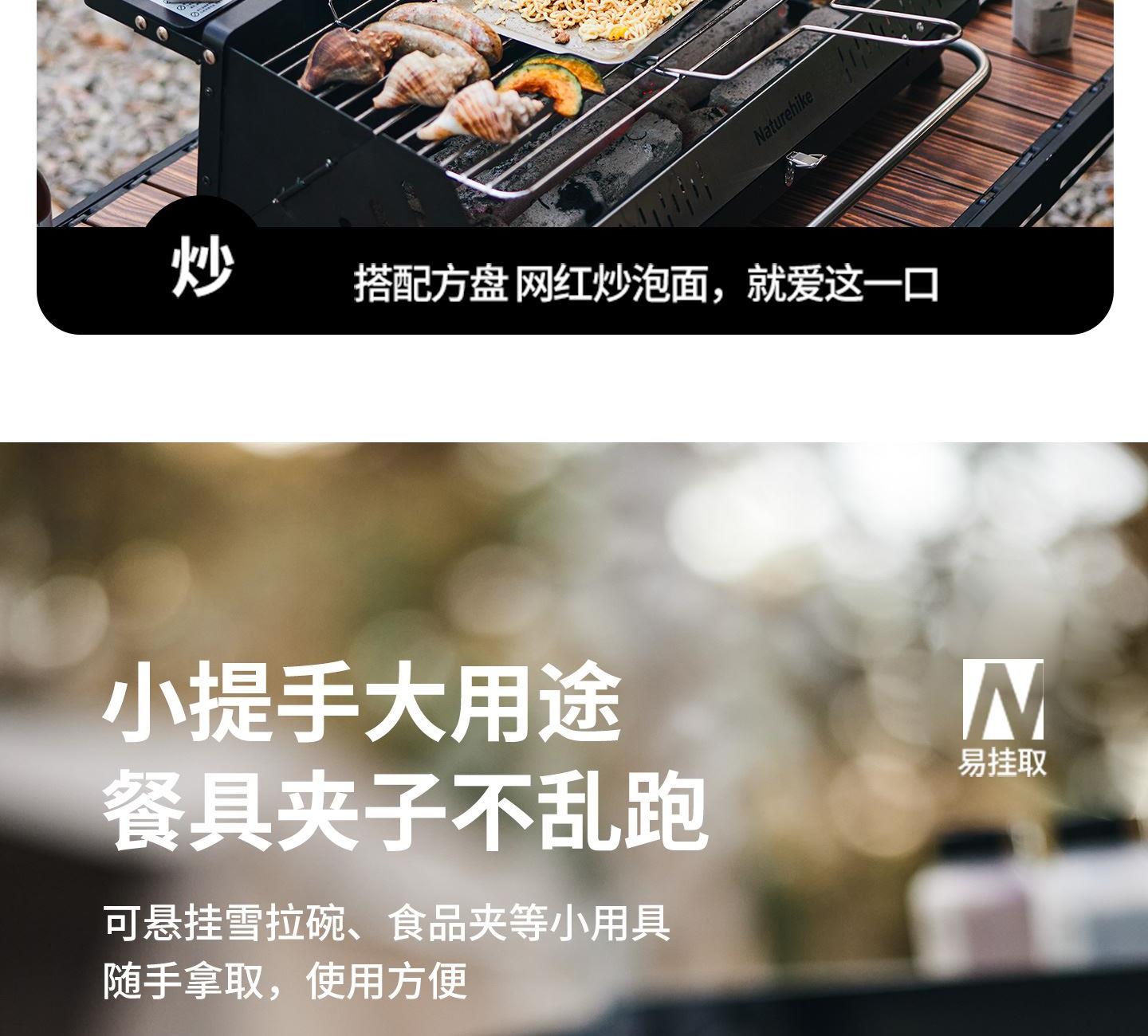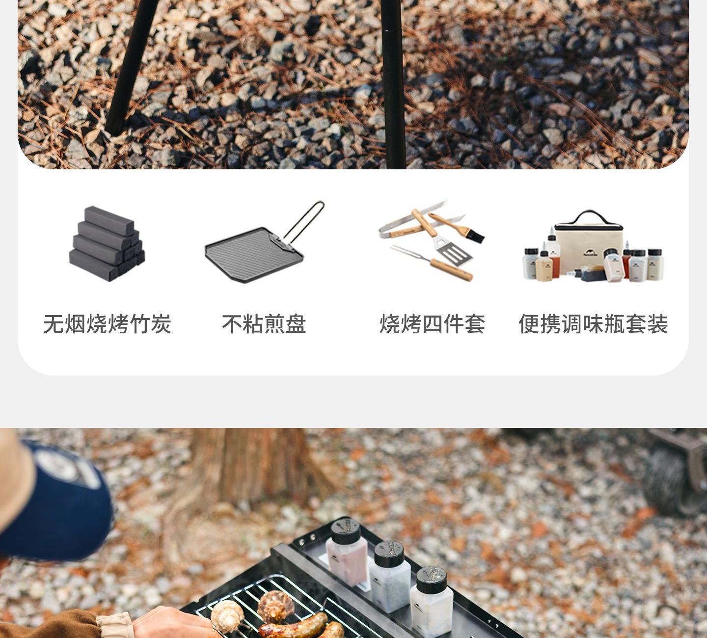 Naturehike CNK2300015 墨烟立式烧烤架 尺寸:80*48*84cm重量:约6.7kg 颜色:暗夜黑、岩砂色 材质:冷轧板、不锈钢、搪瓷 产品特点: 烧烤架新升级,解锁N+新玩法 三种烧烤模式,站着坐着都能烤。 轻松开合,携带更方便。 独立搪瓷炭盆一擦即净易清灰。 加粗八角形炉腿扎实稳固不晃。