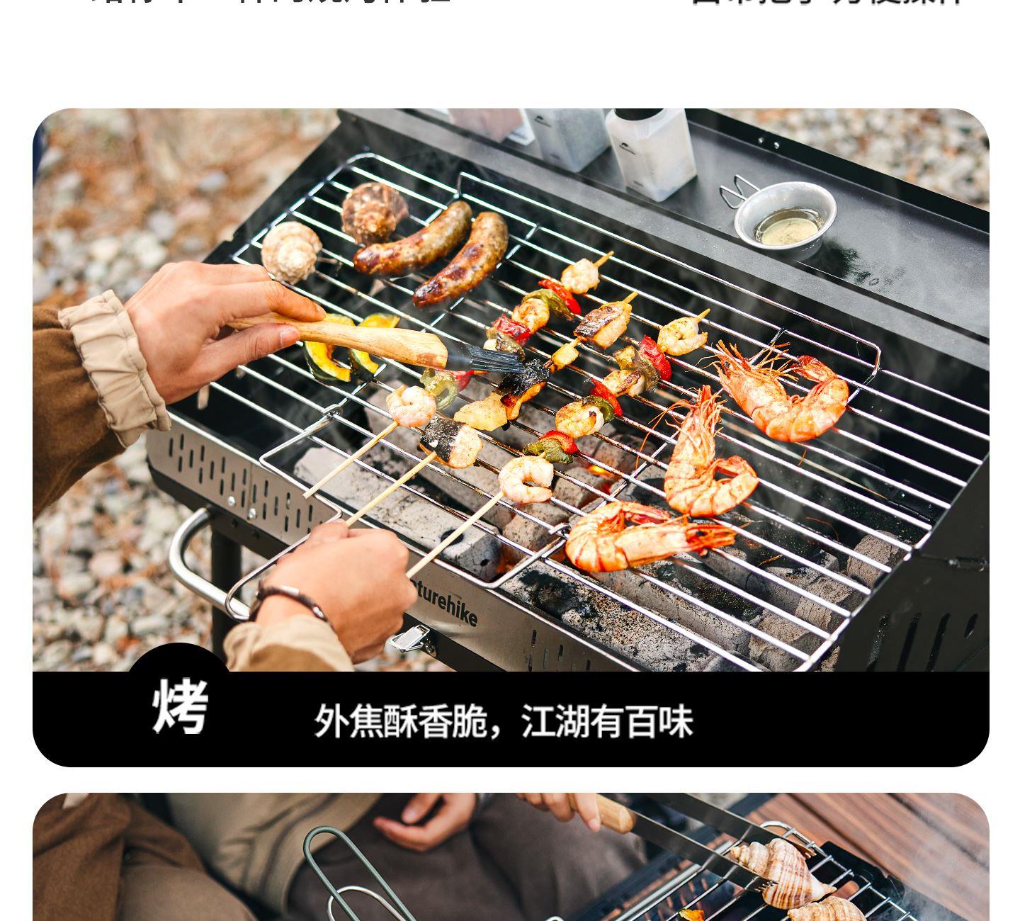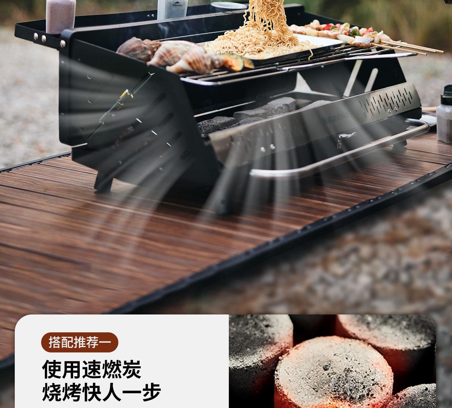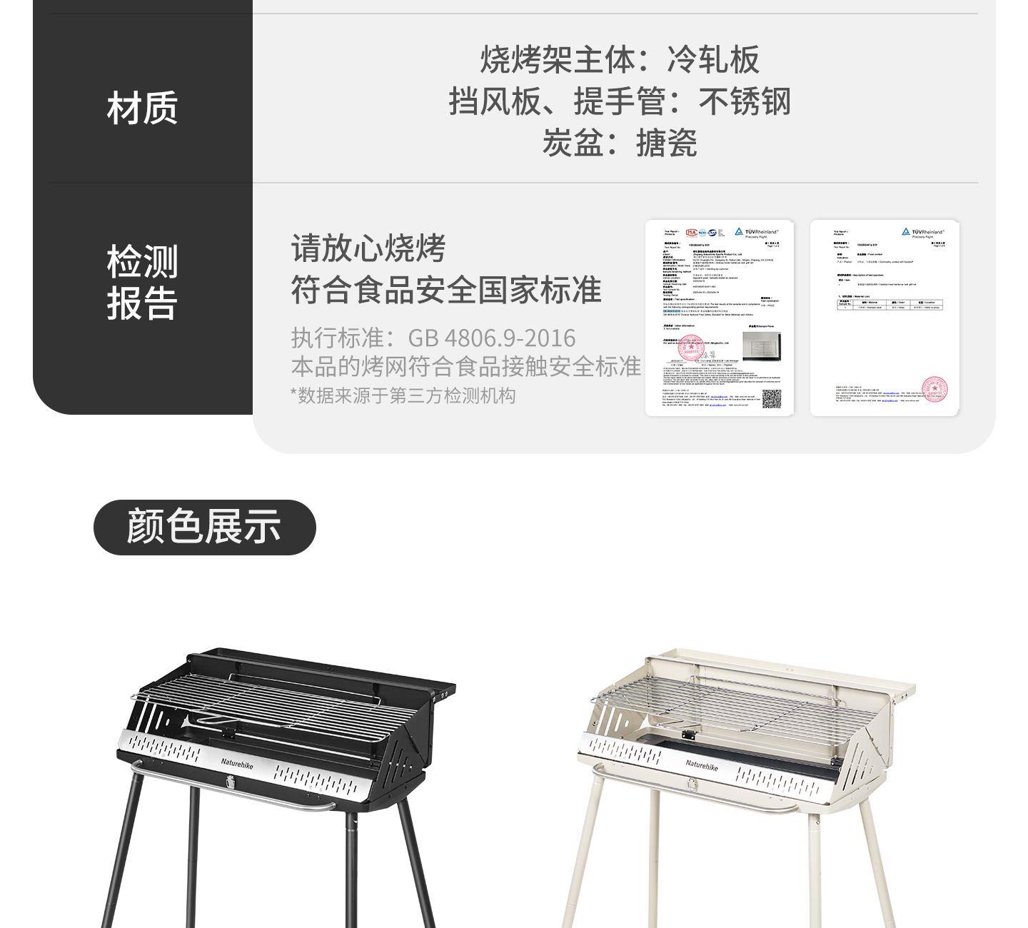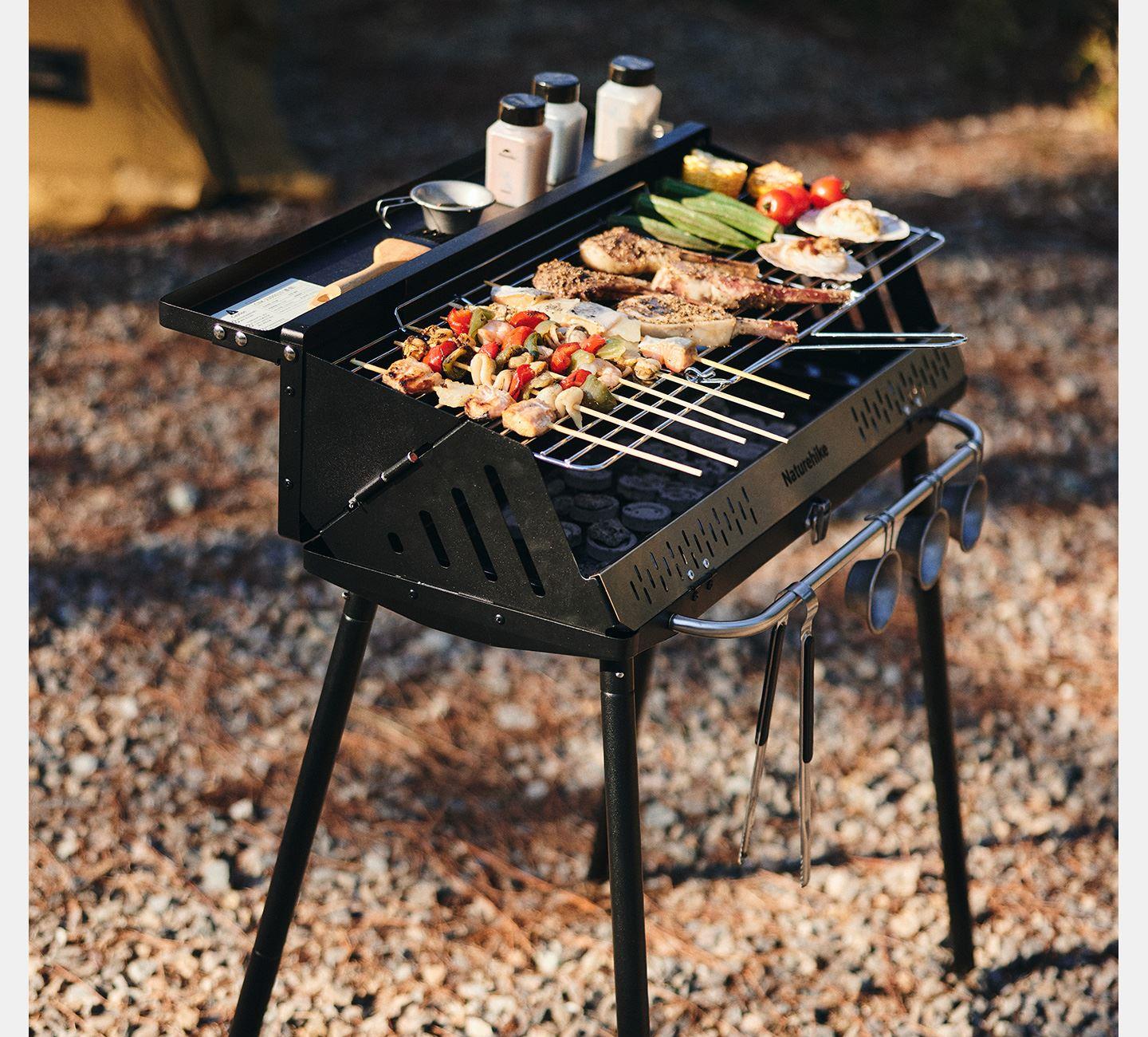 Naturehike CNK2300015 墨烟立式烧烤架 尺寸:80*48*84cm重量:约6.7kg 颜色:暗夜黑、岩砂色 材质:冷轧板、不锈钢、搪瓷 产品特点: 烧烤架新升级,解锁N+新玩法 三种烧烤模式,站着坐着都能烤。 轻松开合,携带更方便。 独立搪瓷炭盆一擦即净易清灰。 加粗八角形炉腿扎实稳固不晃。