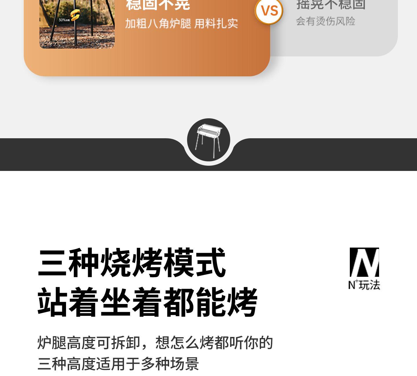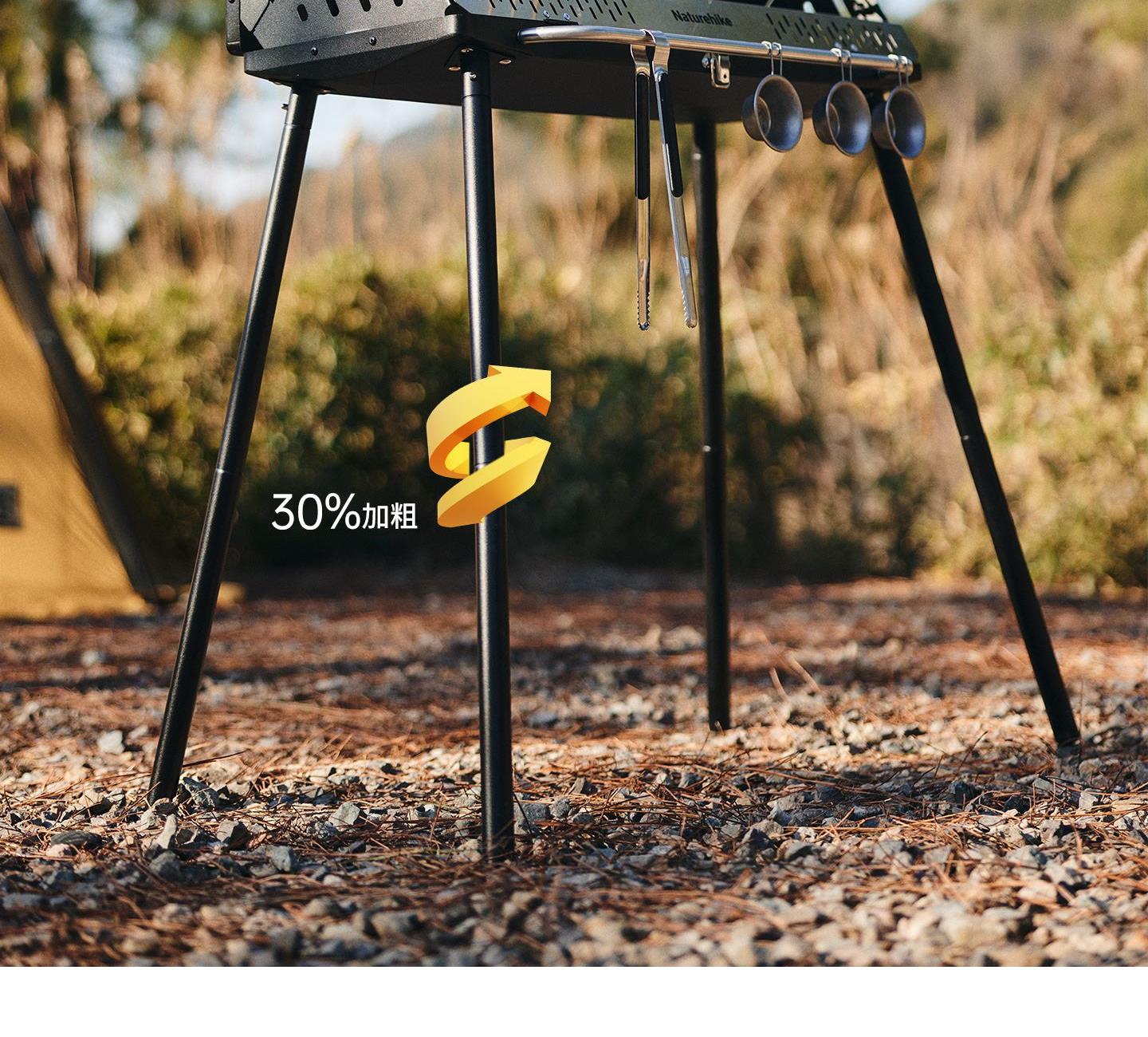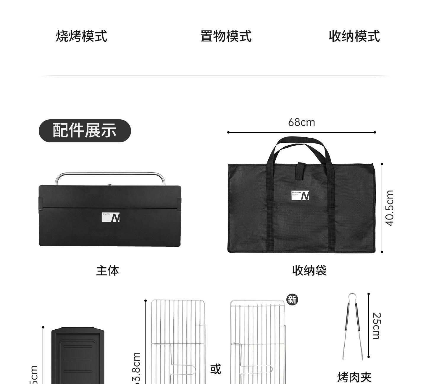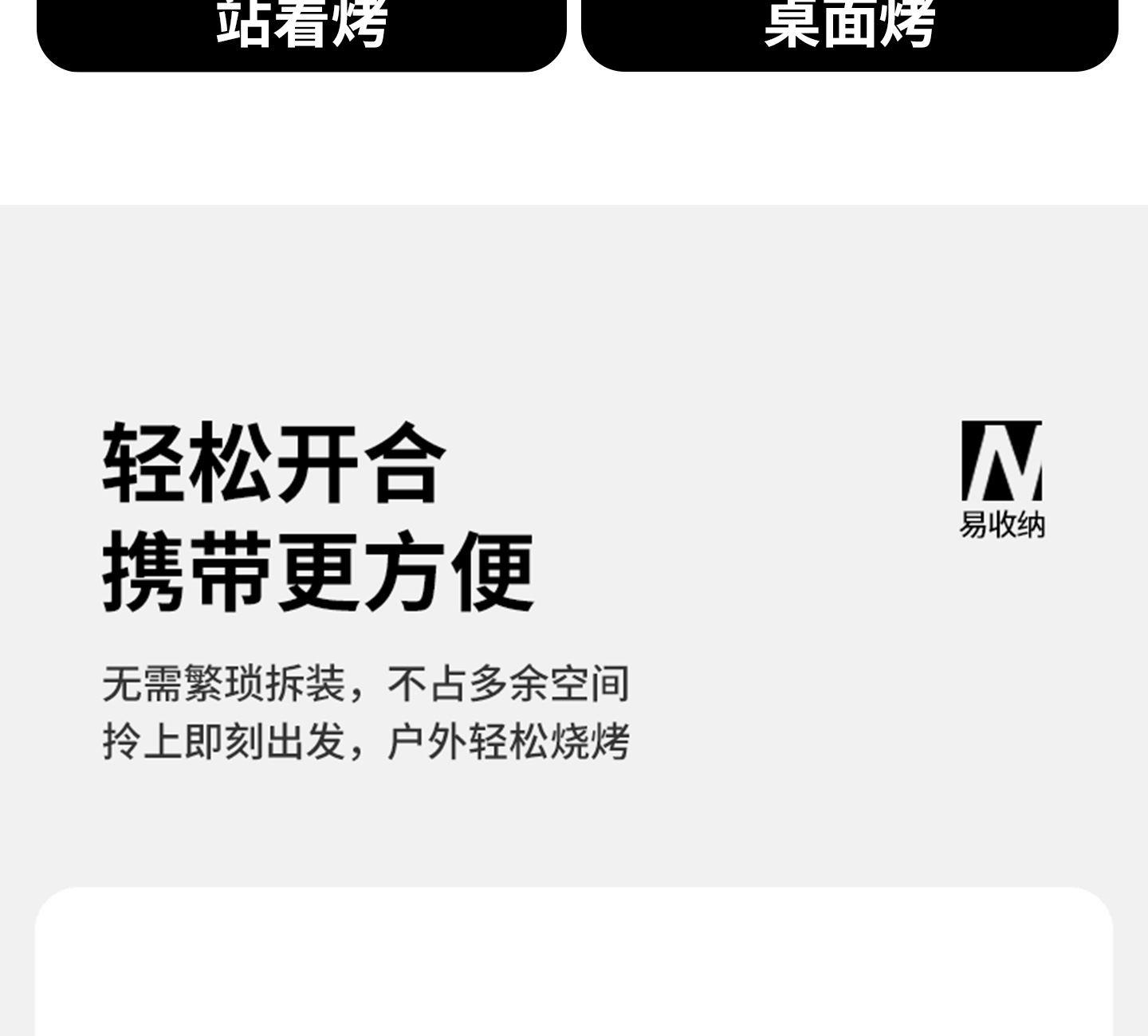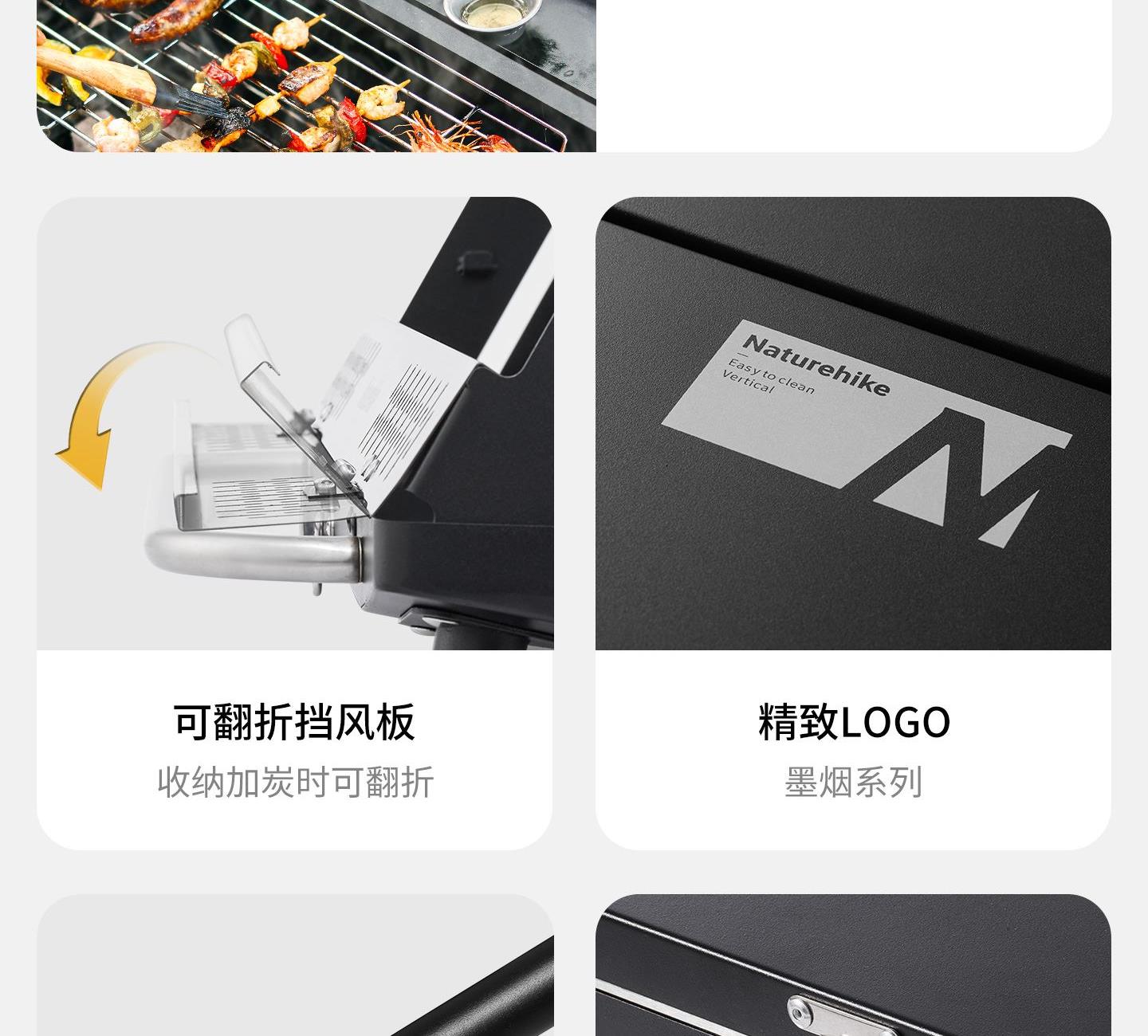 Naturehike CNK2300015 墨烟立式烧烤架 尺寸:80*48*84cm重量:约6.7kg 颜色:暗夜黑、岩砂色 材质:冷轧板、不锈钢、搪瓷 产品特点: 烧烤架新升级,解锁N+新玩法 三种烧烤模式,站着坐着都能烤。 轻松开合,携带更方便。 独立搪瓷炭盆一擦即净易清灰。 加粗八角形炉腿扎实稳固不晃。