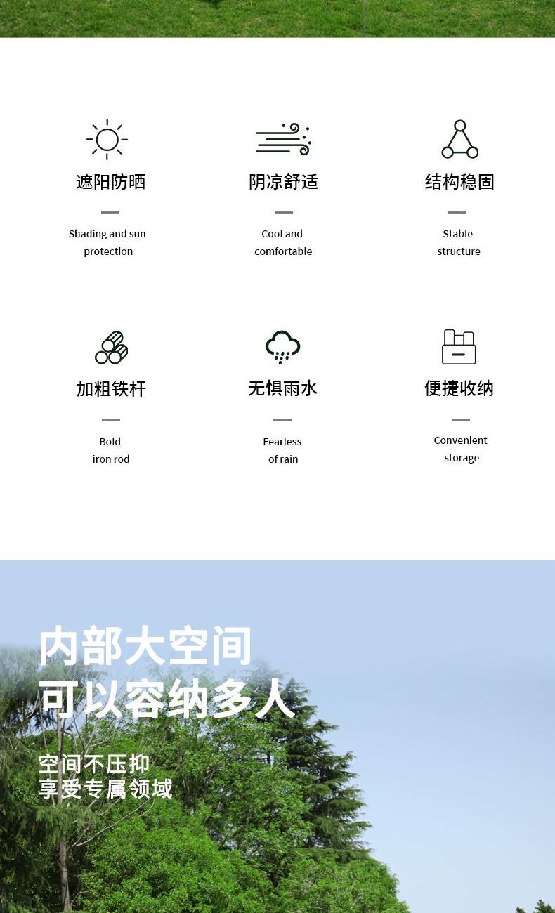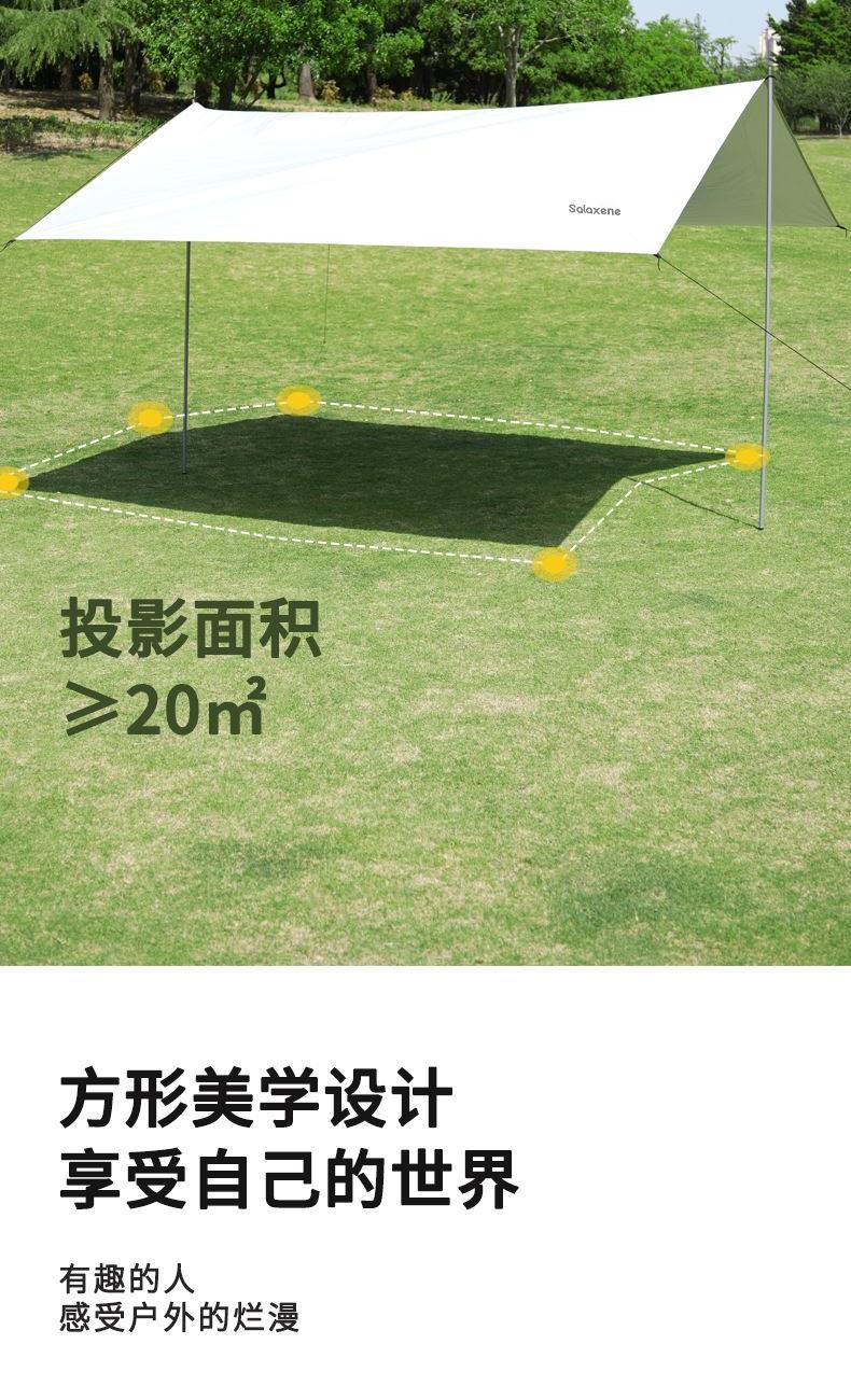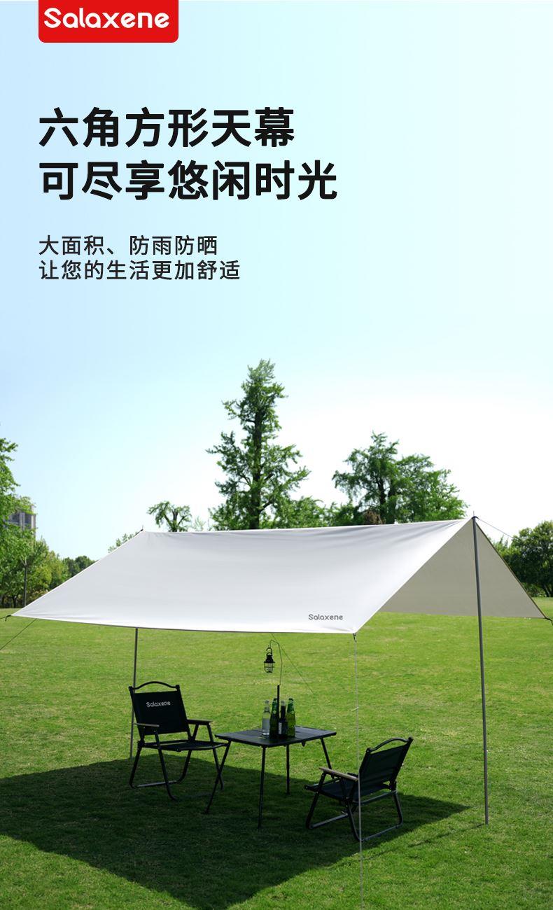 1、六角稳固、舒适露营; 2、从容应对户外多变天气; 3、大空间更舒适、可容纳多人; 4、配备收纳包、给您更好的户外体验; 5、轻松阻挡紫外线、大面积遮阳;