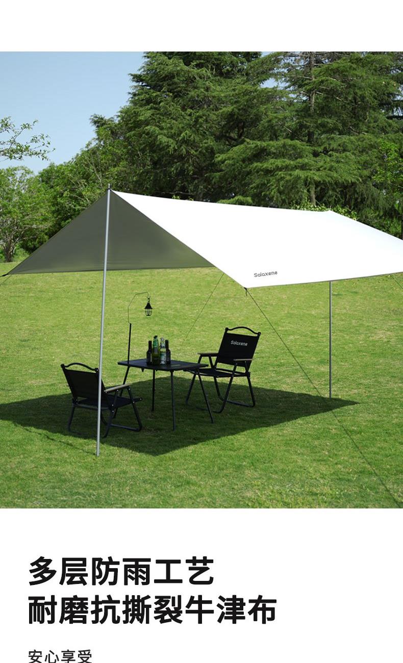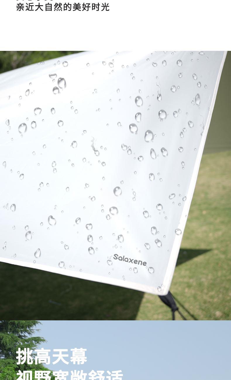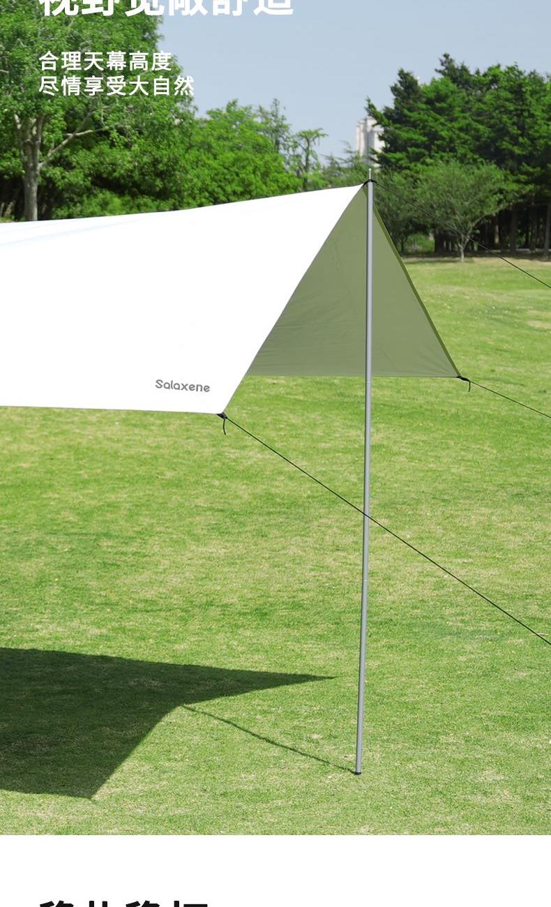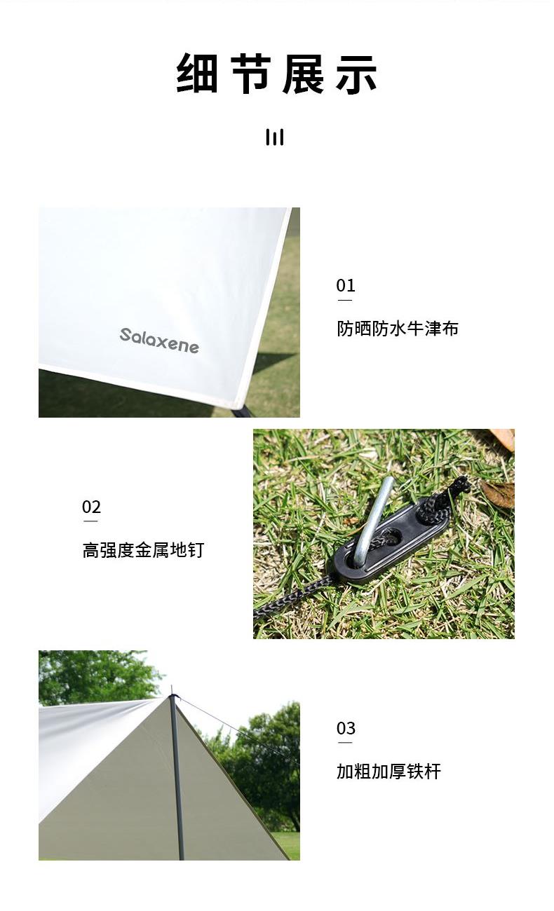1、六角稳固、舒适露营; 2、从容应对户外多变天气; 3、大空间更舒适、可容纳多人; 4、配备收纳包、给您更好的户外体验; 5、轻松阻挡紫外线、大面积遮阳;