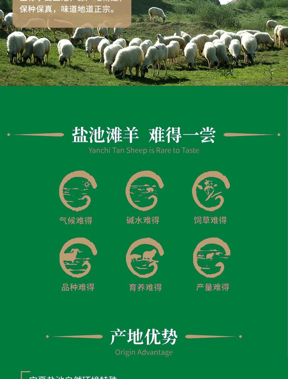 配置: 羊前腿 1350g 羊腱子 500g 羊蝎子 500g*2 一方水土,养育一方特色滩羊盐池滩羊食百草 “吃中草药 (甘草、苦豆子)喝弱碱水"长大的羊。 中和体内酸性,使得肉质鲜嫩细腻,脂肪分布均匀原切滩羊羊肉不腥不膻。 宁夏盐池县 自然环境优异,气候冬长夏短 日照充足, 土地呈盐碱化,使得水源呈弱碱性, 盐池草原呈半沙漠化,其中含名贵中草药约110种左右 新鲜屠宰,保证肉质鲜美!
