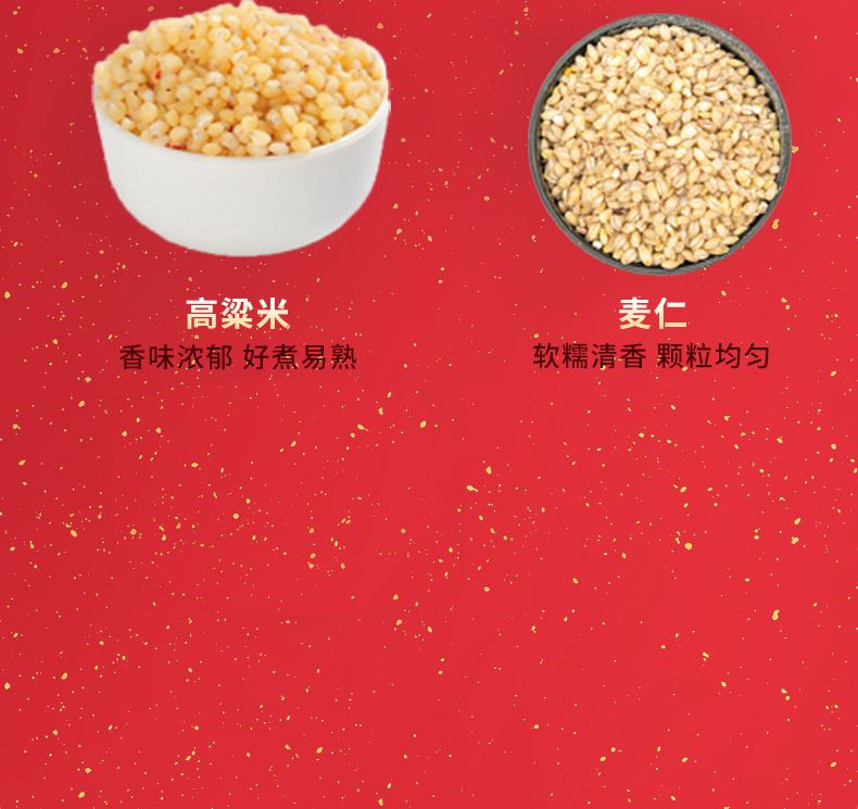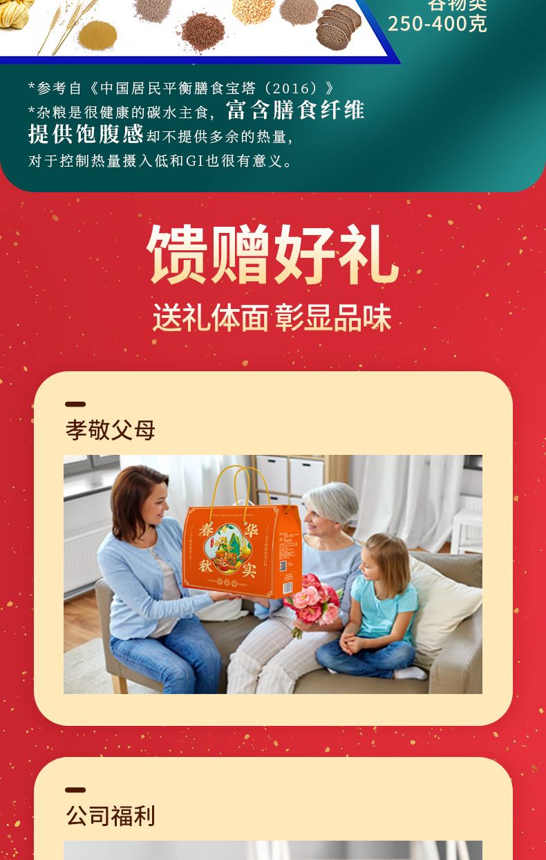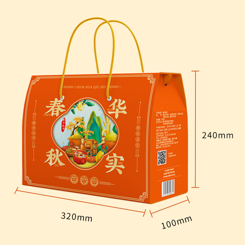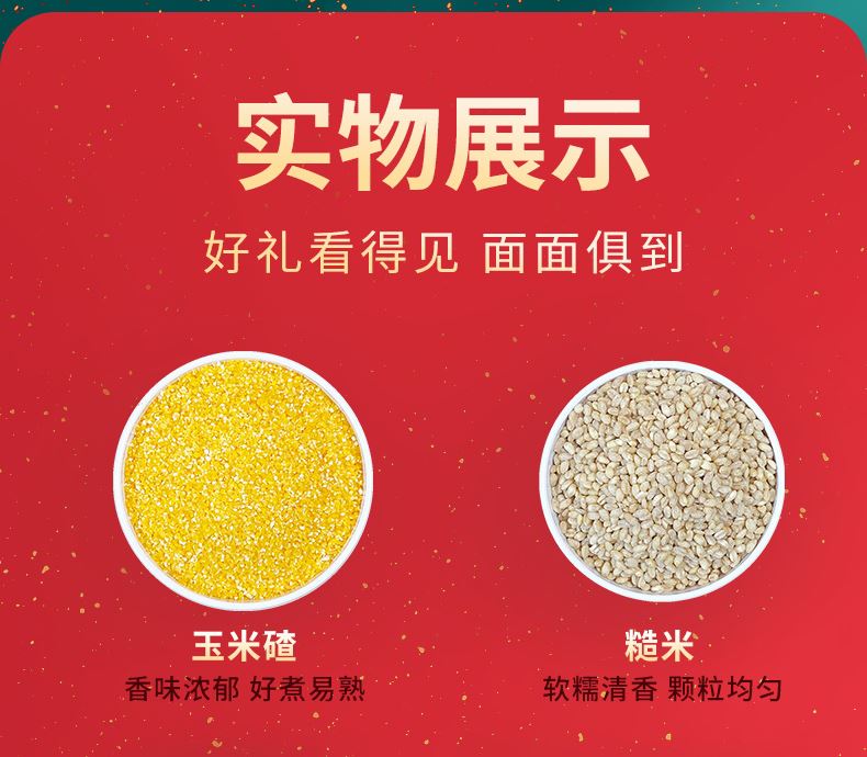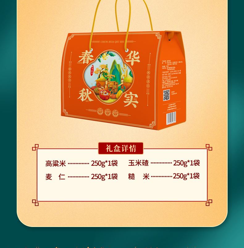 礼盒:春华秋实 条码:6972761600864 产品规格配置:高粱米、麦 仁玉米碴、糙 米(250g*4袋) 盒尺寸:32*24*10cm 净含量:1000g 箱重量:15.5kg 箱体积:0.107方