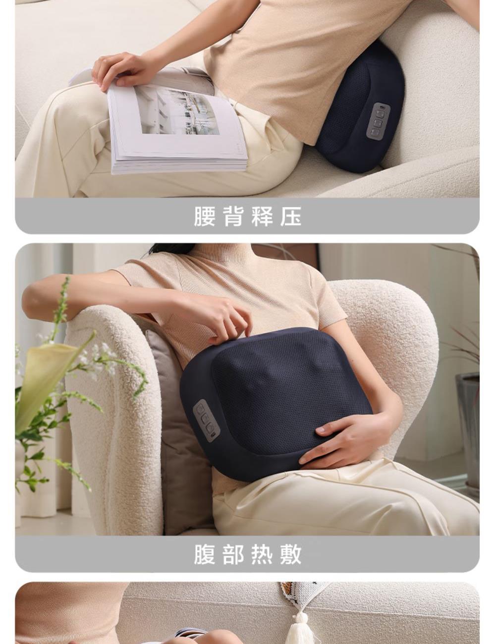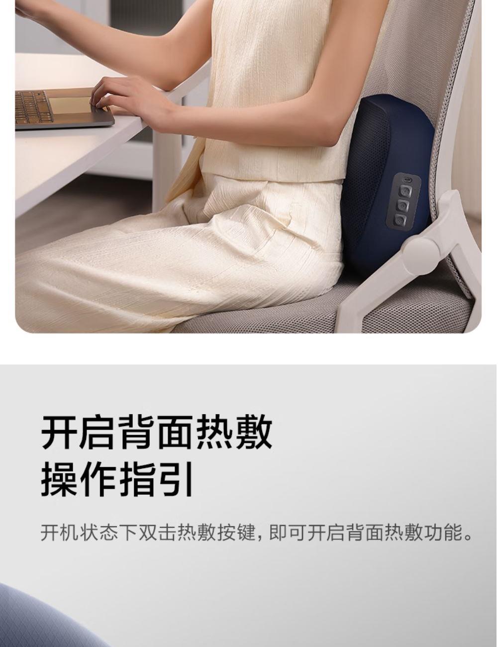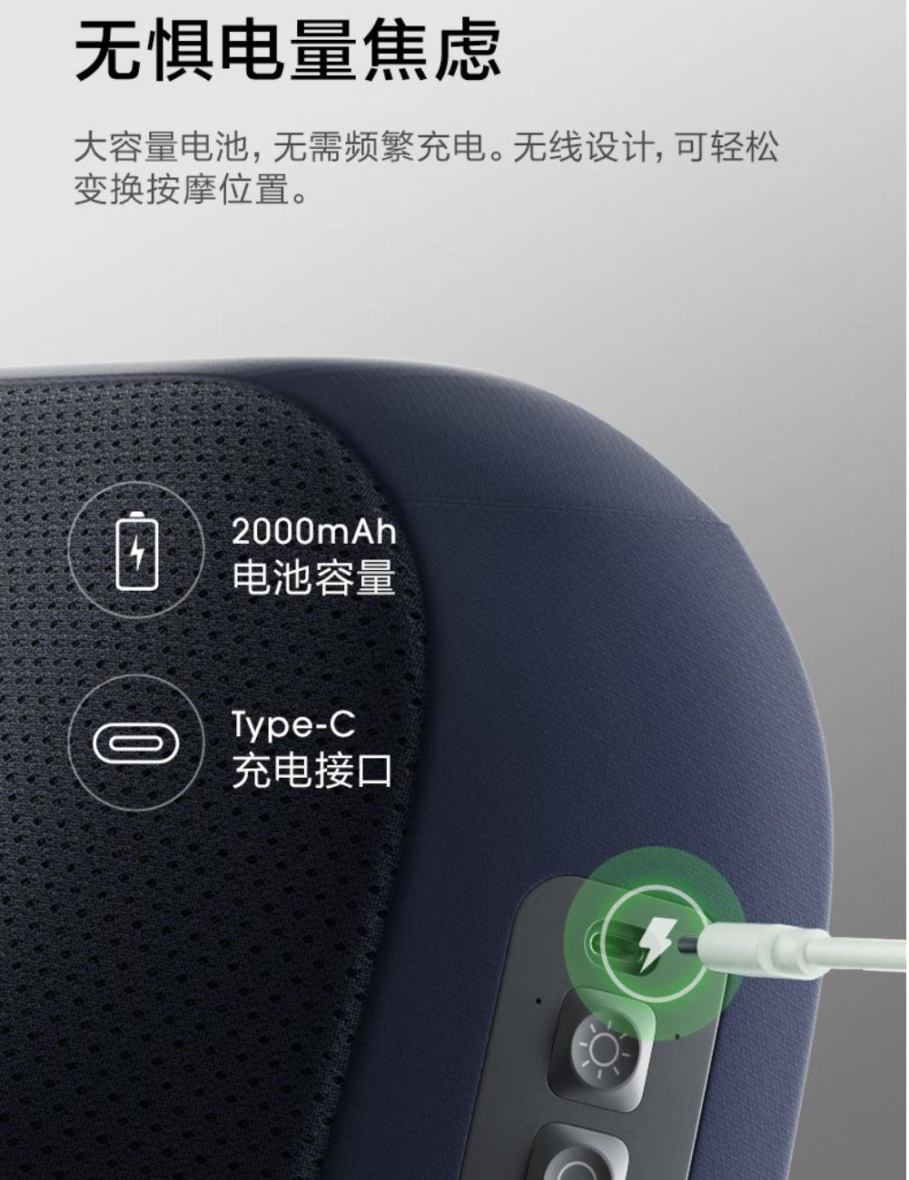 操控方式:按键式 功能:无线便携,多模式按摩 按摩手法:仿人手揉捏 适用部位:腰背部 供电方式:Type-C 适用场景:车用,家用,职场 档位调节:三档调节 额定功率:10W 额定电压:5V 额定输入电流:2A 产品尺寸:长340mm;宽80mm;高300mm 产品净重:1.3kg 产品毛重:1.60kg 默认工作时间:10分钟