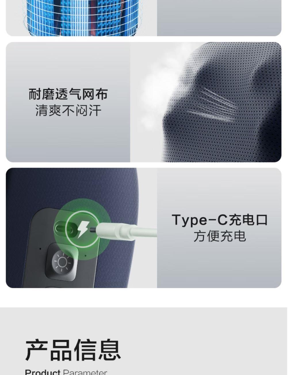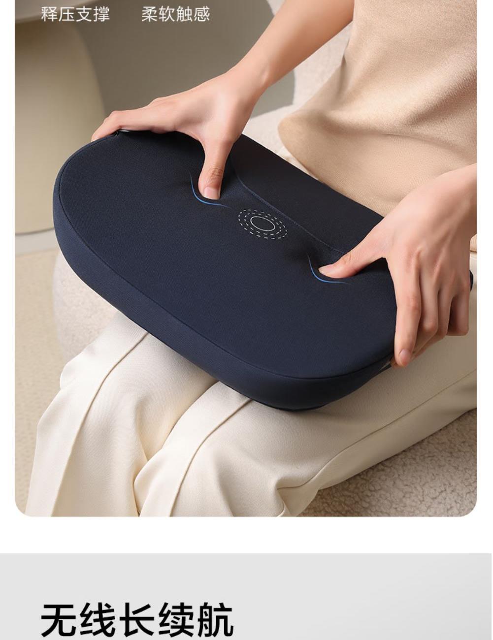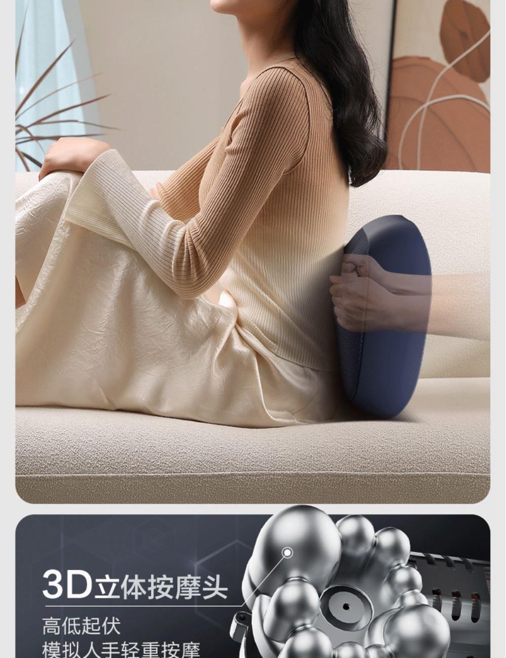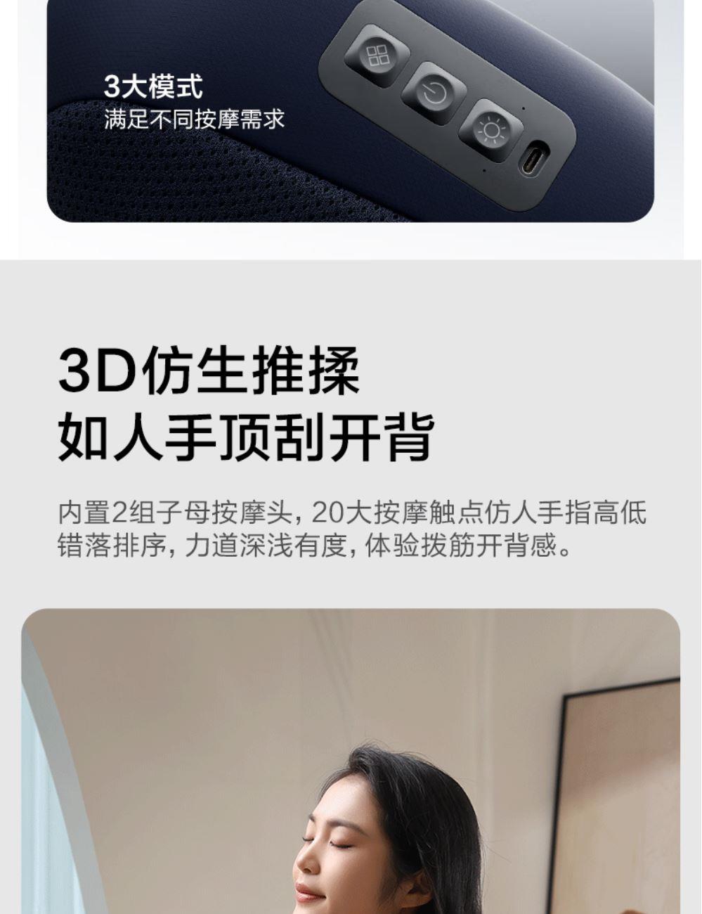 操控方式:按键式 功能:无线便携,多模式按摩 按摩手法:仿人手揉捏 适用部位:腰背部 供电方式:Type-C 适用场景:车用,家用,职场 档位调节:三档调节 额定功率:10W 额定电压:5V 额定输入电流:2A 产品尺寸:长340mm;宽80mm;高300mm 产品净重:1.3kg 产品毛重:1.60kg 默认工作时间:10分钟