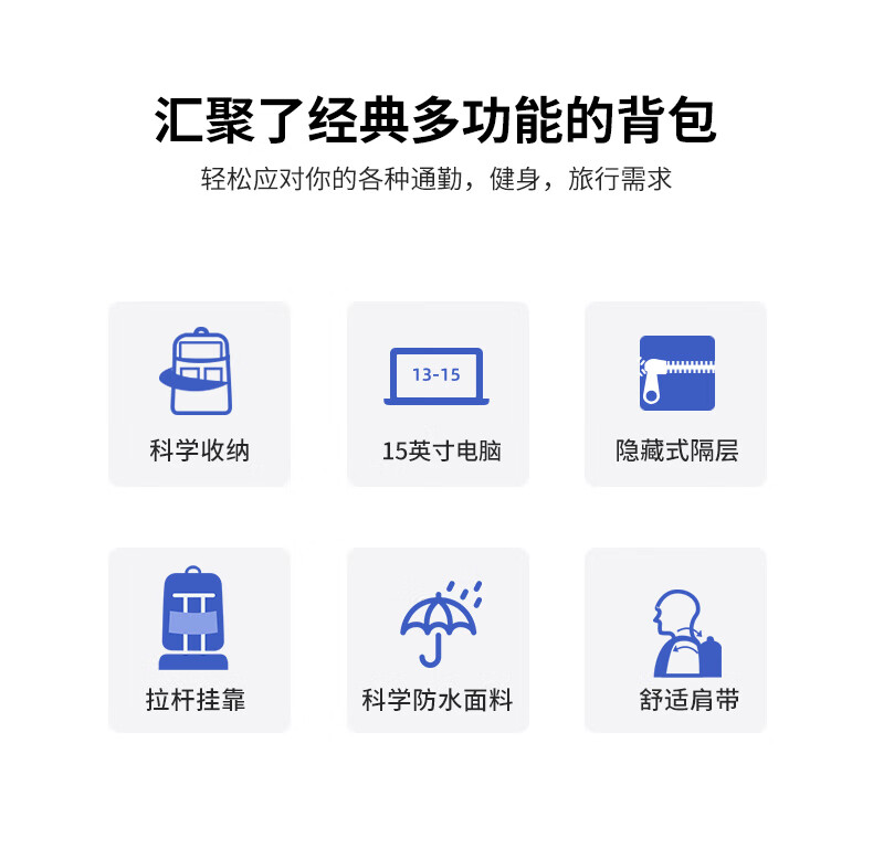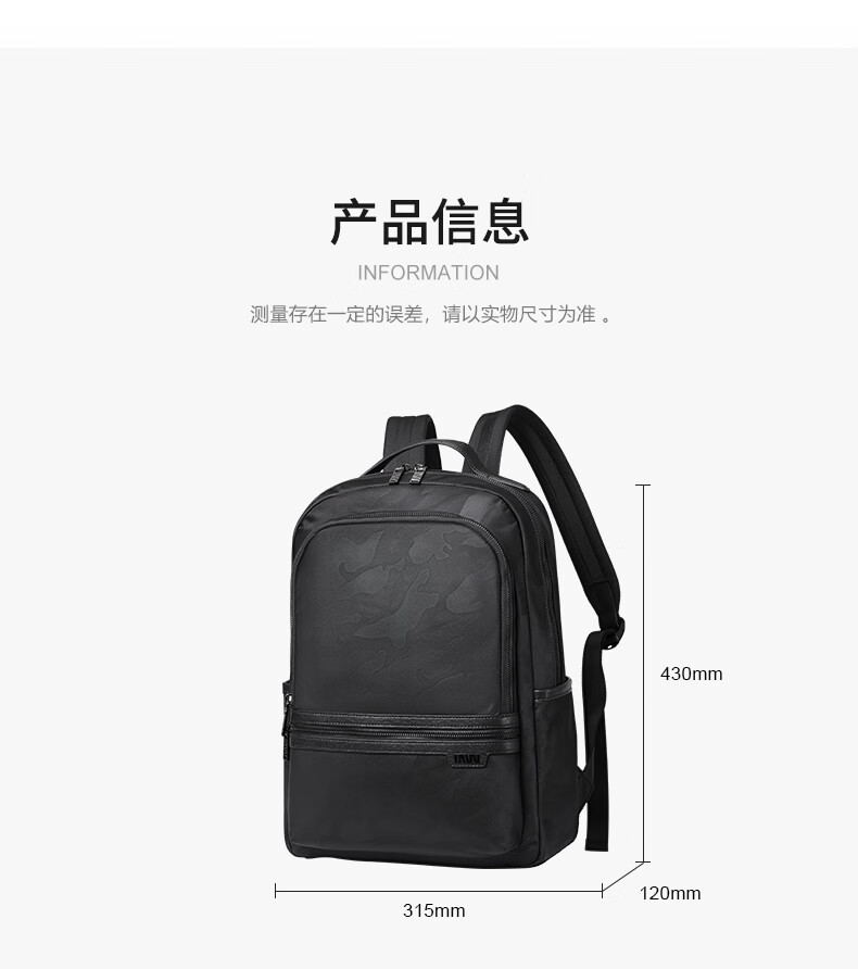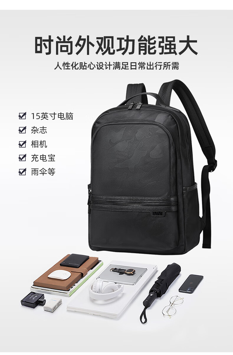 类别:背包 外部材质:织物 闭合方式:翻盖式 规格:300x140x430mm 容纳电脑尺寸:15英寸 风格:潮流风 街头风 携包出行,旅途无忧,立体挺括包型兼顾时尚外观与功能性,轻松驾驭多种都市出行场景 内里大容装载,多层收纳空间,满足多样收纳需求,轻装出行,采用高密度织物面料,防刮耐用,防泼贱,轻松应对泼水