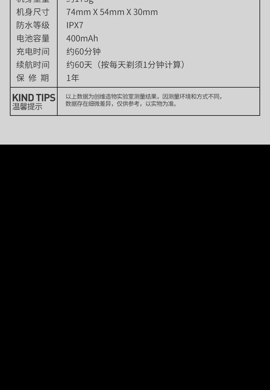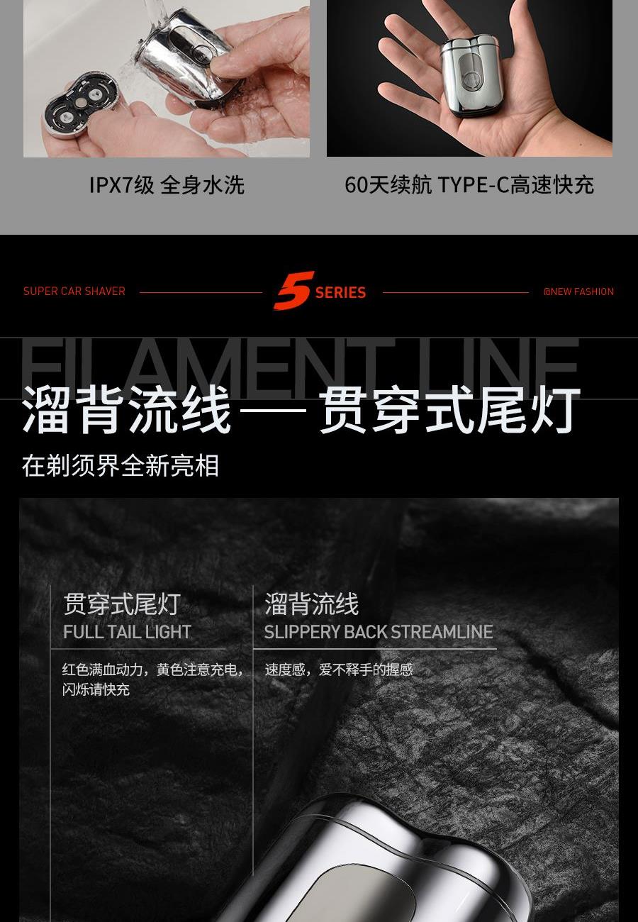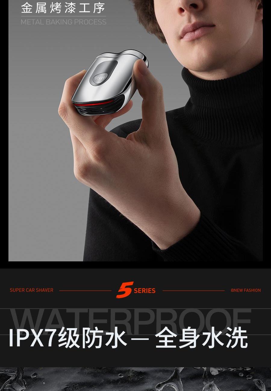 电机转速:9000转/min 机身材质:锌合金 刀头材质:精钢 刀头数量:2个 产品尺寸:长74mm;宽54mm;高30mm 产品净重:0.17kg 电压:5V 防水等级:IPX7,可全身水洗 充电时间:1小时快充 续航:60天 1、设计精致小巧,超高颜值,轻松随行; 2、电镀合金机身,溜背流线型设计,贯穿式尾灯; 3、双环弧面刀网,3D浮动刀头; 4、8000转高速静噪电机,够性能才够快; 5、54组双层刀片, 顺滑贴肤,干湿两剃; 6、IPX7级防水等级,可全身水洗;