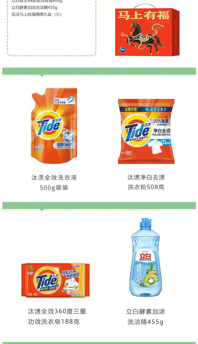 汰渍全效洗衣液500G袋装 汰渍净白去渍洗衣粉508克 汰渍全效360度三重功效洗衣皂188克 立白超威强效洁厕净500g 立白威王84家居消毒液600g 立白酵素加浓洗洁精455g 宝洁马上有福精美礼盒(小)