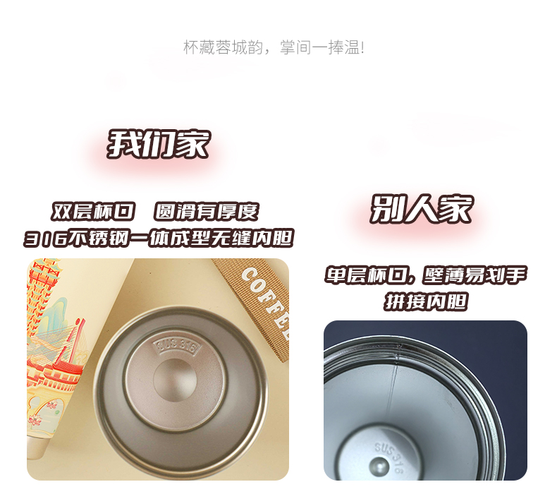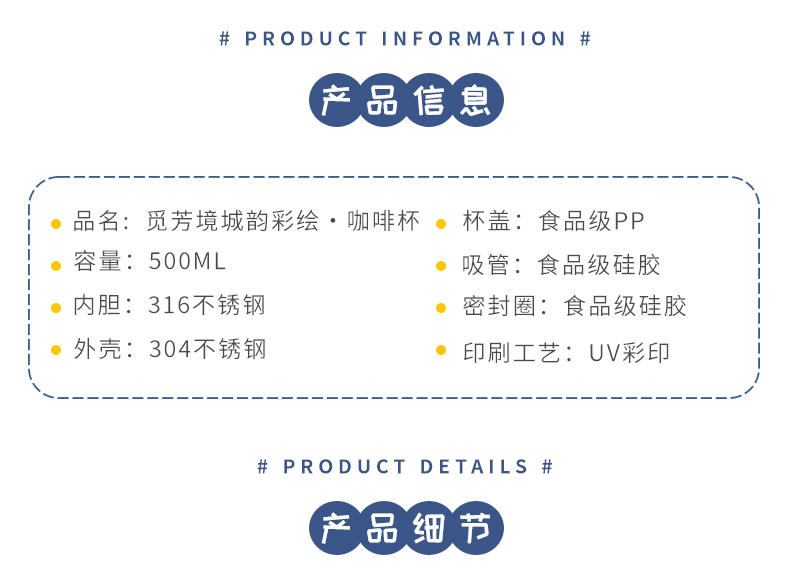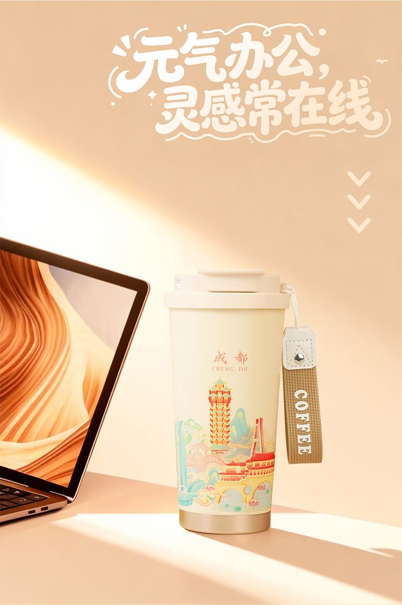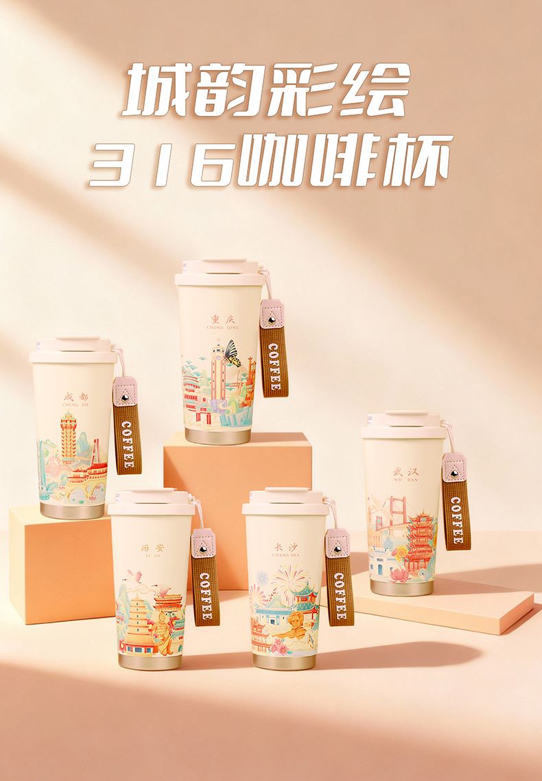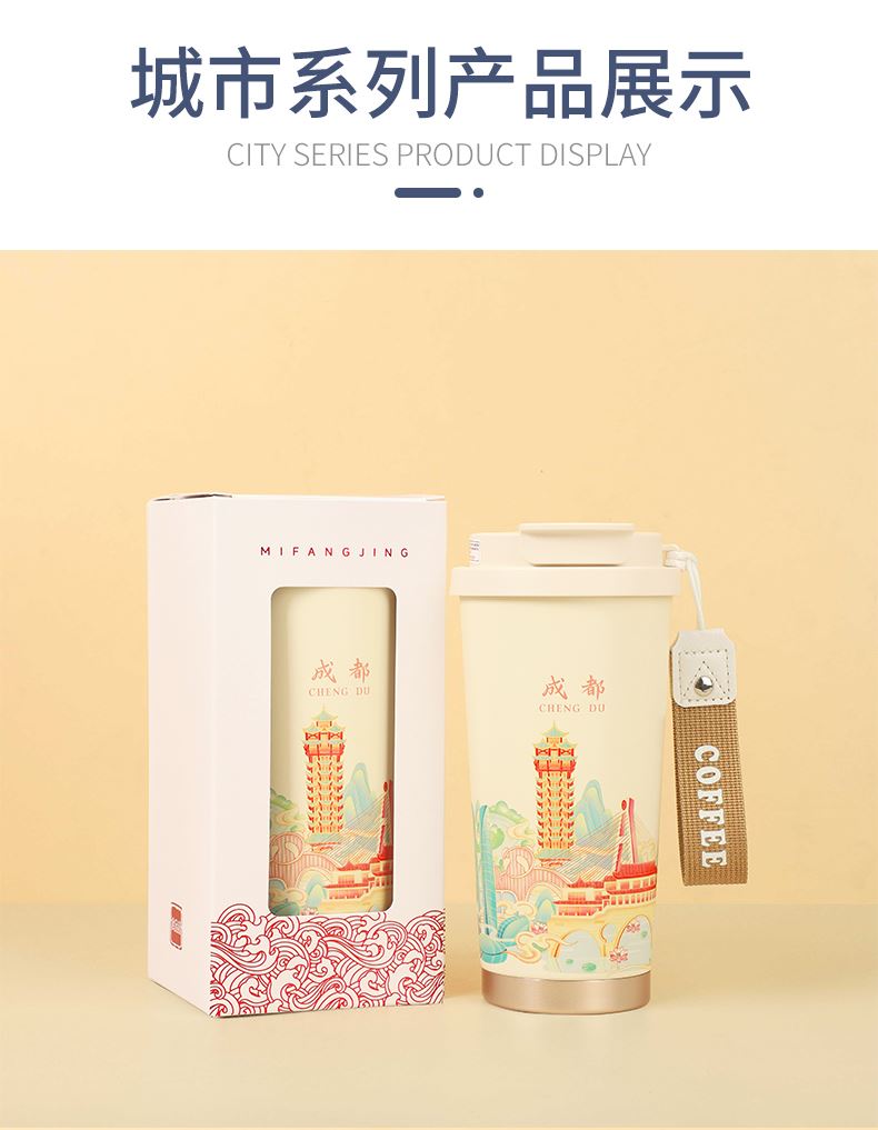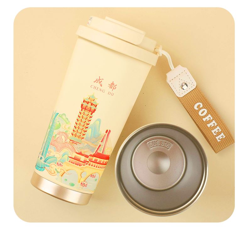 城市文创系列:成都、武汉、长沙、合肥、重庆、西安 容量:500ml 内胆:316 外壳:304 杯盖:食品级PP 吸管:食品级硅胶 吸嘴:食品级PP 密封圈:食品级硅胶