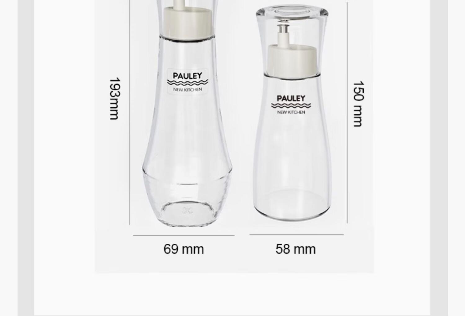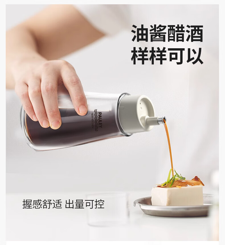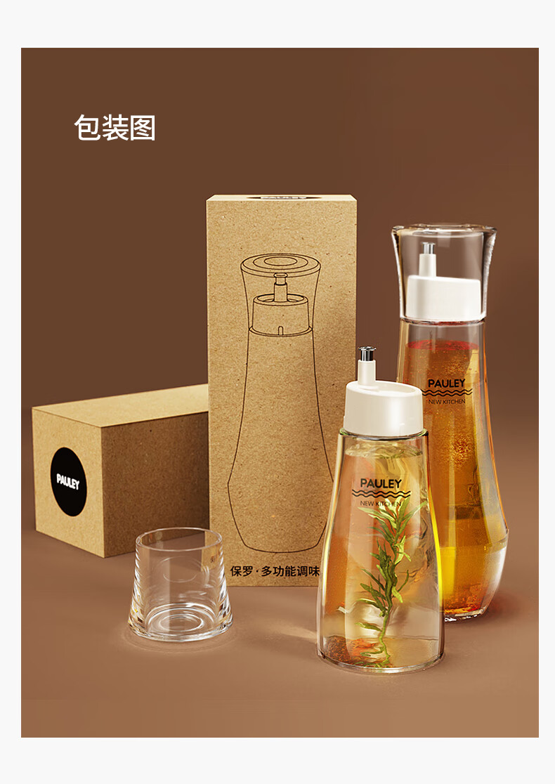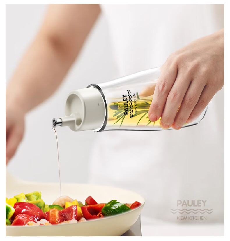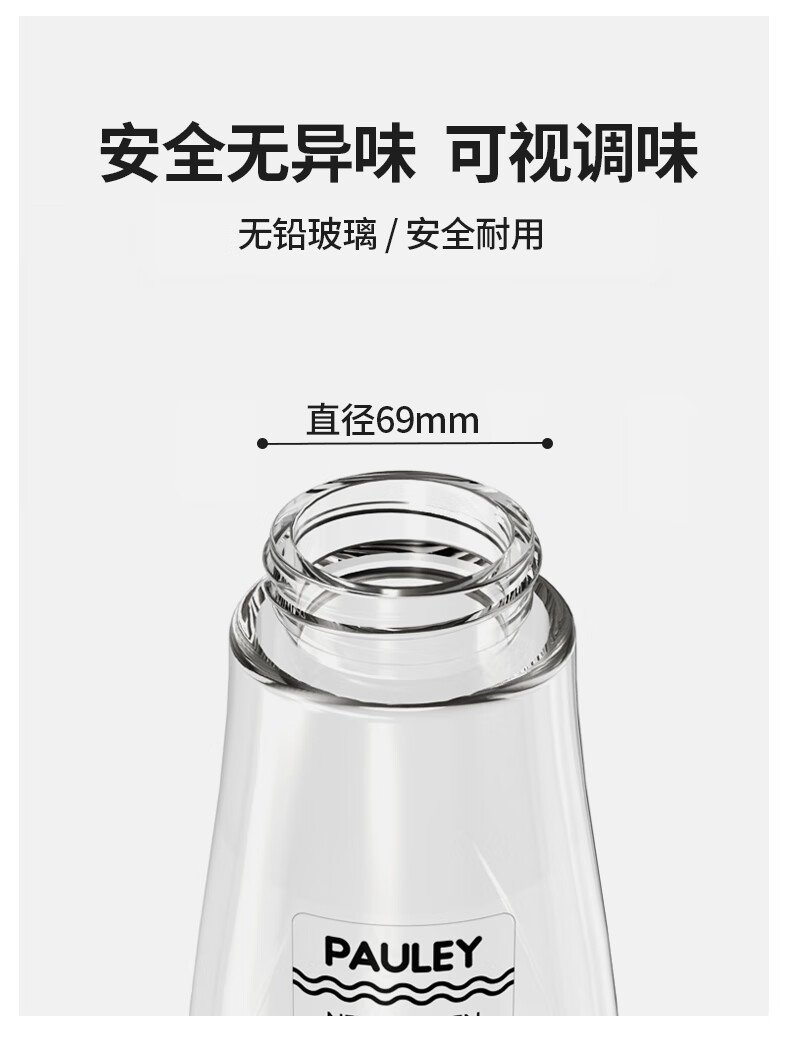 保罗餐桌调味瓶 透明外盖防尘防灰,安全玻璃材质 翻边304不锈钢油嘴 防止滴挂,自动回吸,断油利落 安全无异味 可视调味, 无铅玻璃/安全耐用 随心添加油量,螺纹瓶口/密封性能好 硅胶圈安全密封,不易洒漏/随心放置/调味储存更放心 加厚底部 稳固耐用,一体成型/小巧精致/平稳放置不易倒