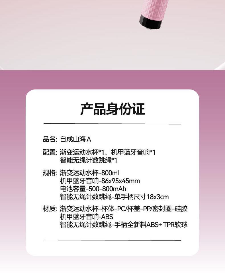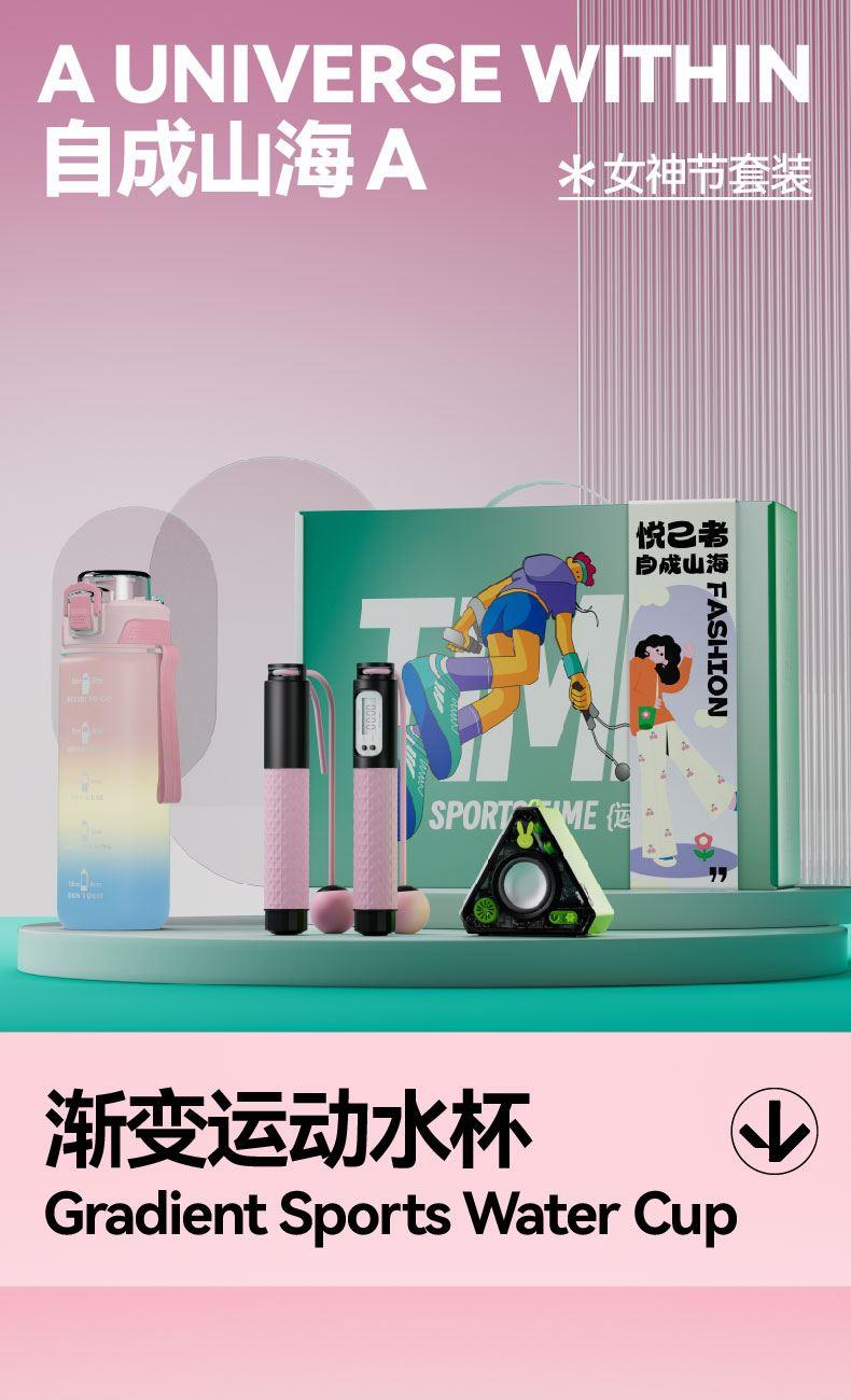 不必追赶谁的峰峦,也不必成为谁的波澜 真正的辽阔,是深知自己体内本就蕴藏着整座山脉与海洋 坚毅是山脊,柔韧是海浪 这个三八节,致敬每一位在奔跑与静息间自如流转的女性 你步履所至,即是风景自成 内配: 配置一:渐变色运动水壶x1 配置二:机甲蓝牙音响x1 配置三:无绳计数跳绳x 1