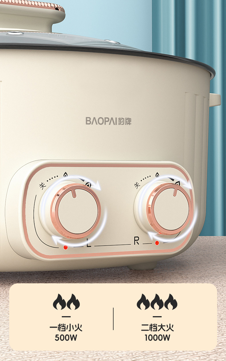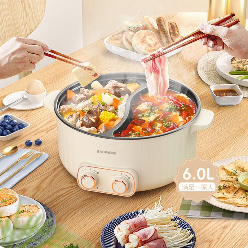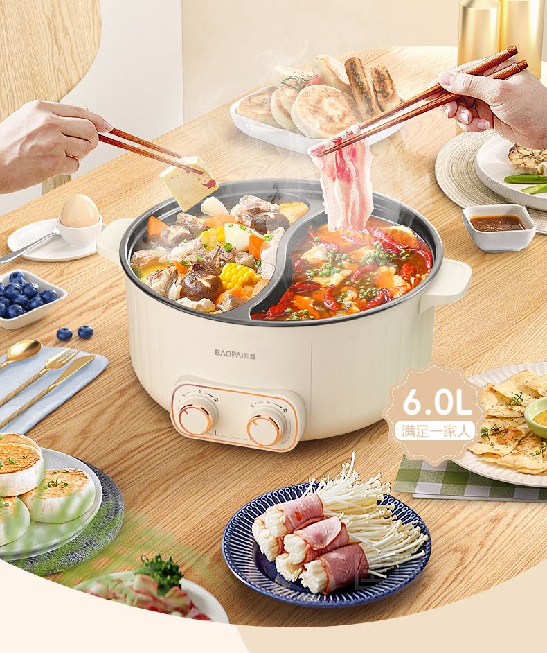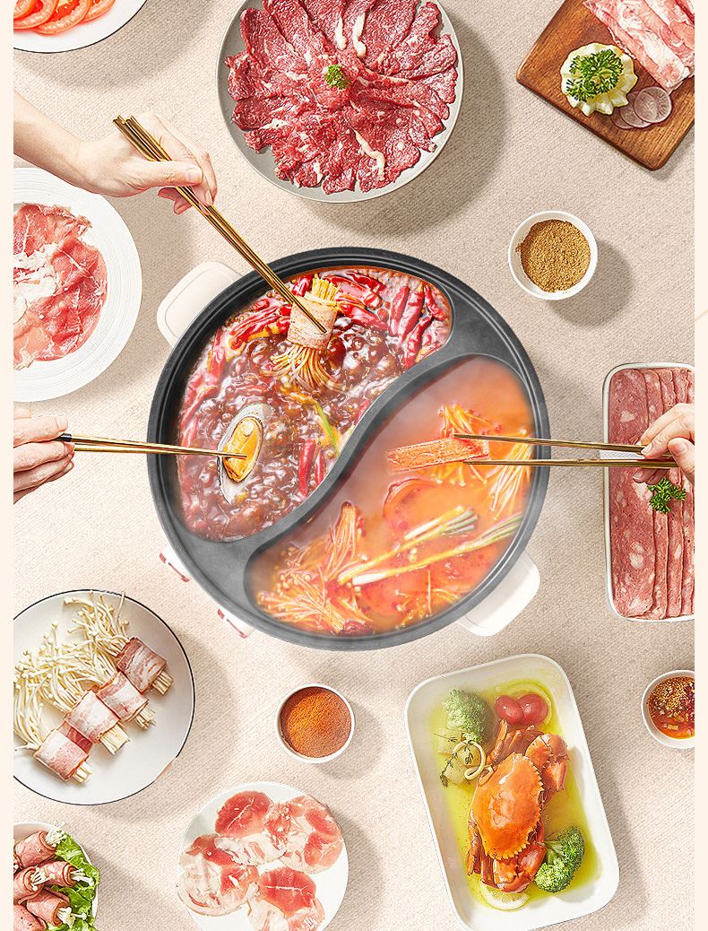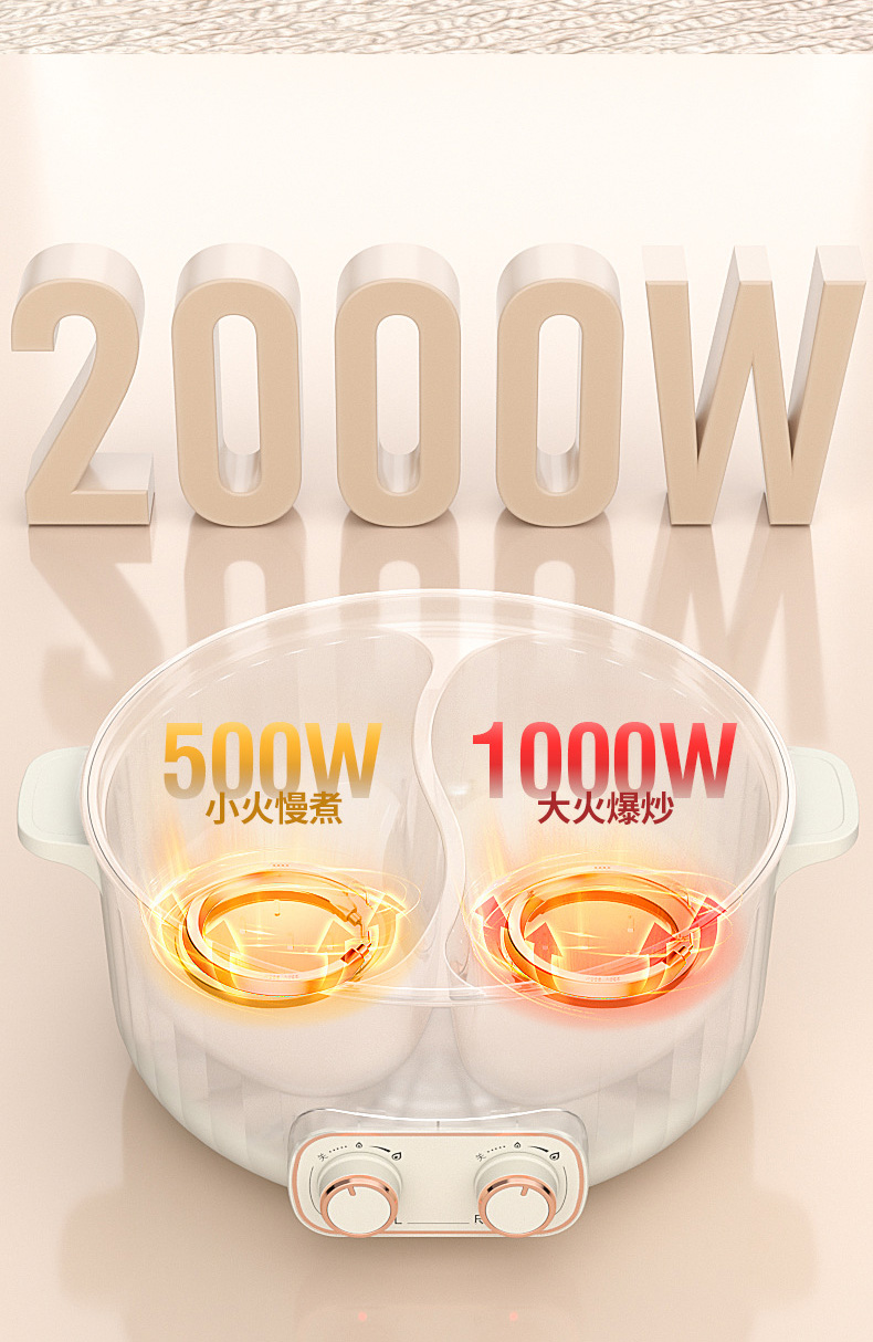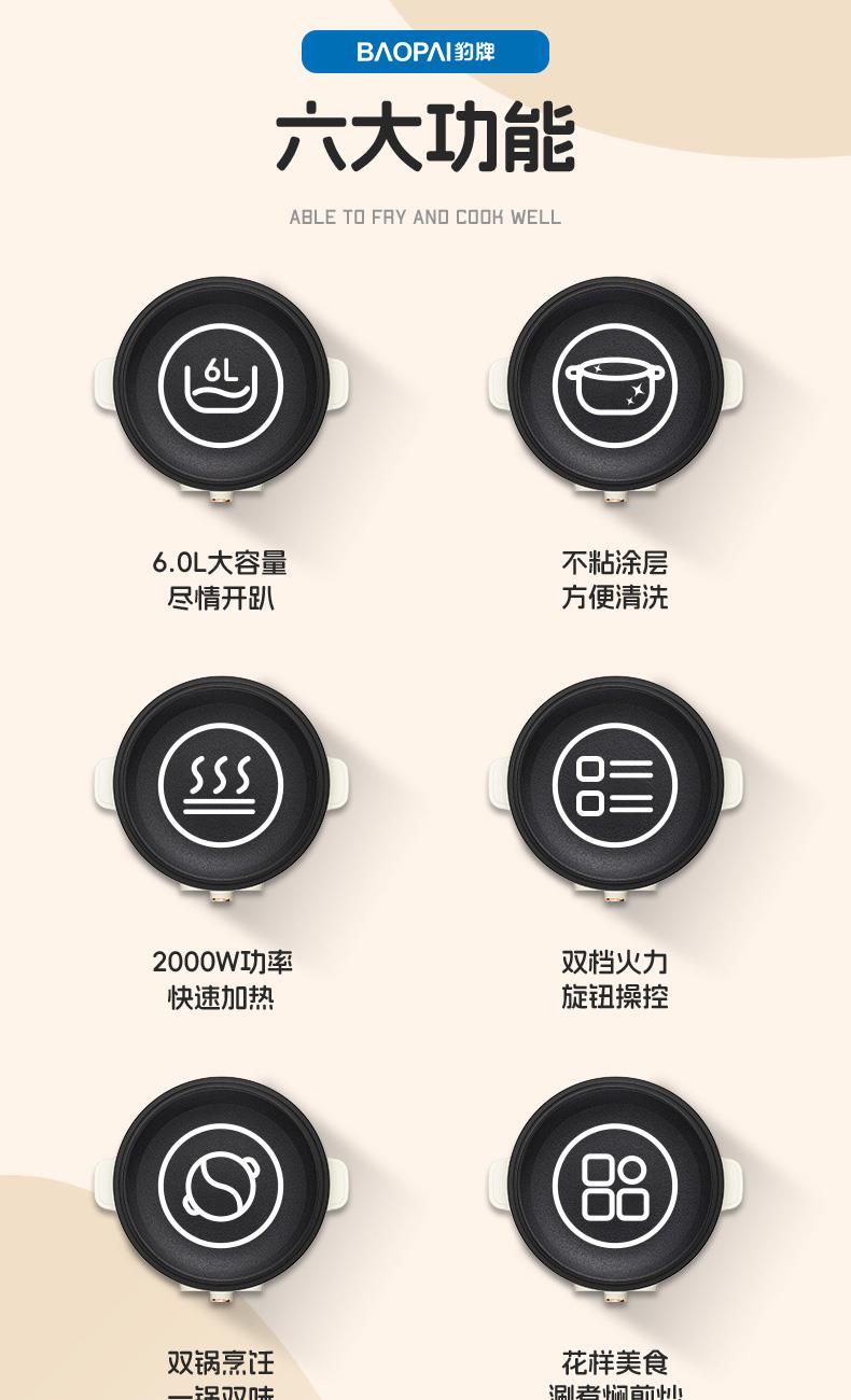 采用食品级不粘涂层,耐磨不粘锅 一锅多用,煎、炸、煮、火锅 高温自动断电保护,使用更安全 鸳鸯锅设计,双旋钮分区独立控制 6L大容量,全家人共享 产品材质:不锈钢+ABS+玻璃 额定电压/频率:220V~50Hz 额定功率:2000W 额定容量:6.0L 产品尺寸:385*340*235mm 控制方式:机械控制 彩盒尺寸:350*220*385mm 外箱尺寸:715*395*680mm