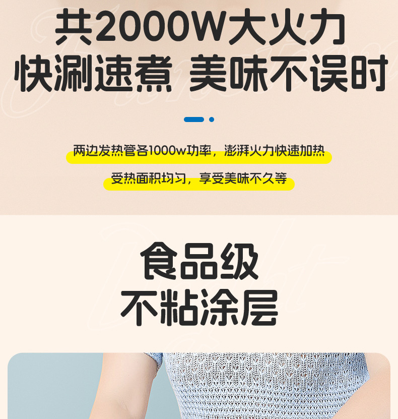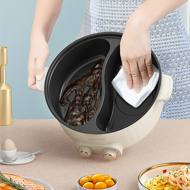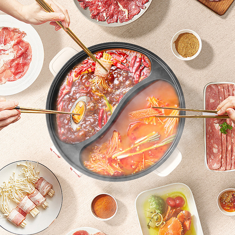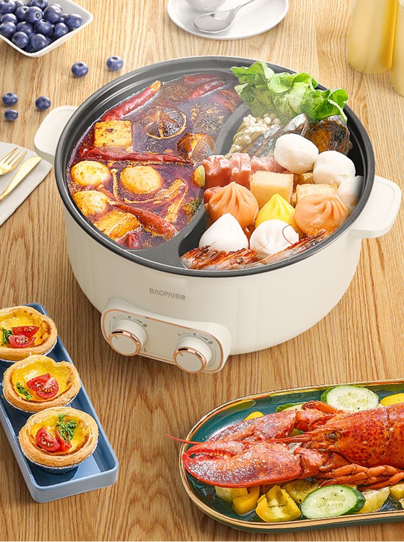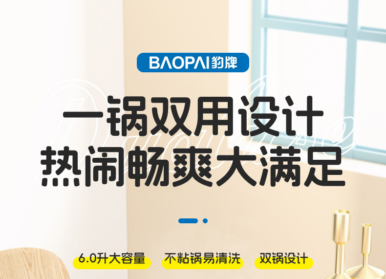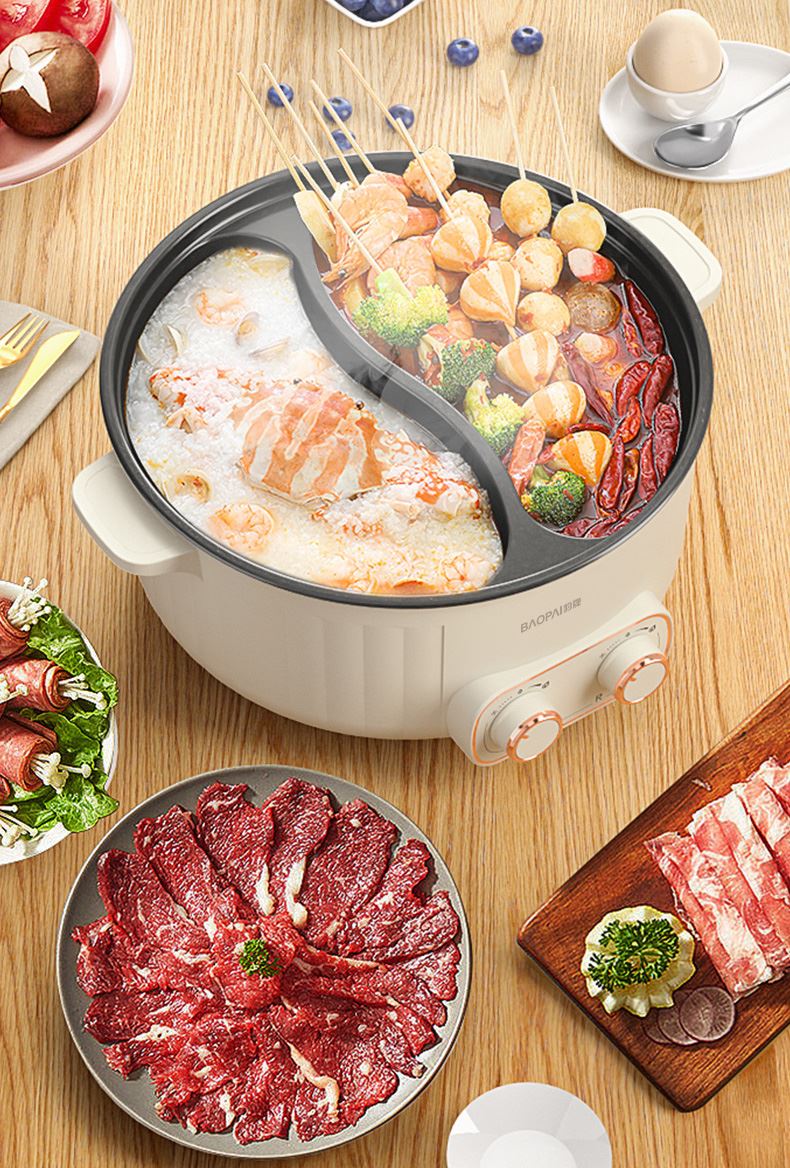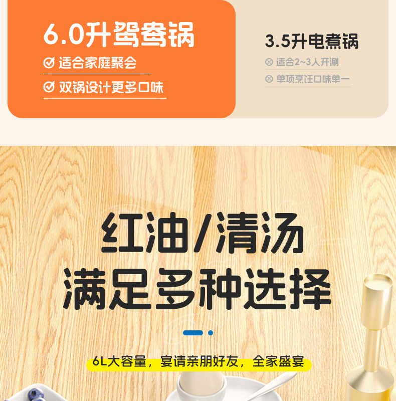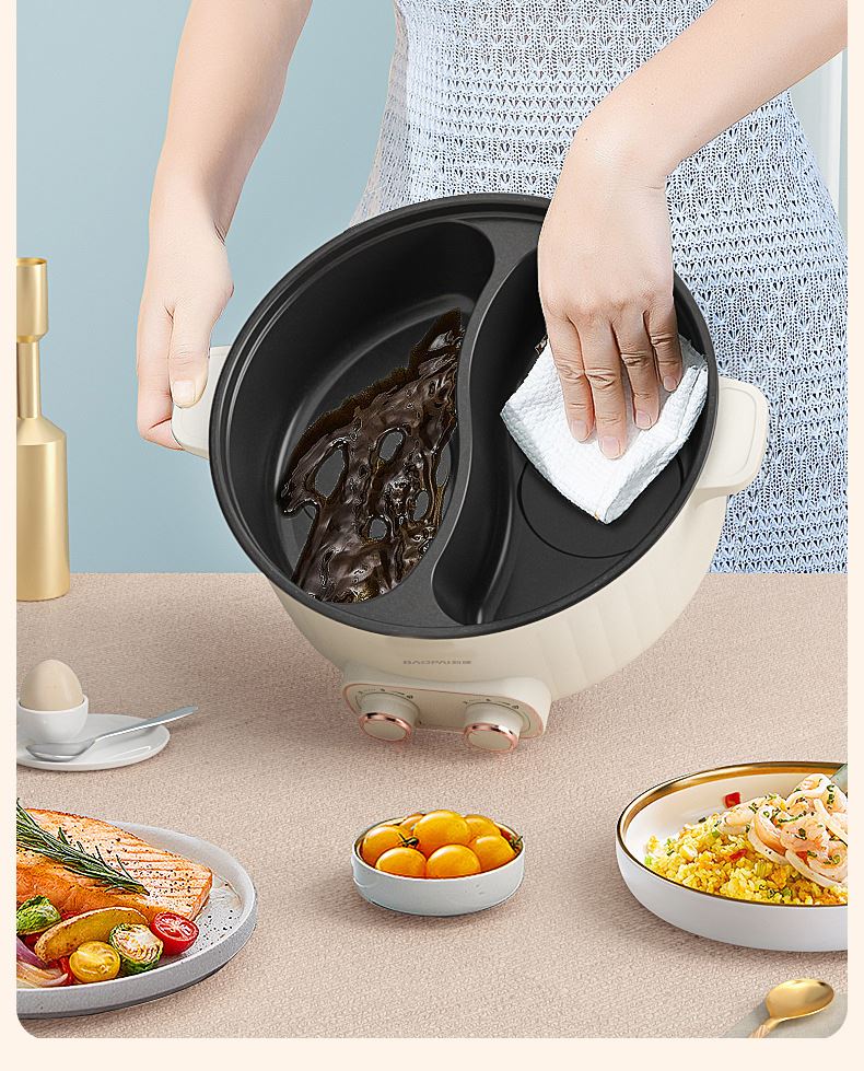 采用食品级不粘涂层,耐磨不粘锅 一锅多用,煎、炸、煮、火锅 高温自动断电保护,使用更安全 鸳鸯锅设计,双旋钮分区独立控制 6L大容量,全家人共享 产品材质:不锈钢+ABS+玻璃 额定电压/频率:220V~50Hz 额定功率:2000W 额定容量:6.0L 产品尺寸:385*340*235mm 控制方式:机械控制 彩盒尺寸:350*220*385mm 外箱尺寸:715*395*680mm