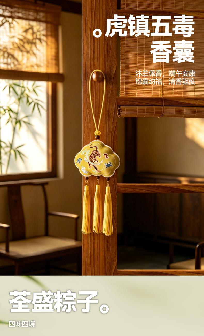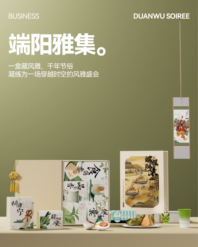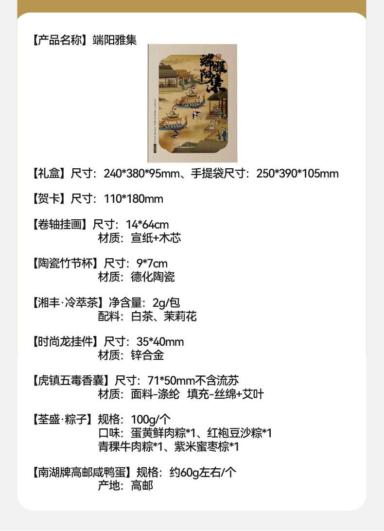 仲夏端阳,时清气和 古时文人墨客常于此时雅聚,沐兰佩香,品茗挥毫 以诗书寄怀,借草木传情 礼盒以“雅集”为魂,撷取端午四艺:粽香、茶韵、锦囊、墨卷 将千年节俗凝练为一场穿越时空的风雅盛会 赠此雅集,愿君:沐兰汤而心澄明,饮雄黄而身康健,系五色而岁长安 内配: 配置一:礼盒&手袋x1 配置二:荃盛·粽子x4 配置三:南湖牌高邮咸鸭蛋x2 配置四:陶瓷竹节杯X1 配置五:湘丰·冷萃茶x4 配置六:卷轴挂画X1 配置七:时尚龙挂件X1 配置八:虎镇五毒香囊x1 配置九:贺卡x1