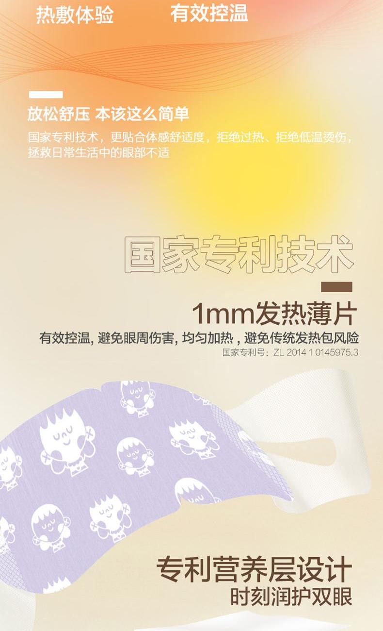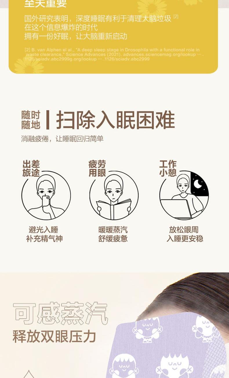 规格:1片/袋 12袋/盒 香型:(洋甘菊/廉衣草/无香/玫瑰/柚子/叶菊素/沉香艾叶/陈皮/ 蓝风铃/鼠尾草海盐/杏仁糖)*1片 保质质:3年 1.绵密蒸汽,释放双眼压力,闭上双眼,热度维持≈25min 2.,1mm发热薄片有效控温≈41°,营养层设计(添加sod、玻尿酸等营养物质)时刻润护双眼。 3.小云朵棉质面料,细腻温柔,呵护眼周脆弱皮肤 4.一盒眼罩12种款式,拒绝选择困难,每款都是舒适体验