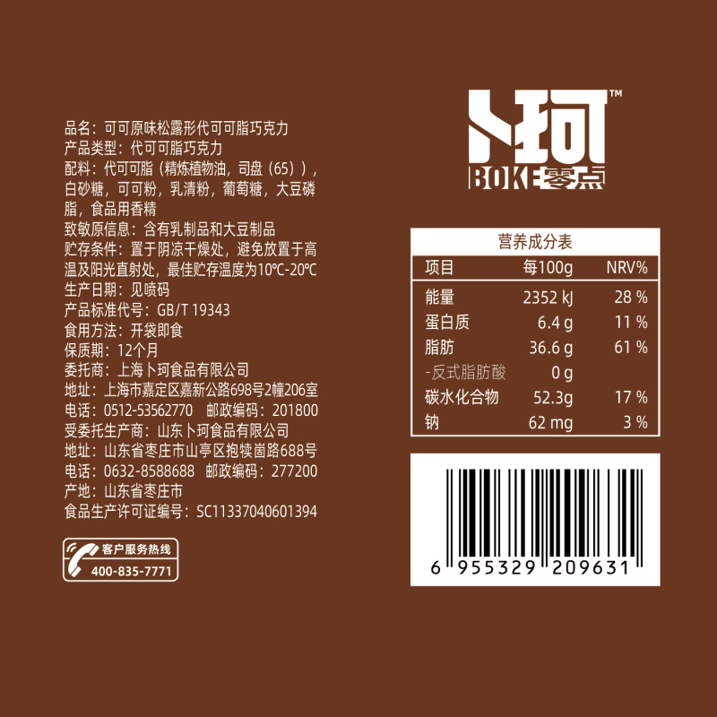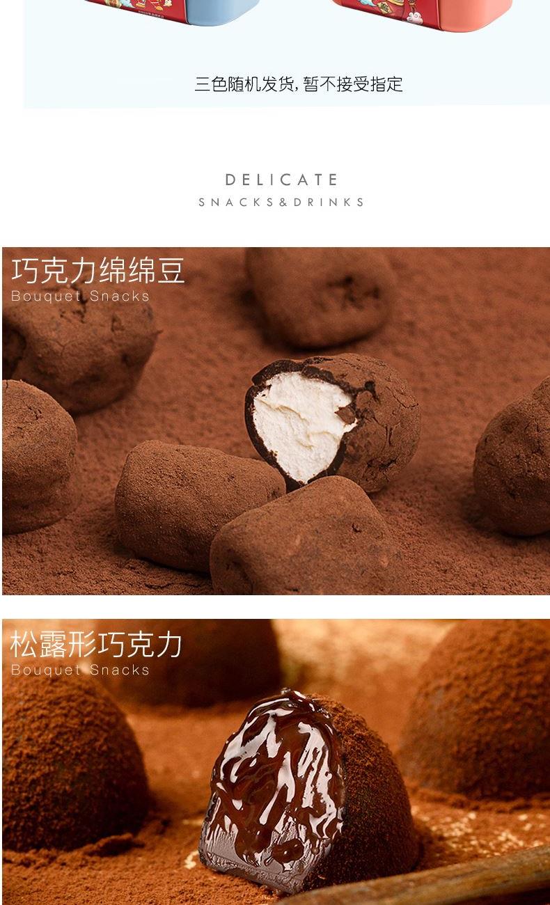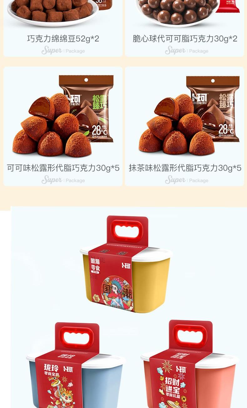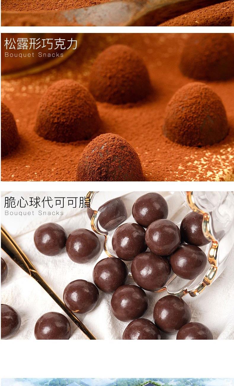 克重:464克 内配: 1.清香抹茶味松露形代可可脂巧克力30g×5袋 2.可可原味松露形代可可脂巧克力30g×5袋 3.巧克力绵绵豆52g×2袋 4.脆心球代可可脂巧克力制品30g×2袋 礼盒规格:24*16*14.5cm 保质期:12月