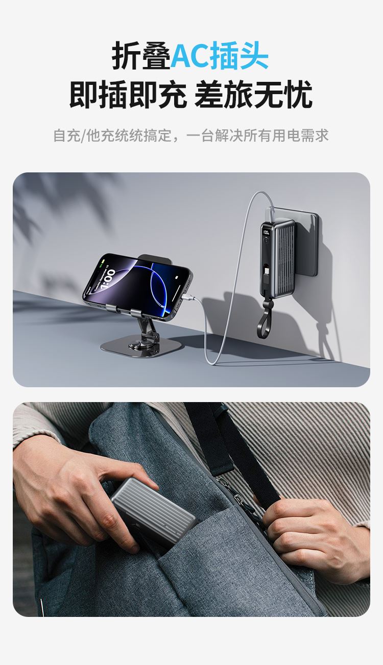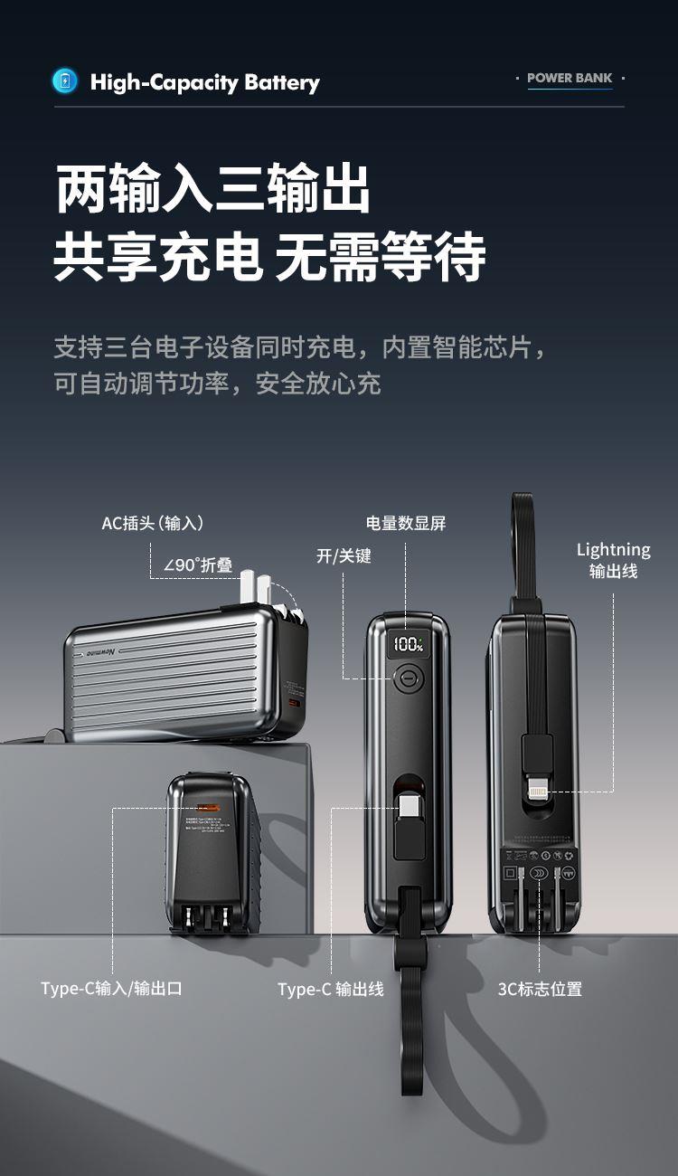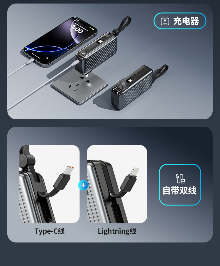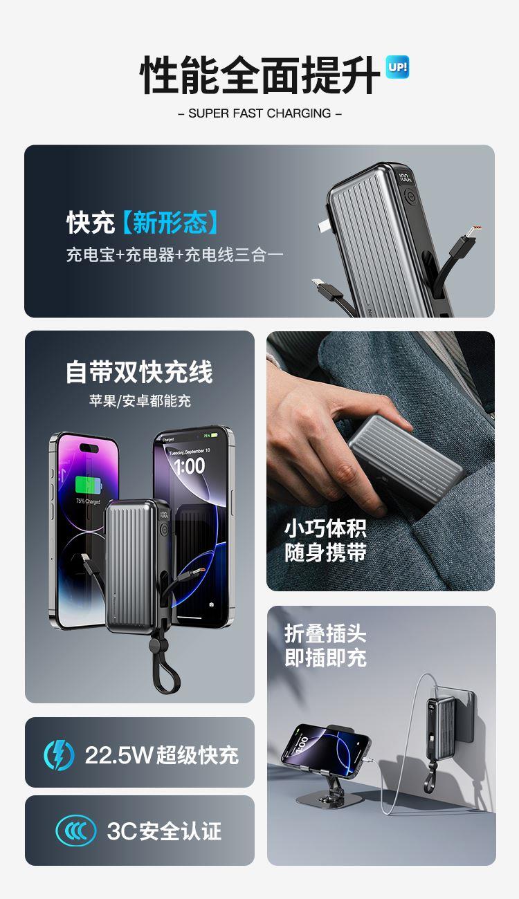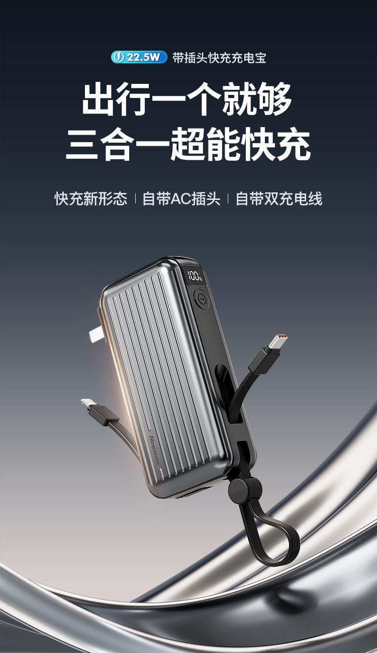 自带220V插头,自带双线,1万毫安,22.5W快充。