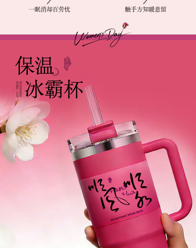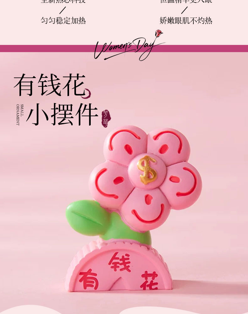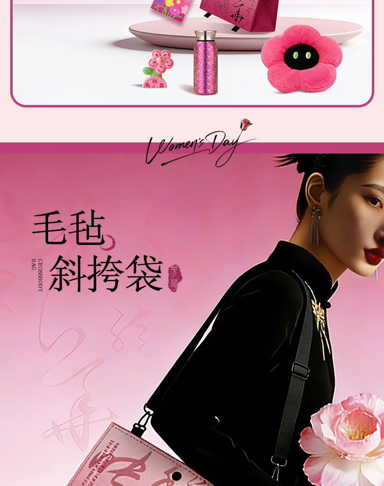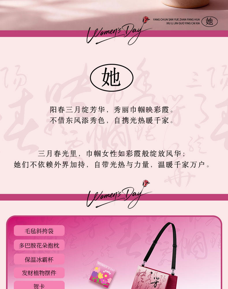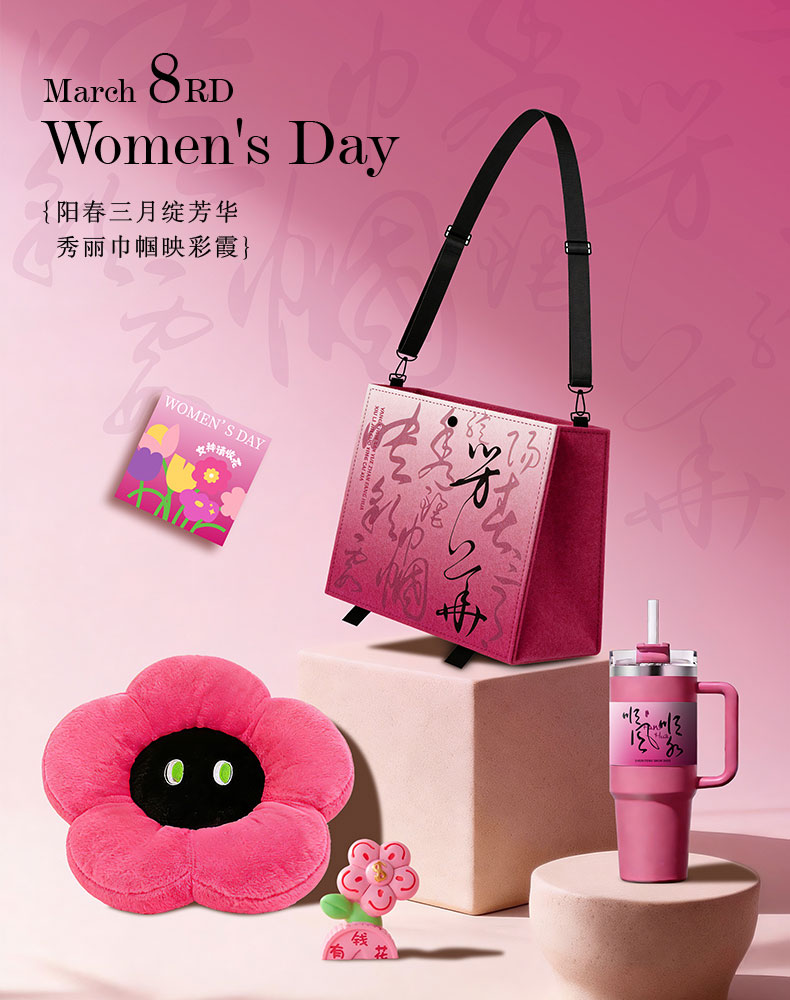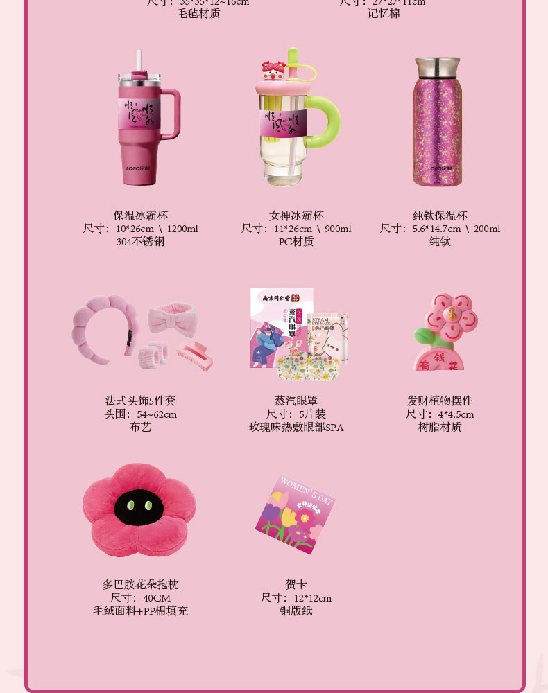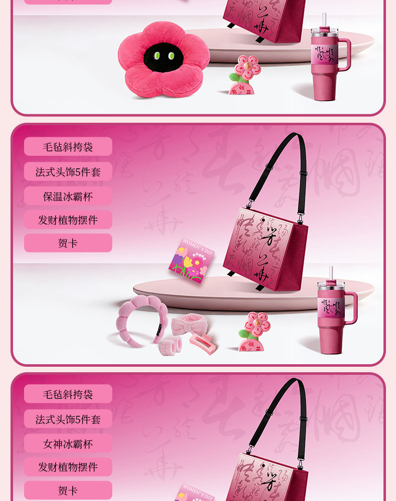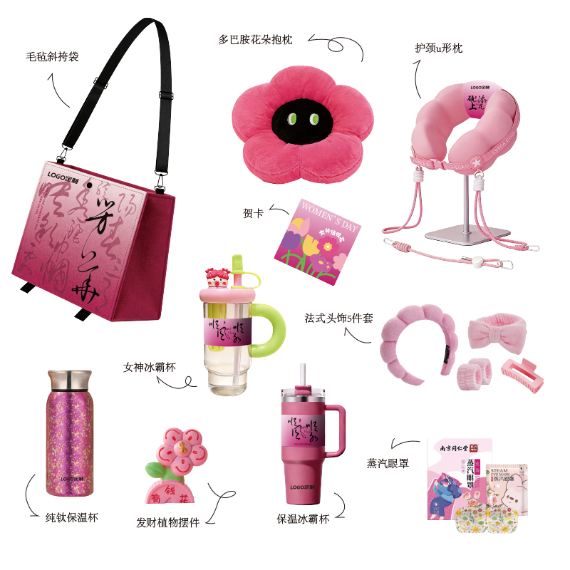 1.毛毡斜挎袋 2.多巴胺花朵抱枕 3.保温冰霸杯 4.发财植物摆件 5.贺卡
