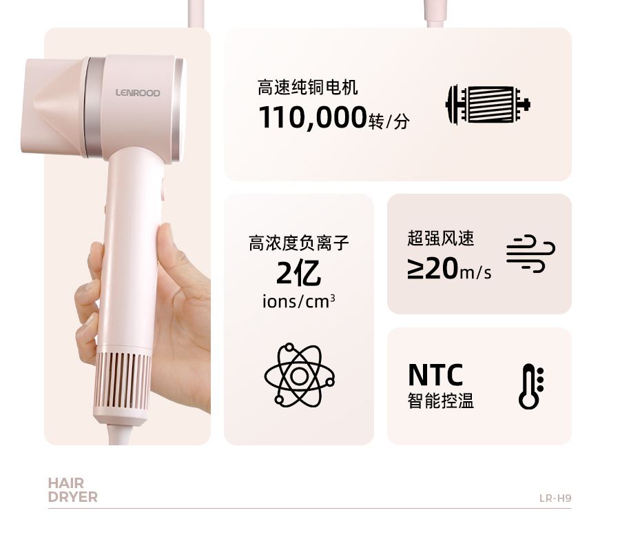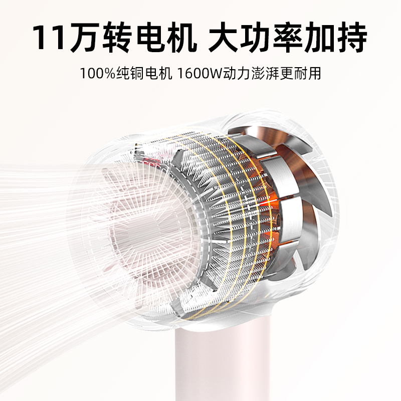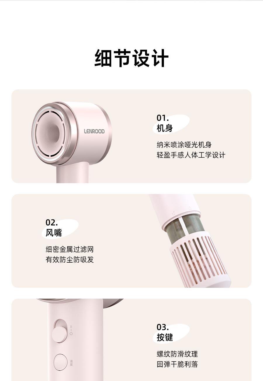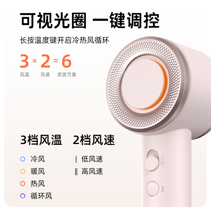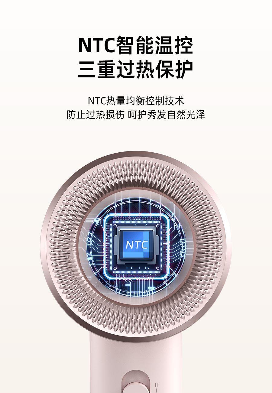 1.可拆双层磁吸集风嘴。 2.二档风速调节开关,三档温度转换模式加冷热循环模式。 3.超细进风过滤网。 4.温度指示灯:橙色、黄色、蓝色分别代表高温、中温、冷风三种温度,加七彩转换循环(高温、中温、冷风交替循环转换)。 5.采用优质长寿命高速直流无刷电机,每分钟可达110000转。 6.风速≥20m/S快速干发。 7.三重过热保让用户用得更放心。 8.高浓度负离子让头发更柔顺。 9.NTC热量均衡控制技术不伤发质。 10.健康柔风模式。