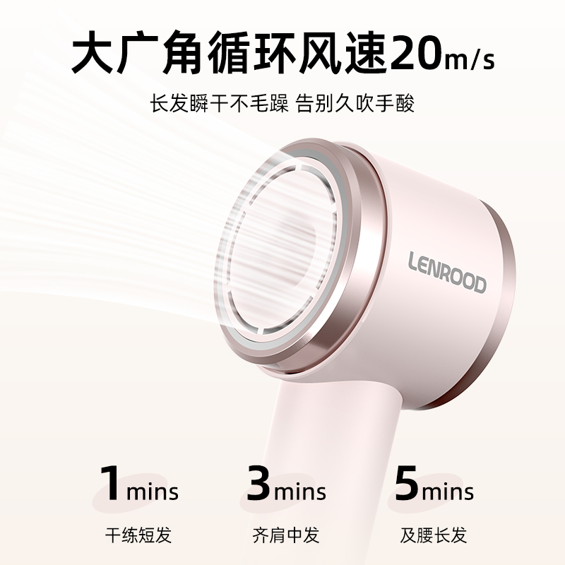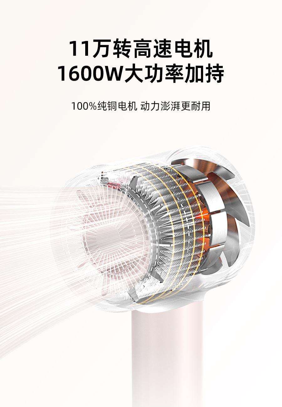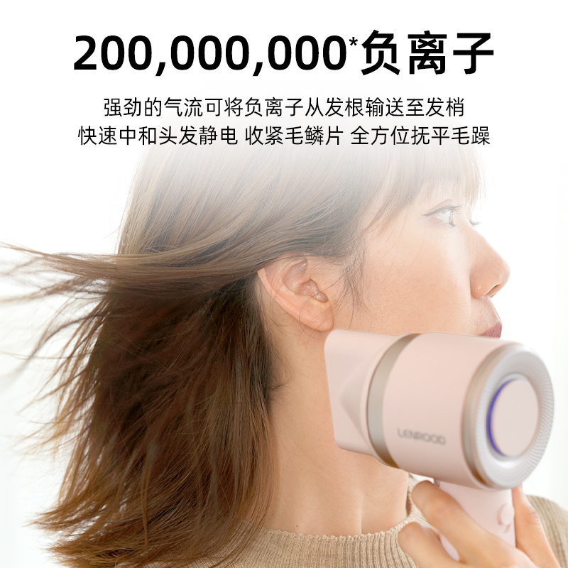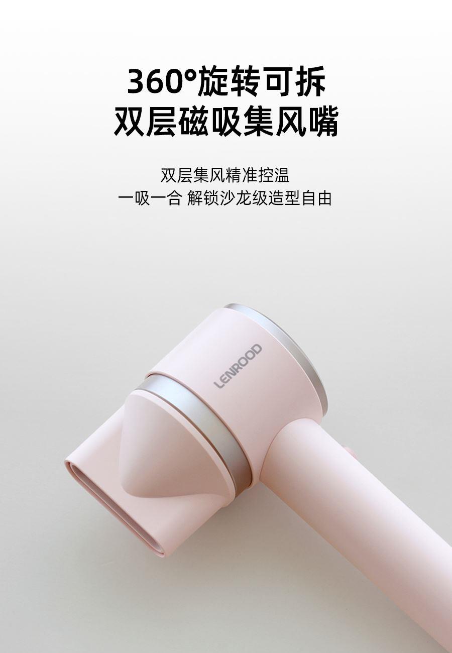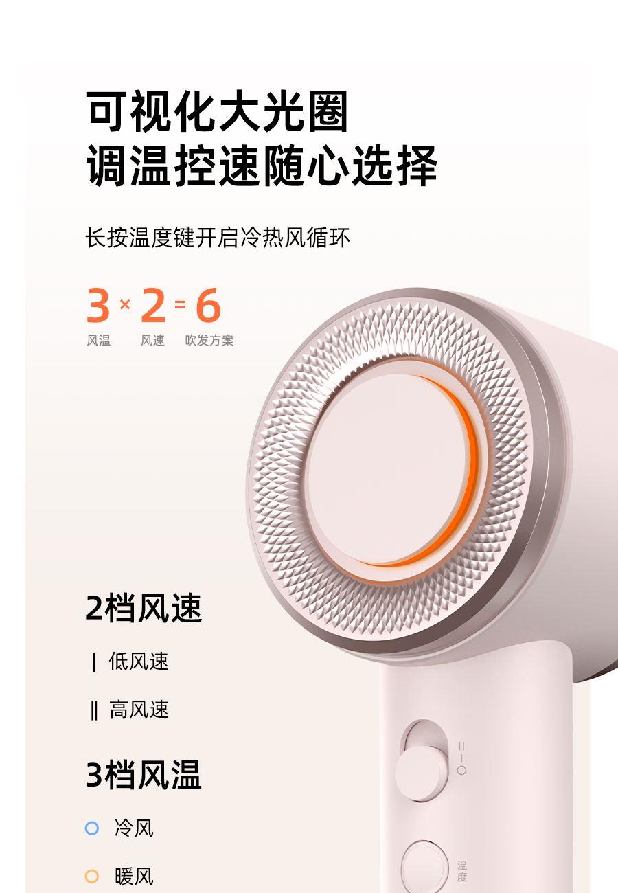 1.可拆双层磁吸集风嘴。 2.二档风速调节开关,三档温度转换模式加冷热循环模式。 3.超细进风过滤网。 4.温度指示灯:橙色、黄色、蓝色分别代表高温、中温、冷风三种温度,加七彩转换循环(高温、中温、冷风交替循环转换)。 5.采用优质长寿命高速直流无刷电机,每分钟可达110000转。 6.风速≥20m/S快速干发。 7.三重过热保让用户用得更放心。 8.高浓度负离子让头发更柔顺。 9.NTC热量均衡控制技术不伤发质。 10.健康柔风模式。