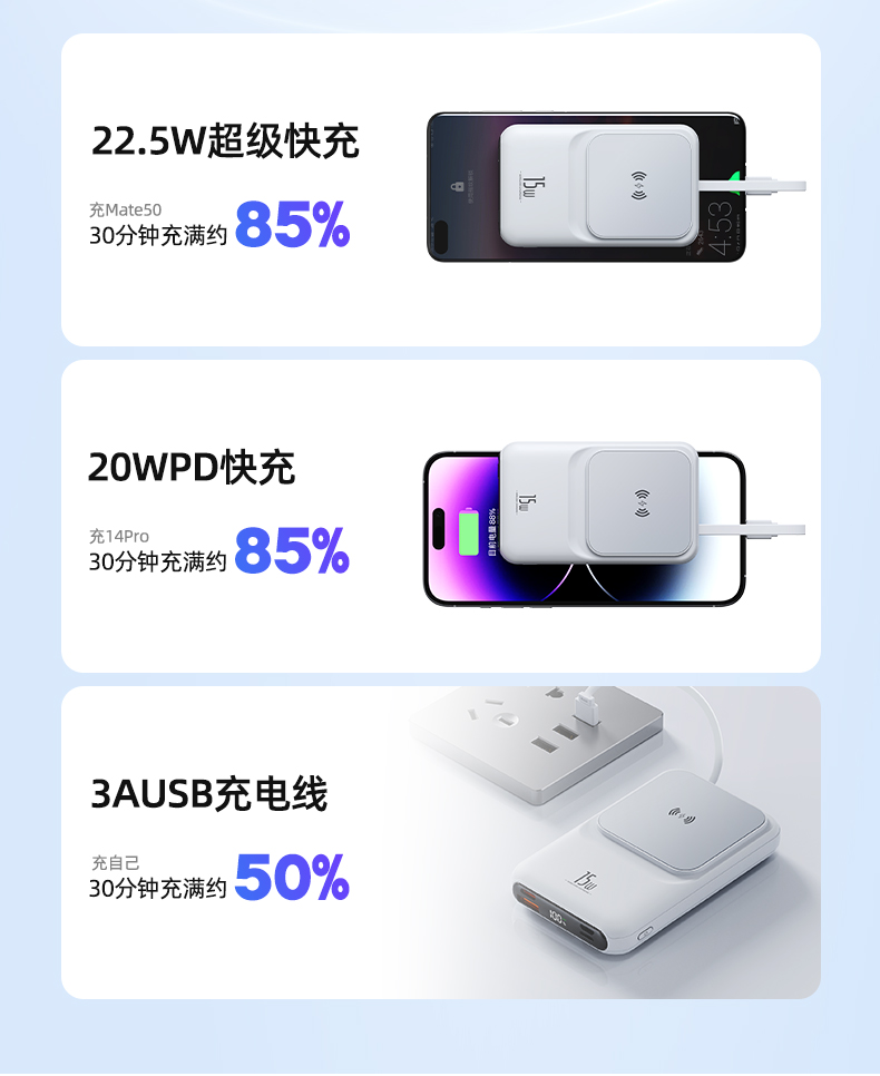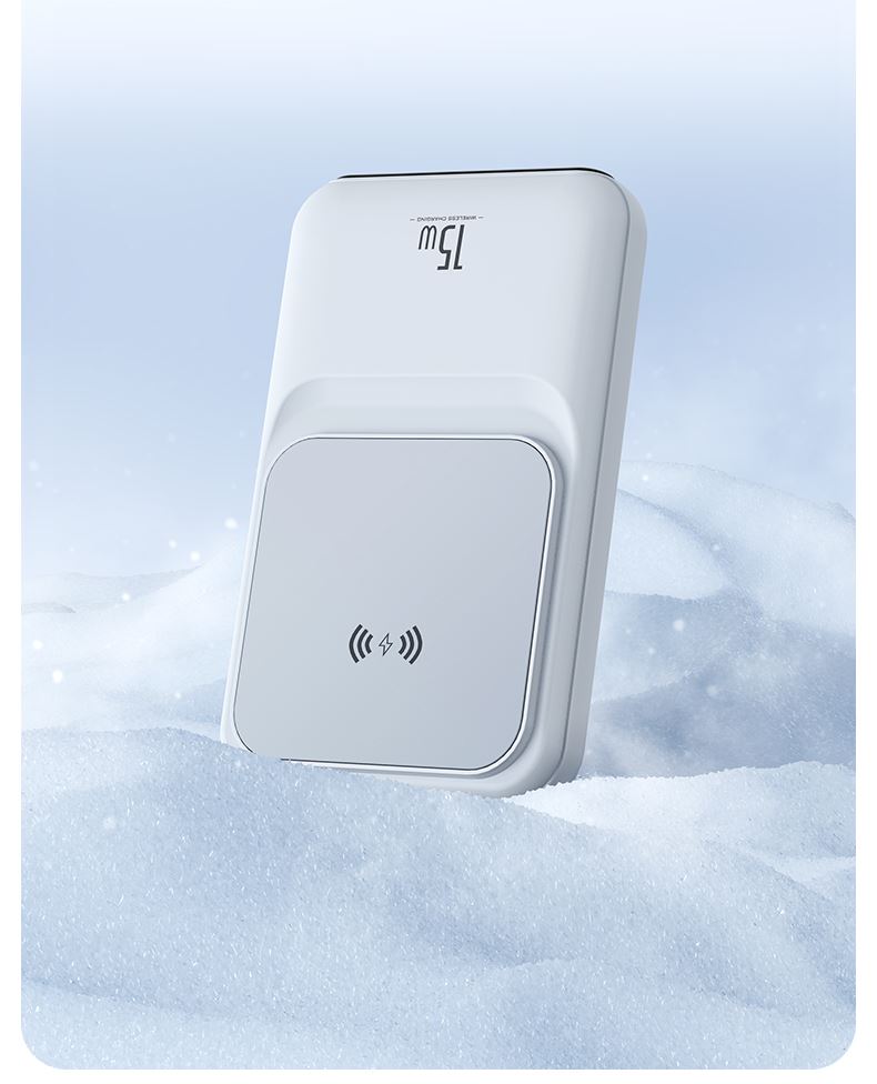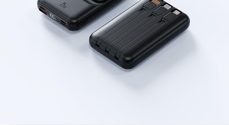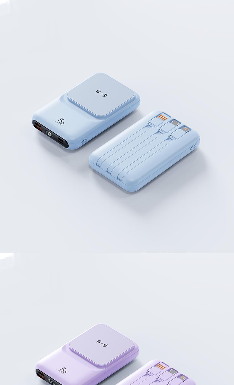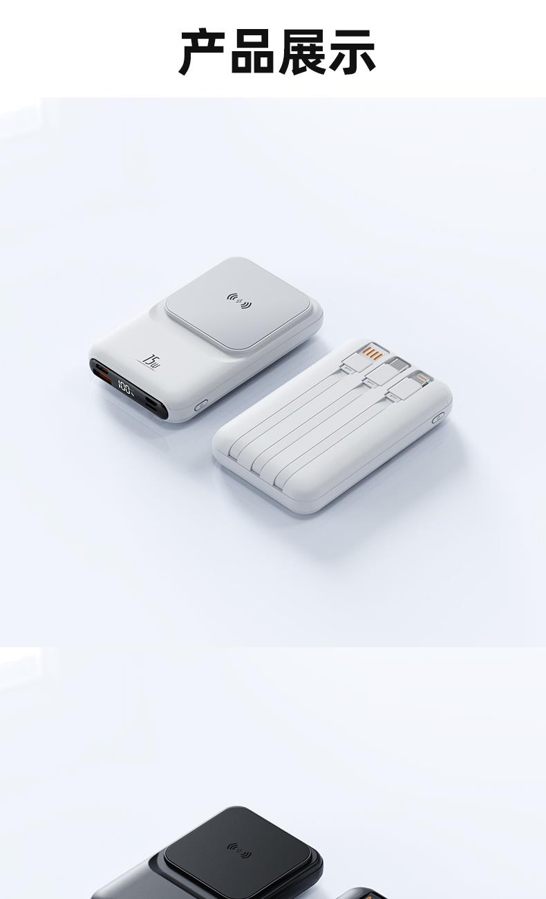 型 号: KW107 颜色 :白色 /蓝色/ 紫色/ 黑色 电池 :聚合物*2pcs 电池类型 :聚合物电芯 容量:10000mAh 材质 :ABS+PC 尺寸 :112mm*68mm*23.4mm 功能特点 简约设计风格,时尚大气; 磁吸15WK快充 22.5W超级快充,迅速充电; 10000mAh锂电池,澎湃动力; 自带苹果和Type-C充电线都的快充 可双项快充,支持苹果15手机 智能数显查看电量