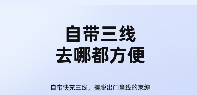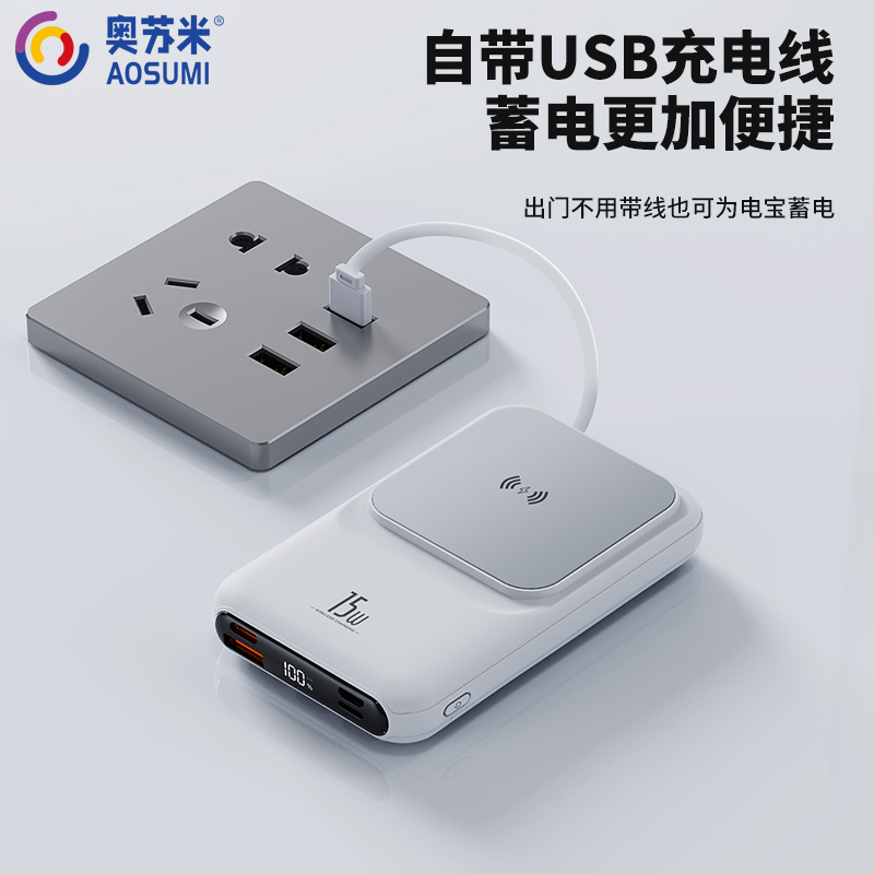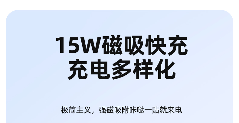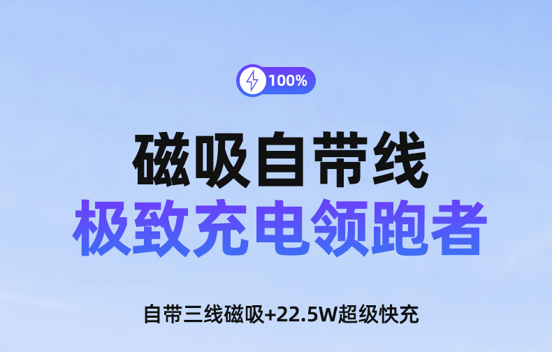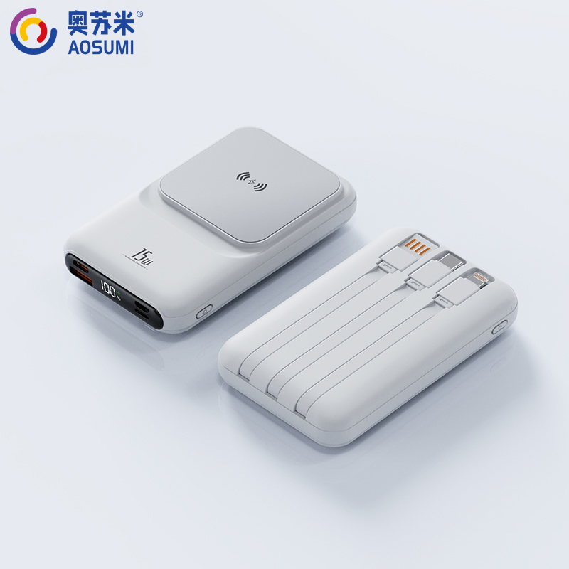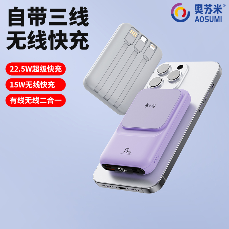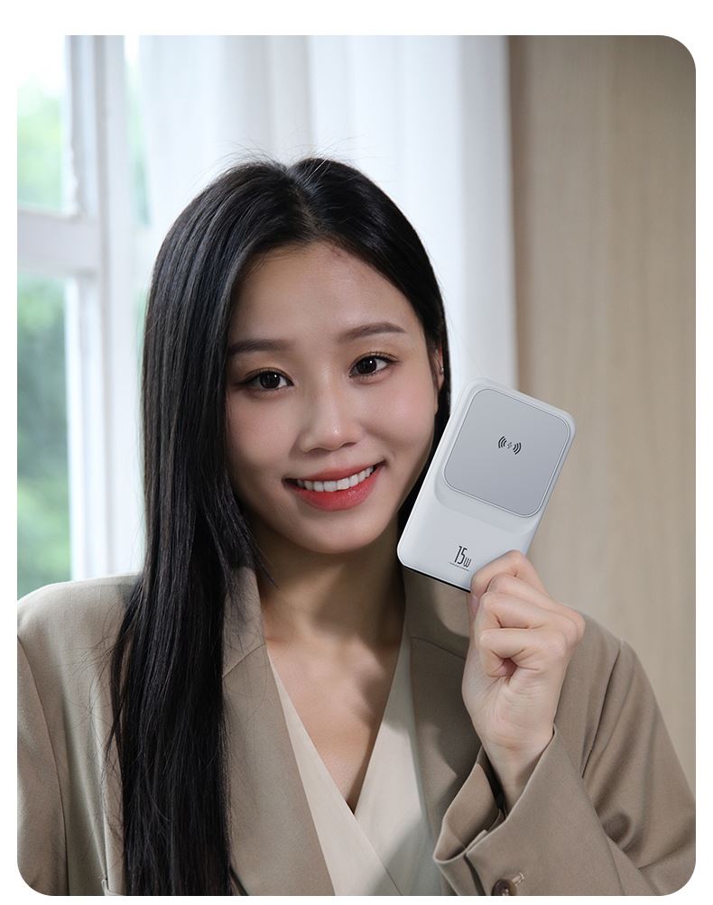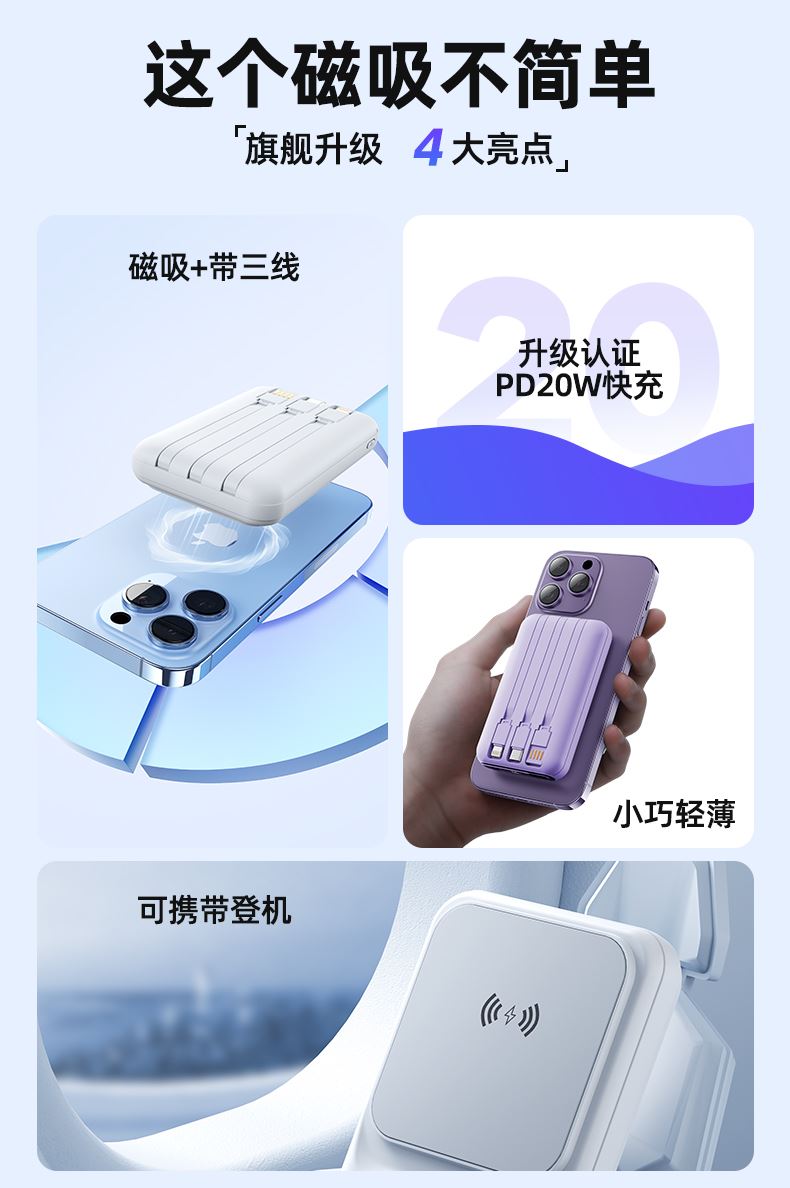 型 号: KW107 颜色 :白色 /蓝色/ 紫色/ 黑色 电池 :聚合物*2pcs 电池类型 :聚合物电芯 容量:10000mAh 材质 :ABS+PC 尺寸 :112mm*68mm*23.4mm 功能特点 简约设计风格,时尚大气; 磁吸15WK快充 22.5W超级快充,迅速充电; 10000mAh锂电池,澎湃动力; 自带苹果和Type-C充电线都的快充 可双项快充,支持苹果15手机 智能数显查看电量