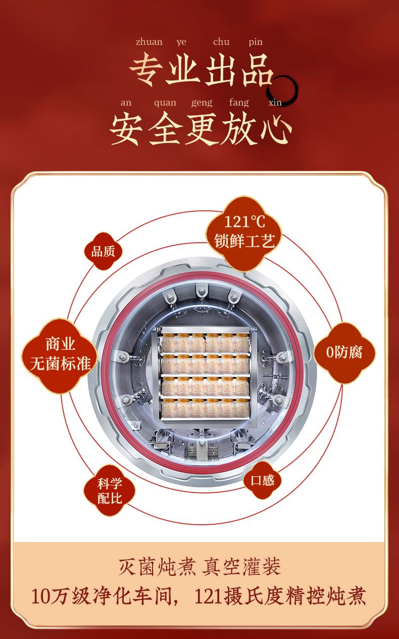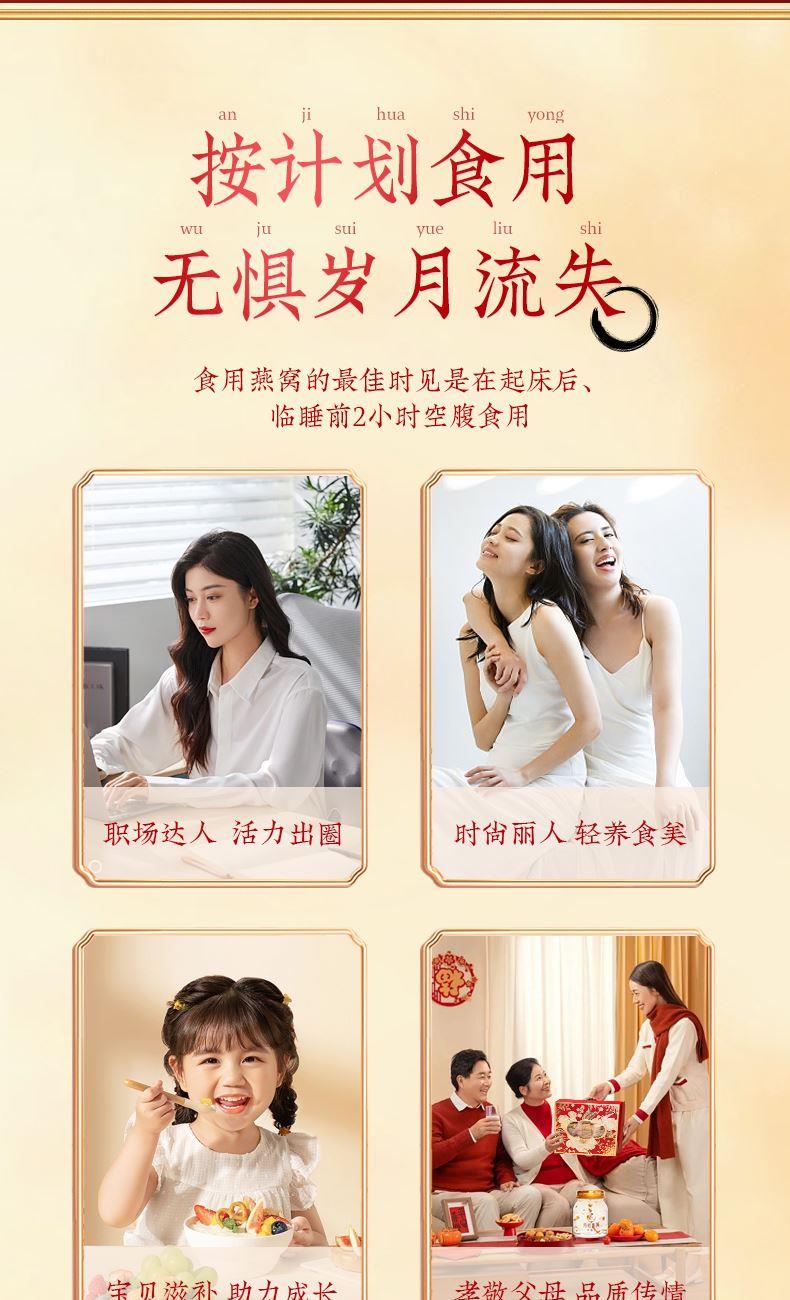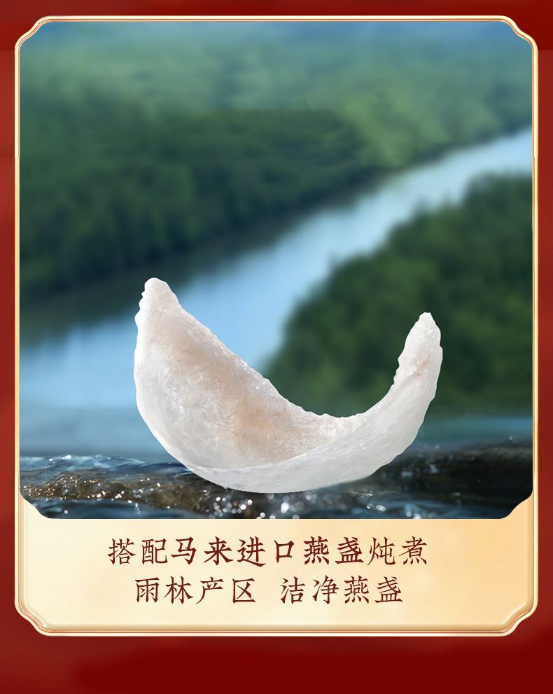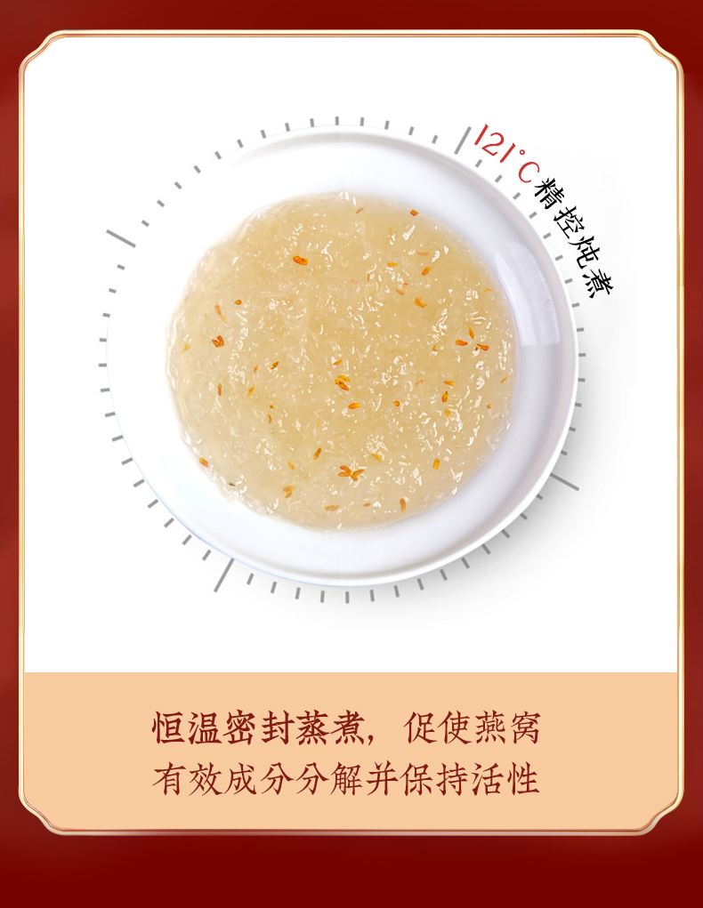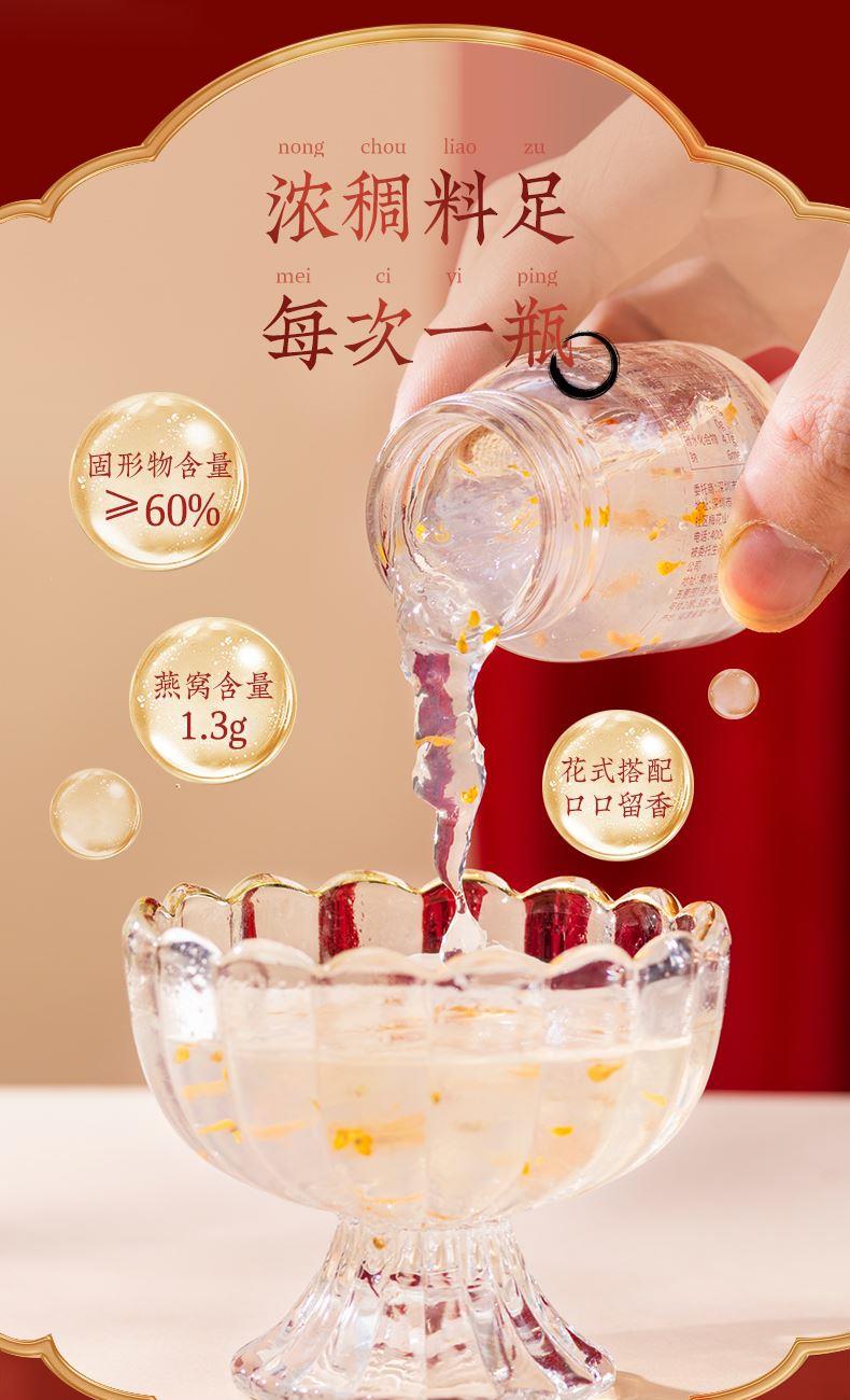 蔡府花容燕丹桂燕窝 规格:240g(40g*6瓶) 单品尺寸:27.5*27.5*6cm 精品超市爆款即食燕窝礼盒 独特风味:马来燕盏的蛋清清香与清新丹桂的甜香融合。 优质原料:精选马来红树林燕盏,干燕窝投放量1.3克/瓶,固形物含量≥60%;搭配花中贡品丹桂精炖而成。 先进工艺:121℃商业无菌工艺,10万级无菌净化车间生产,锁鲜炖煮。 精美包装:原创国风花鸟工笔画设计,细节烫金,不管送礼或者聚餐分享,都彰显品味。 便捷食用:开盖即食,一天一瓶,省时省力。 食用方法:开盖即食 适用场景:送礼佳品