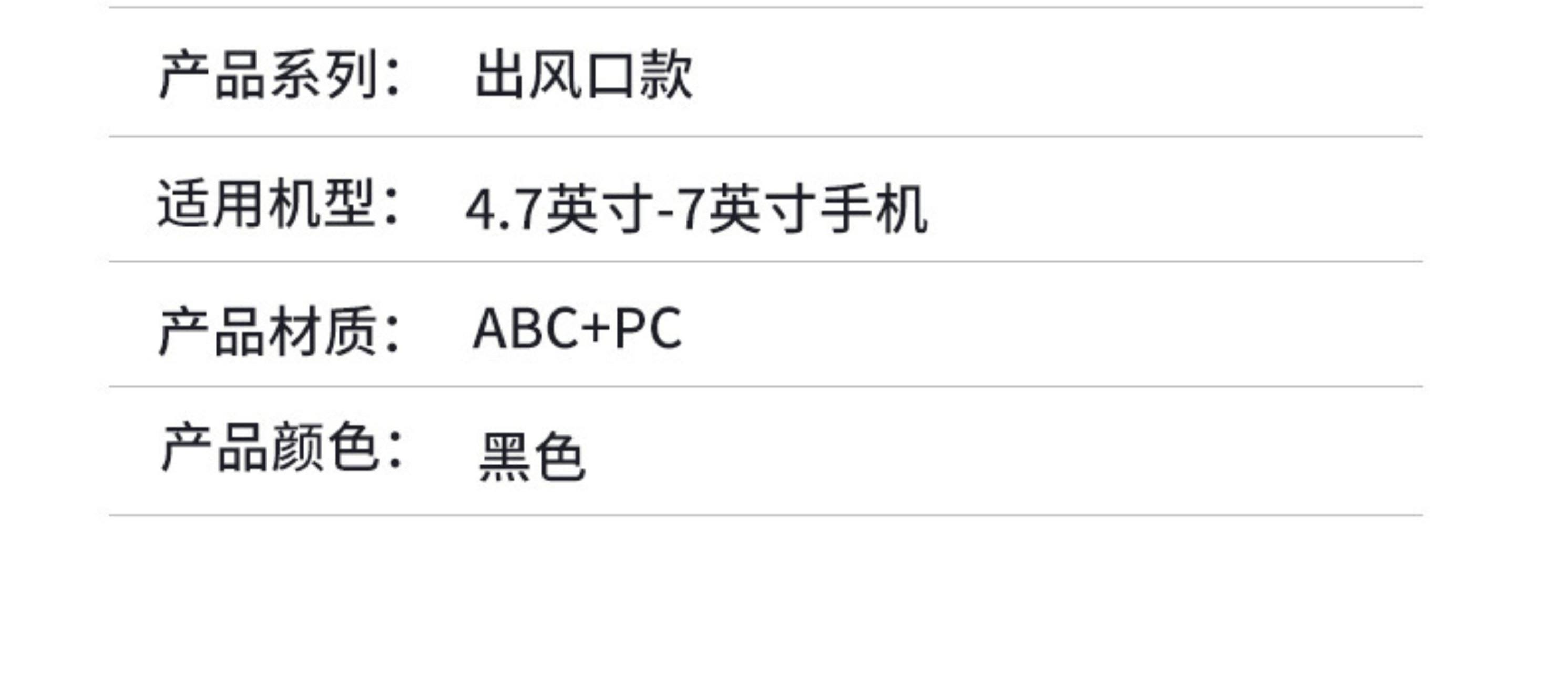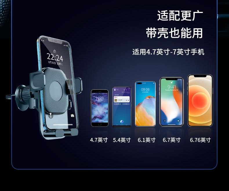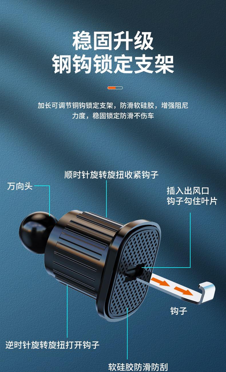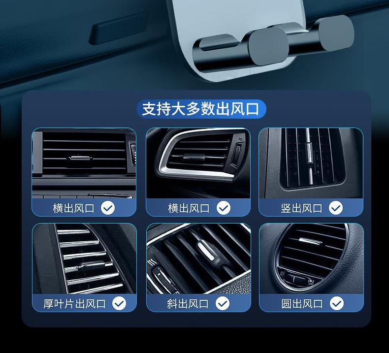 产品规格:10.5*9.7*10.5cm 产品颜色: 黑色 材 料:ABS+PVC+硅胶+金属勾夹 适用设备:4.7-6.7寸手机 产品净重: 72g 安装方式: 出风口夹装式 产品特点 重力联动 自动夹紧 不挡视线 安全驾驶 单手操作 一放即合