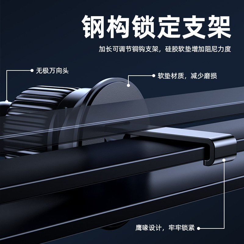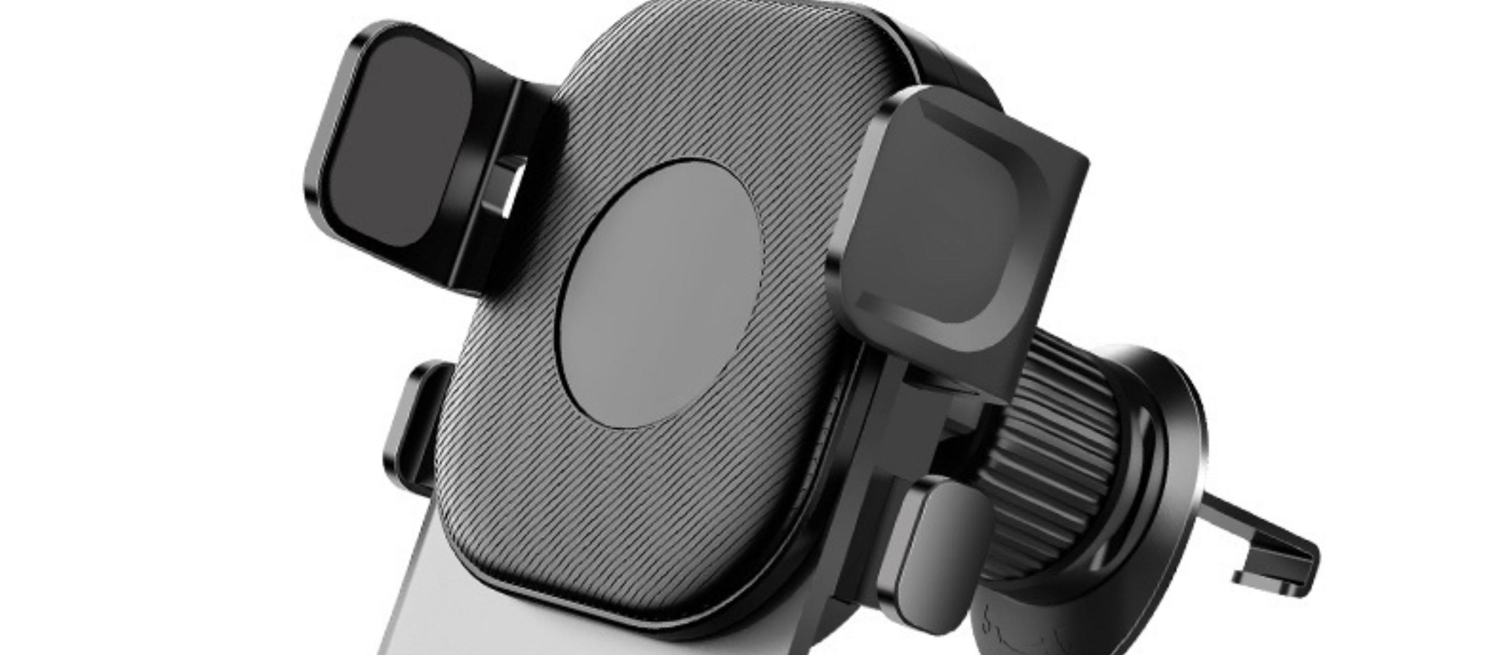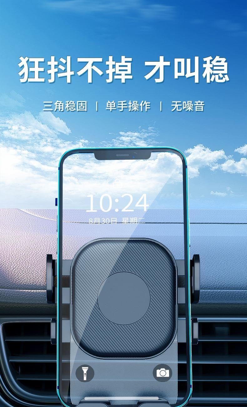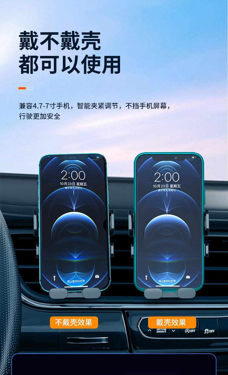 产品规格:10.5*9.7*10.5cm 产品颜色: 黑色 材 料:ABS+PVC+硅胶+金属勾夹 适用设备:4.7-6.7寸手机 产品净重: 72g 安装方式: 出风口夹装式 产品特点 重力联动 自动夹紧 不挡视线 安全驾驶 单手操作 一放即合