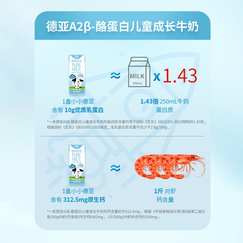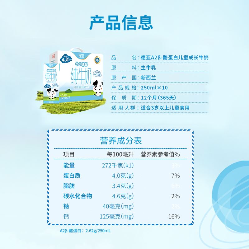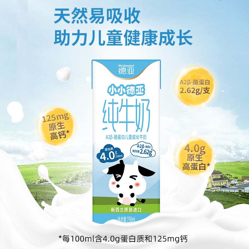 德亚A2β-酪蛋白儿童成长牛奶 原料:生牛乳 原产国:新西兰 产品规格:250mlx10 保 质期:12个月(365天) 适 用人群:适合3岁以上儿童食用