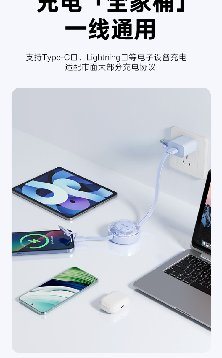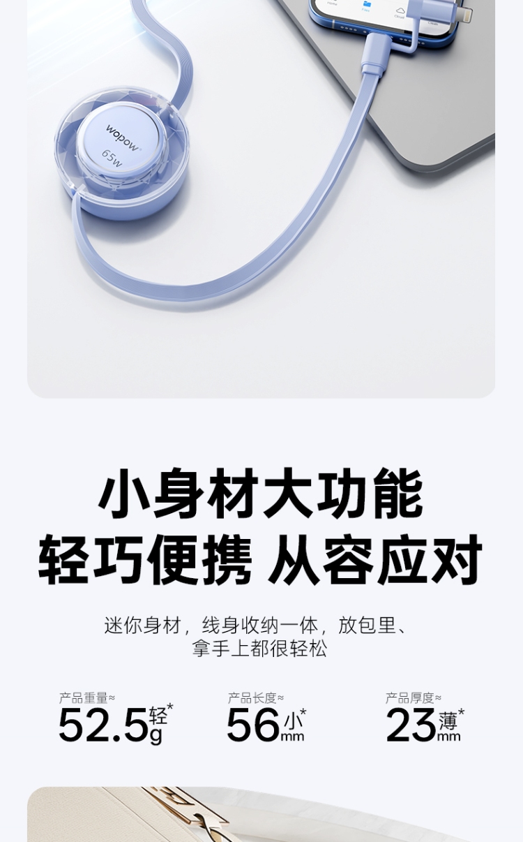 产品尺寸:58*16mm 线长1M 包装尺寸:101.5*176*32mm 产品重量:52.5g 接口:苹果、TYPE_C接口的设备 适用:Apple/Type-c接口手机/平板电子设备颜色:蓝色、粉色 材质:ABS+铝合金+TPE 双向伸缩,便携小巧,多档位调节 钻石切面,绚丽多彩,TPE扁线耐用不缠绕 支持Type-c数据传输,华为65W超级快充, 特性:适用于华为手机65W超级快充,oppo,vivo,苹果,小米,三星等手机,平板,笔记本快速充电
