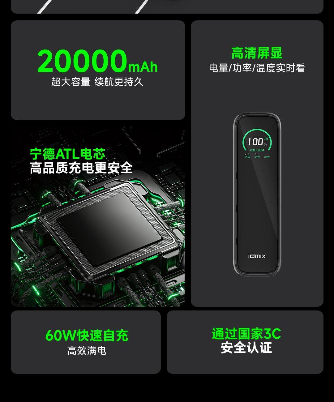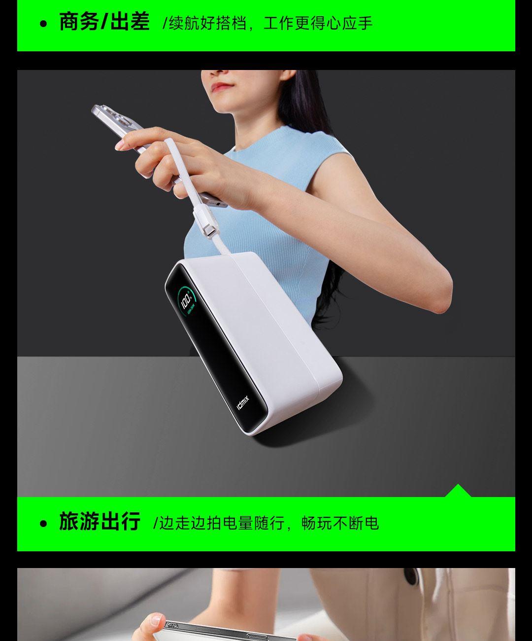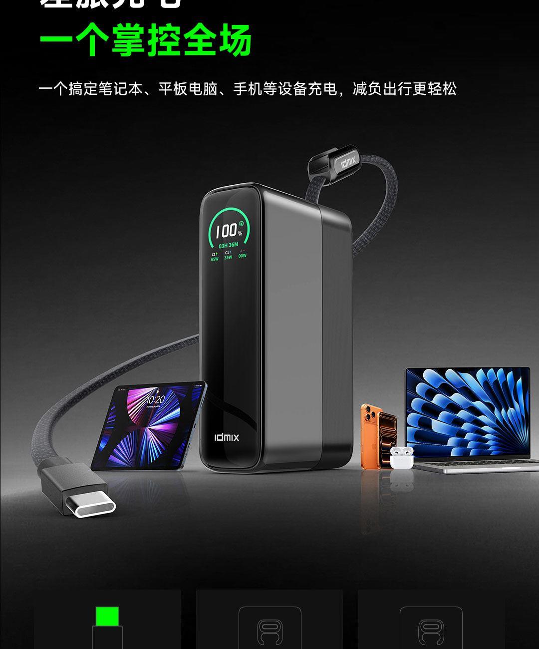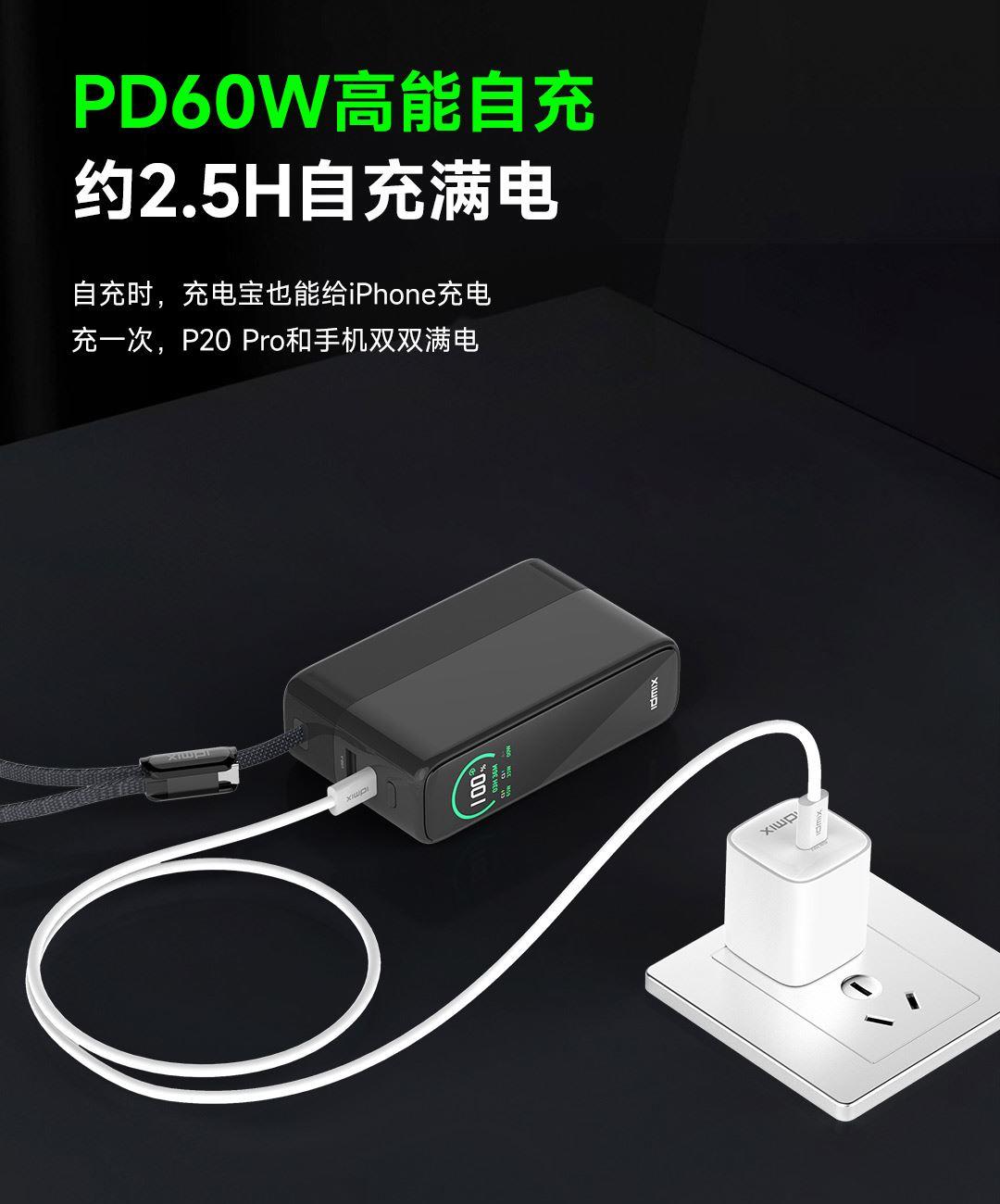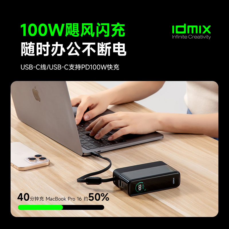 20000mAh大容量,一个搞定笔记本、平板电脑、手机,等设备充电,减负出行更轻松,40分钟 充 MacBook Pro 16"约50%,高效办公不断电。