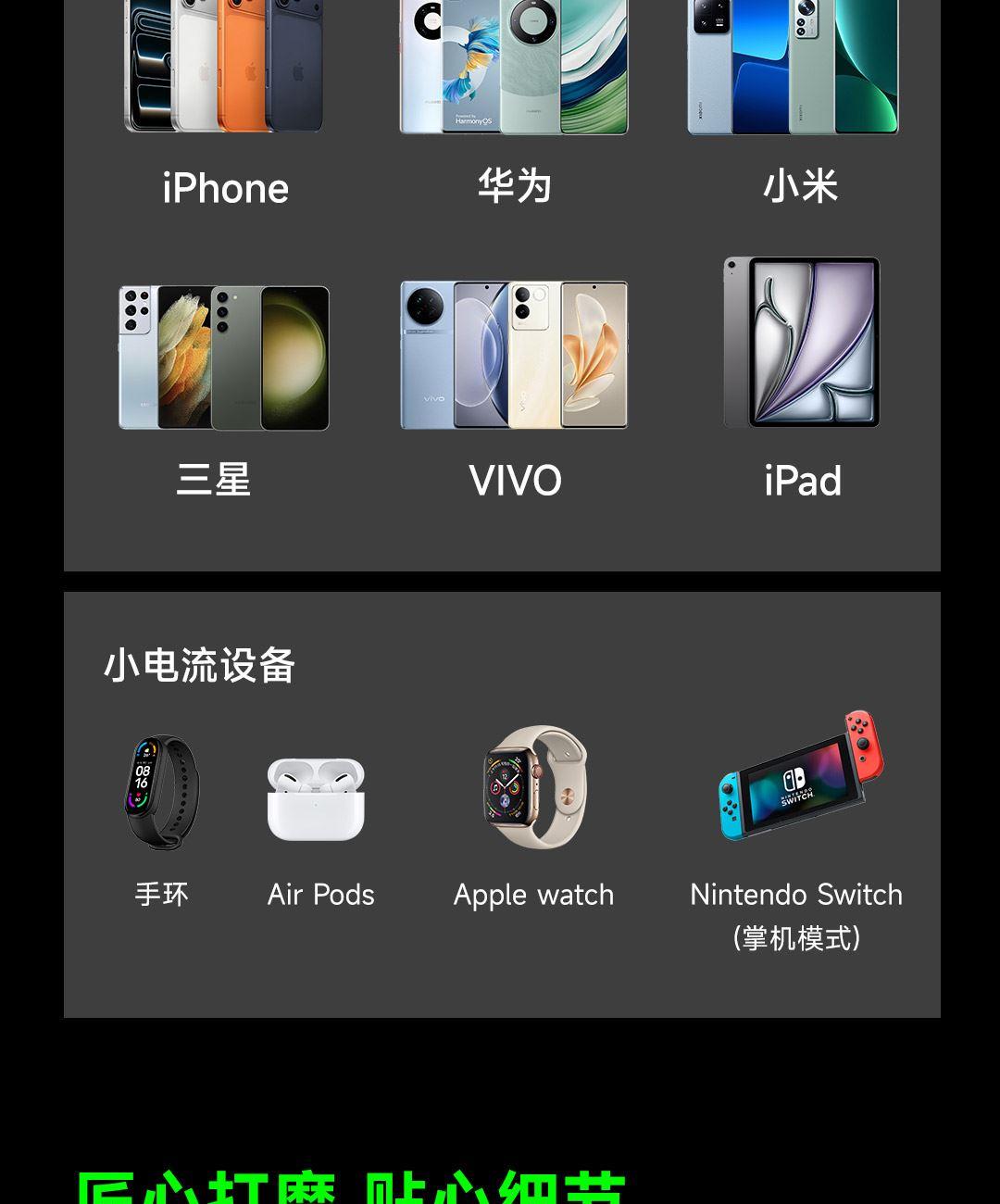 兼容华为FCP/SCP、三星AFC、QC、Apple 2.4A等快充协议,可同时支持三台设备快速充电。