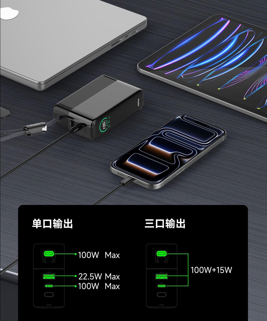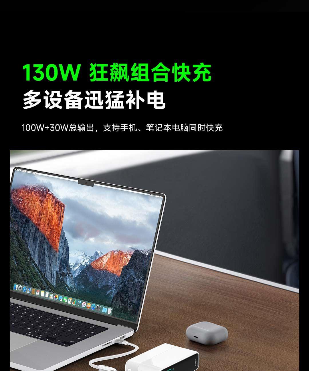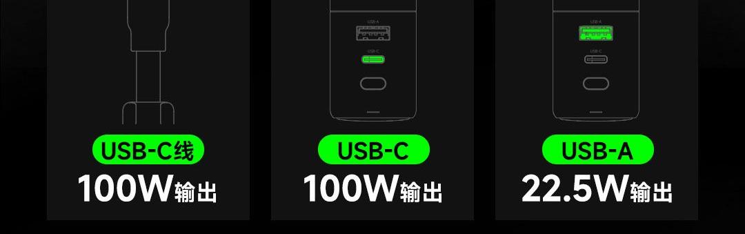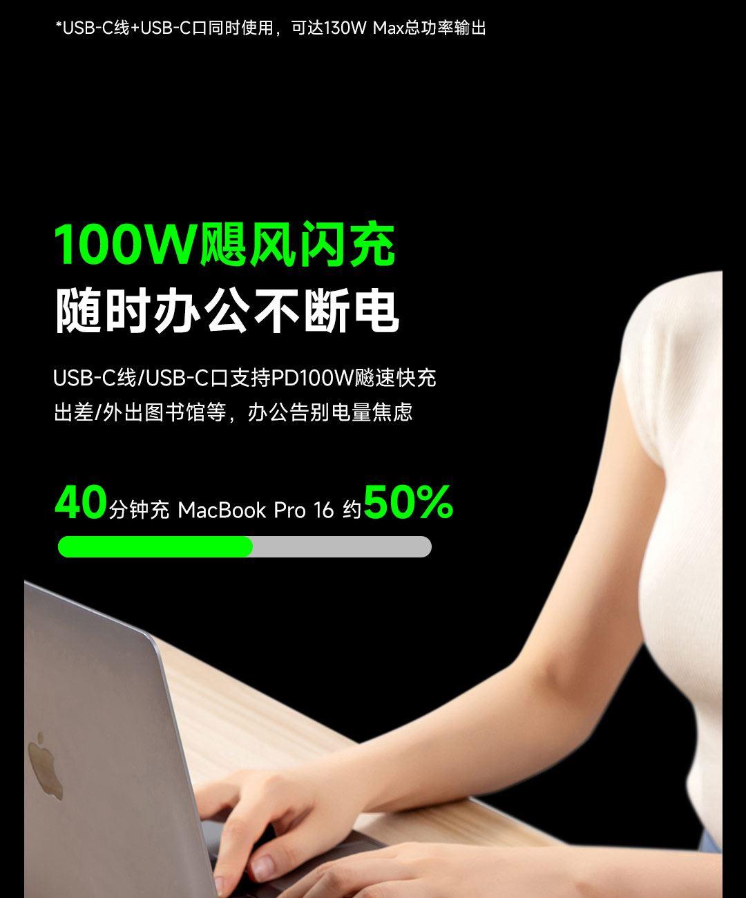 USB-C线+USB-C口同时使用,可达130W Max总功率输出,USB-C线+USB-C口单独使用时为100W输出,USB-A口支持华为SCP/FCP快充协议,USB-C线/USB-C口支持60W自充输入