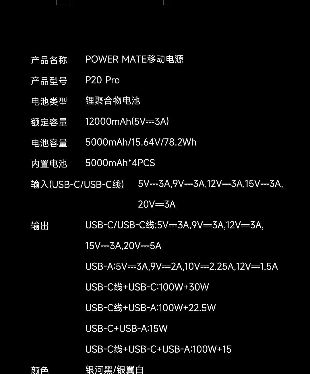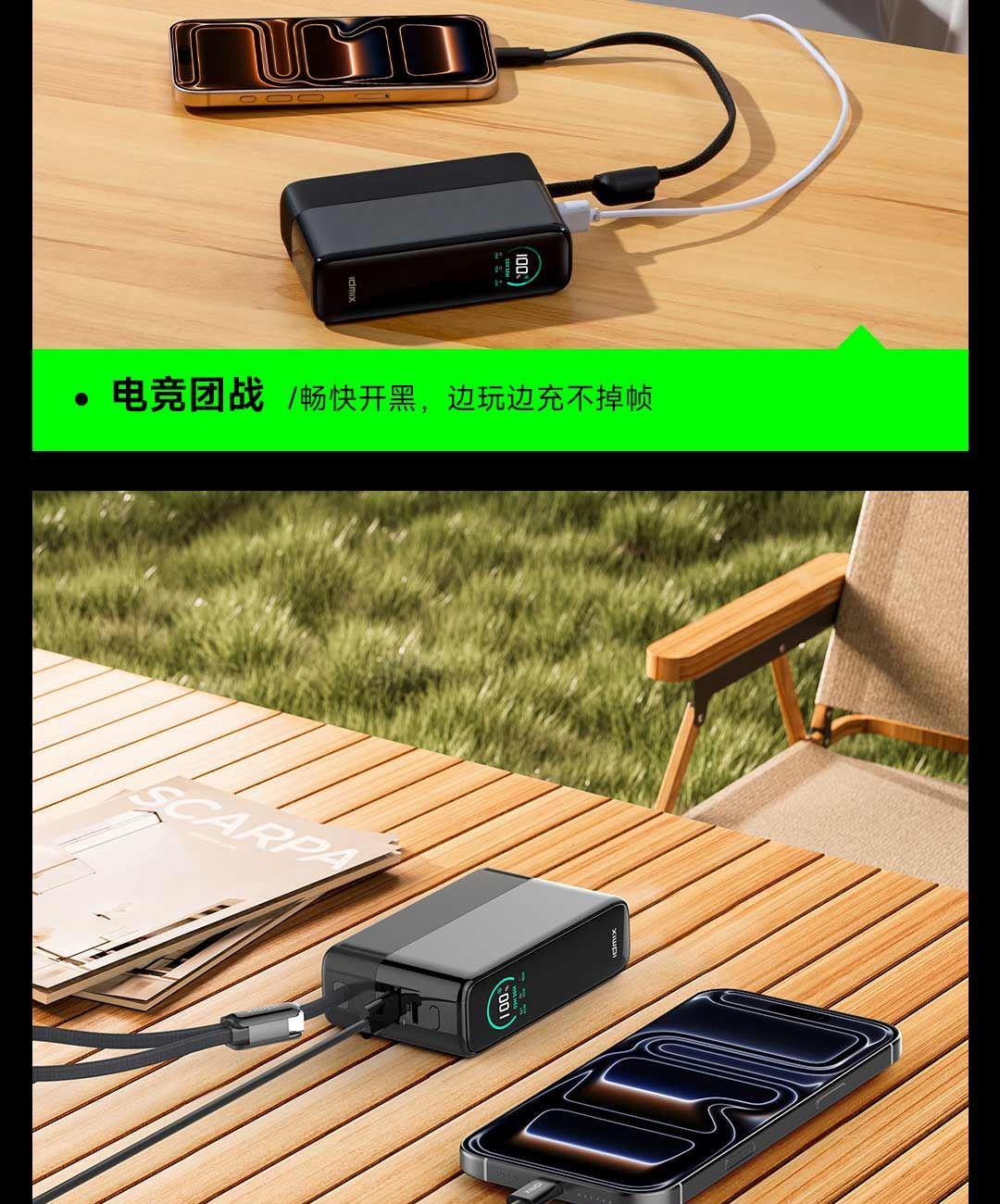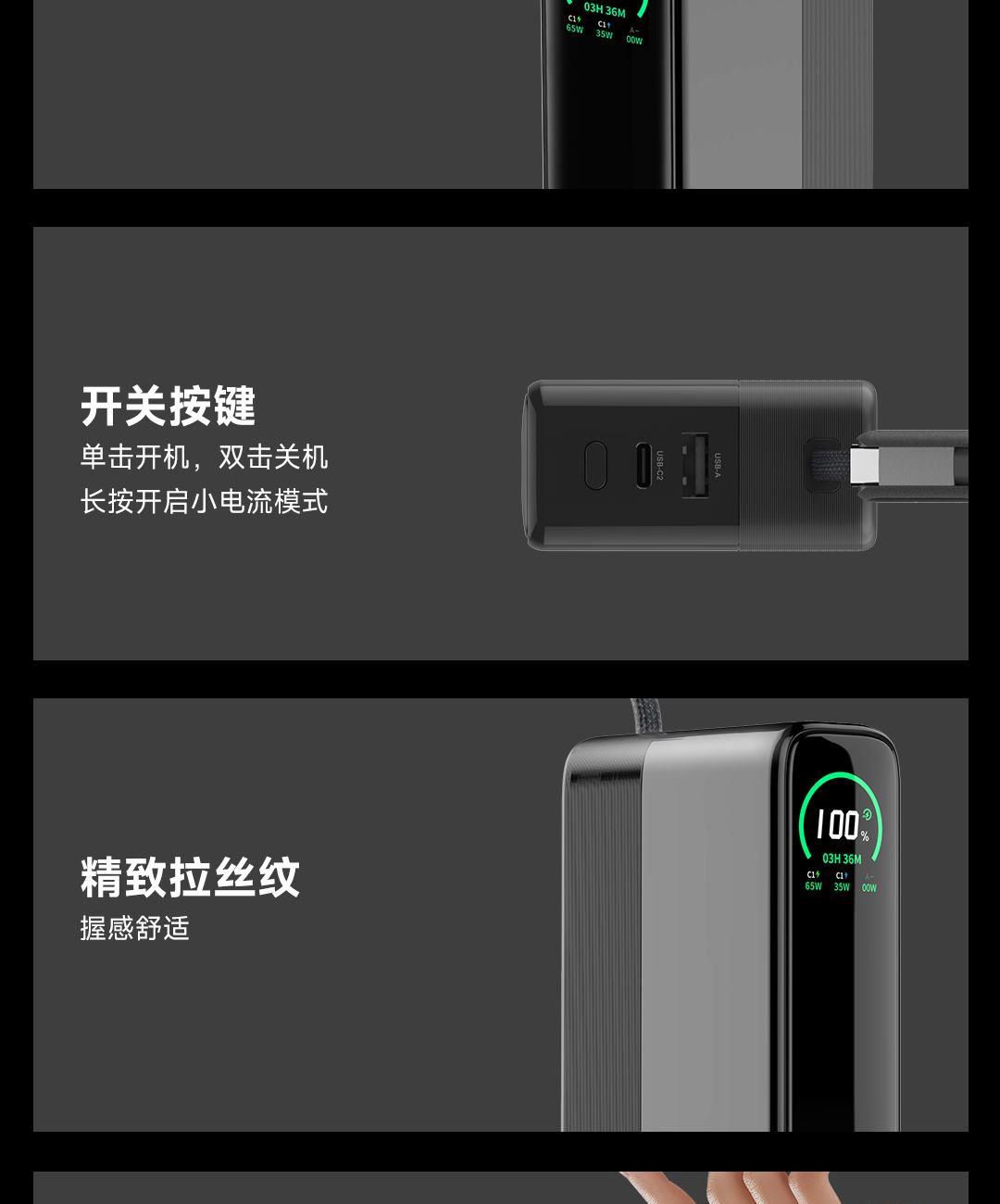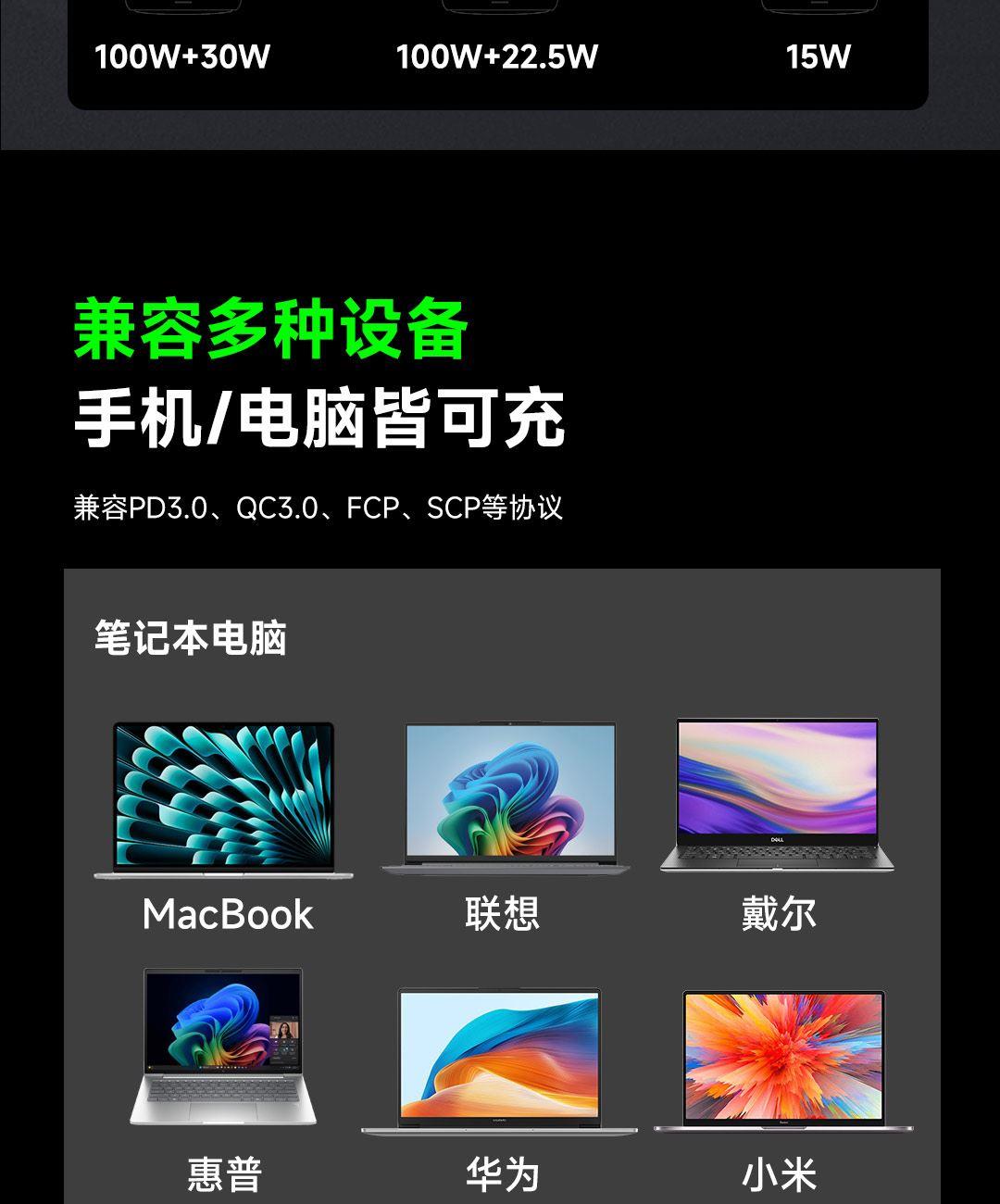 USB-C线+USB-C口同时使用,可达130W Max总功率输出,USB-C线+USB-C口单独使用时为100W输出,USB-A口支持华为SCP/FCP快充协议,USB-C线/USB-C口支持60W自充输入