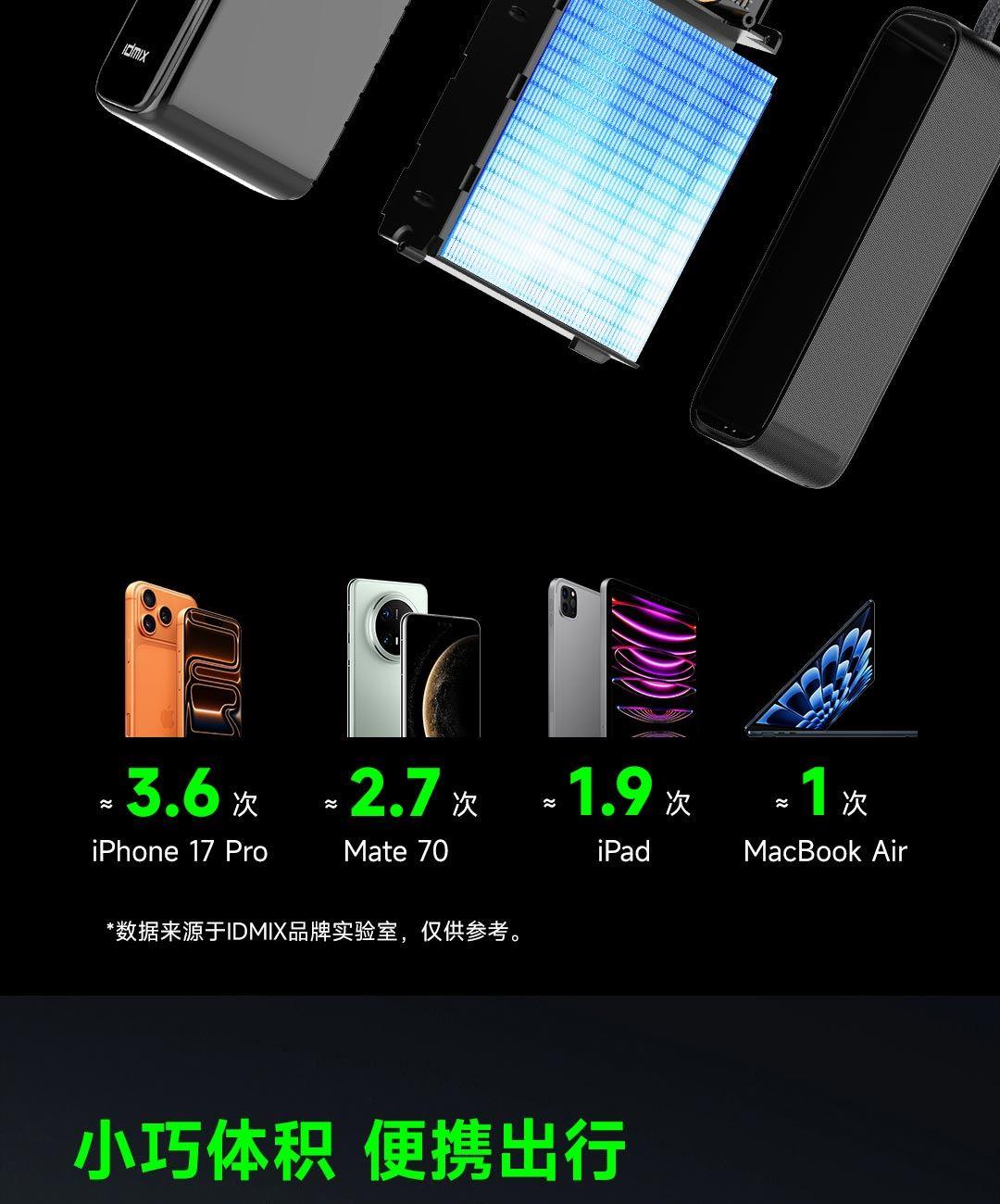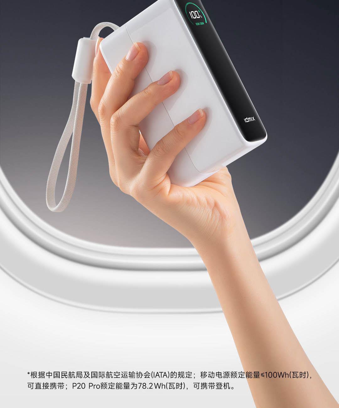 小巧体积,便携出行,符合民航移动电源携带标准,额定能量为 72Wh(瓦时),可上飞机, 出国差旅轻松充电,