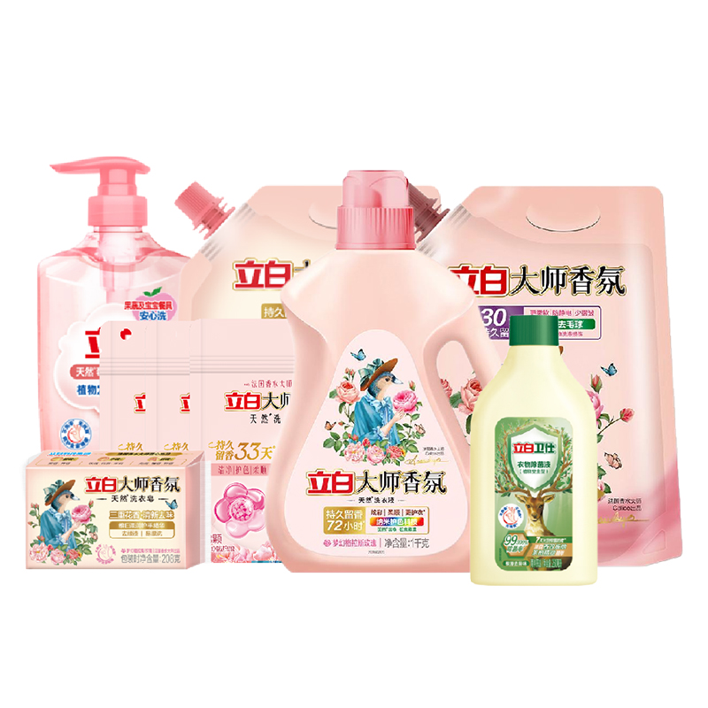 配置: 立白大师香氛洗衣凝珠(梦幻格拉斯玫瑰30克(3颗)*3袋 立白莓果酵素洗洁精1kg*1瓶 立白卫仕衣物除 菌液260毫升*1瓶 立白大师香氛洗衣液1kg*1瓶 立白大师香氛护衣柔顺剂1kg*1袋 立白大师香氛洗衣皂208g*1块 立白大师香氛洗衣液1kg袋装*1袋 卖点: 1.除 菌除螨,持久留香 2.十大功效、洁净柔顺、护型护衣 3.可选产品丰富多样,礼箱随心组合
