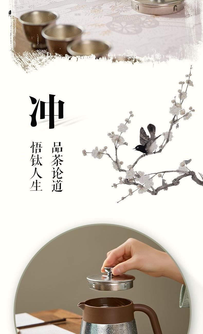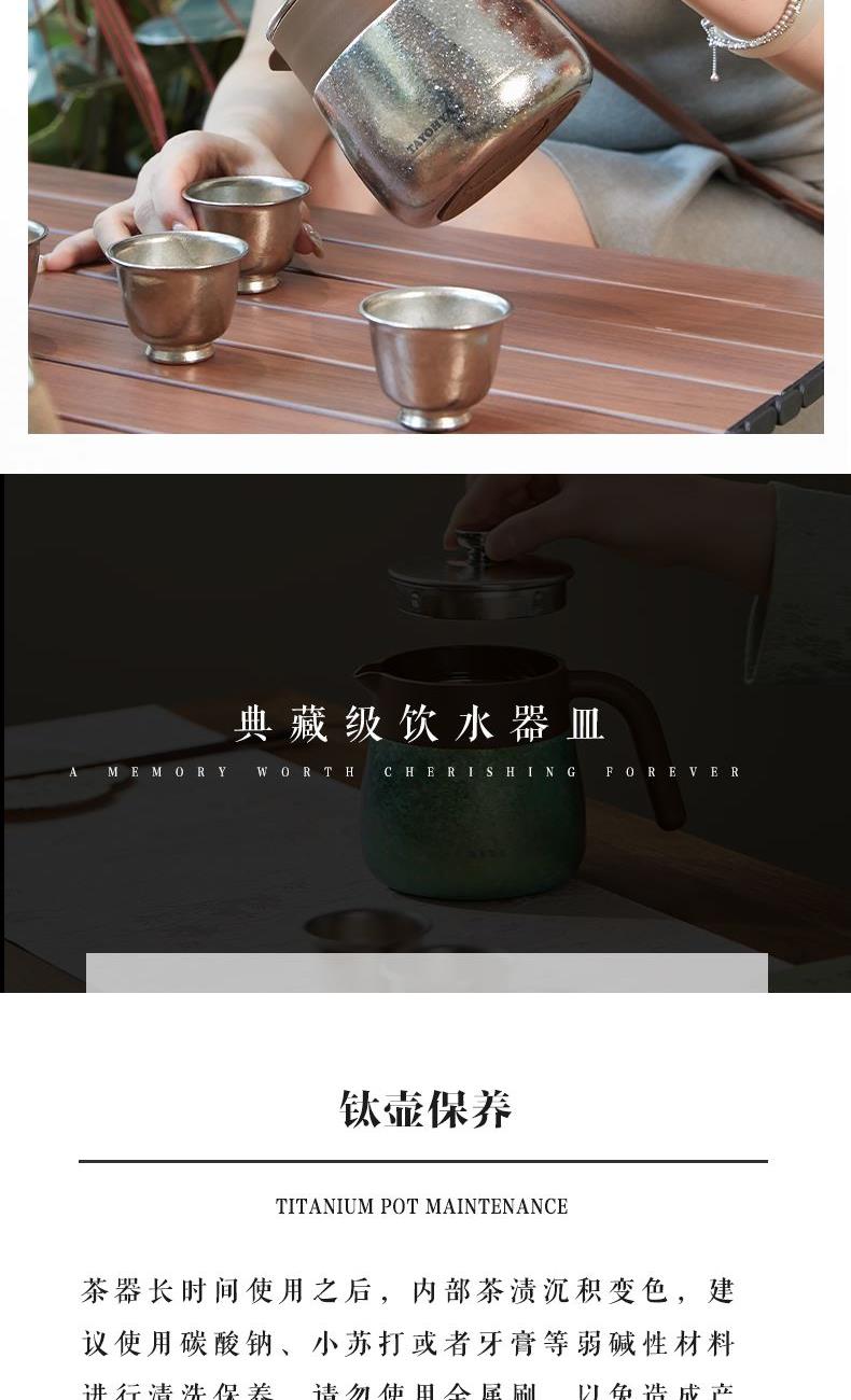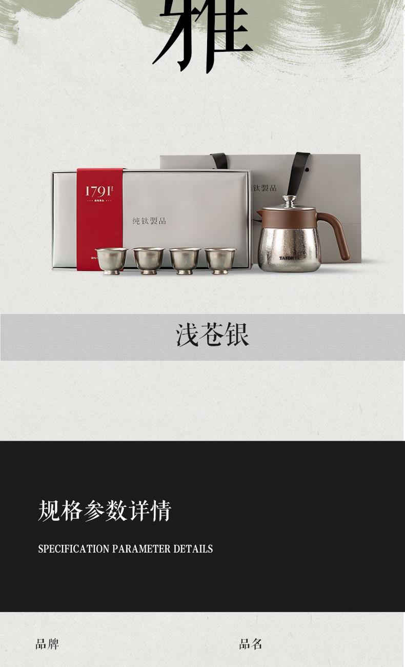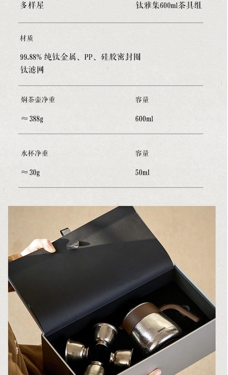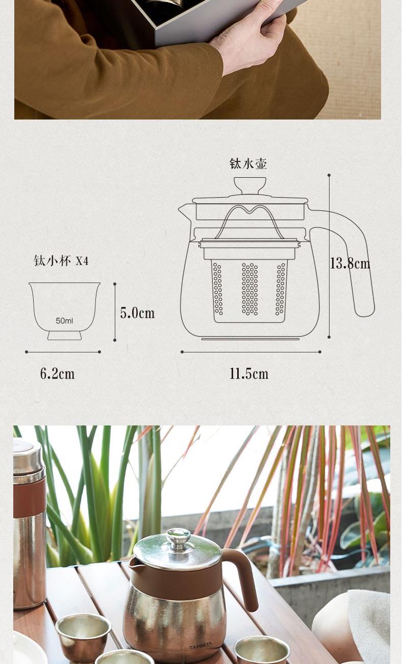产品型号:TA040301064ZZ 颜色分类:钛本色 容 量:600ml 产品配置:焖茶壶X1/茶承X1/小杯X4 装 箱 数:6PCS 金属材质:99%纯钛(Ti) 茶仓滤网:99%纯钛(Ti) 把手材质:食品级PP(聚丙烯) 包装方式:礼盒包装