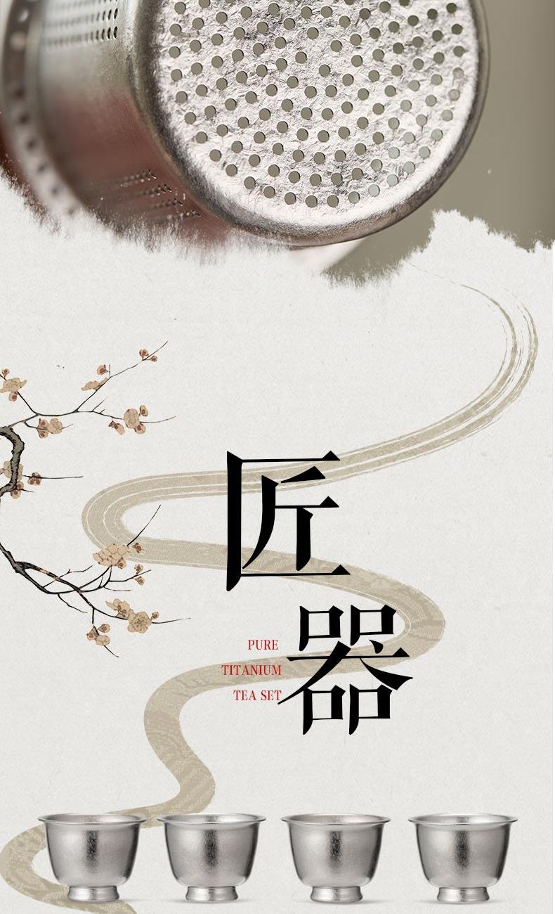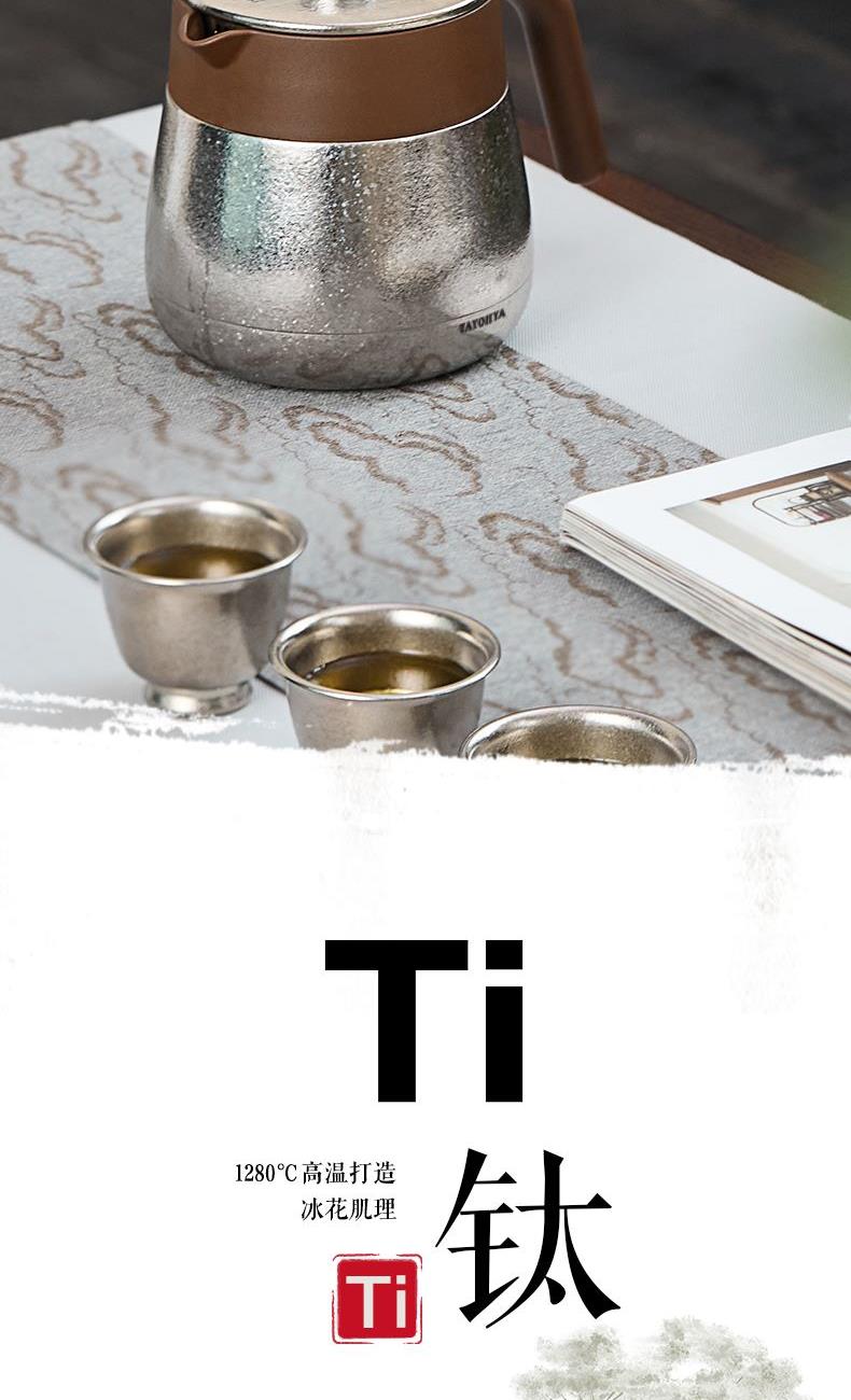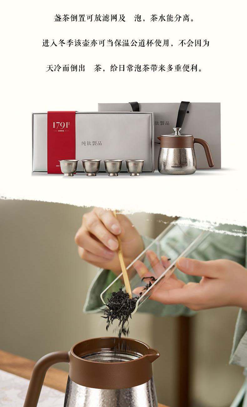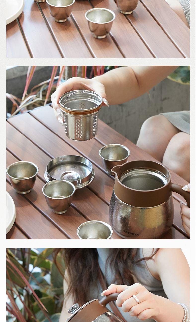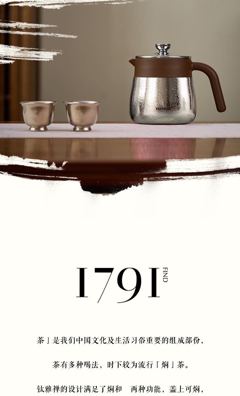 产品型号:TA040301064ZZ 颜色分类:钛本色 容 量:600ml 产品配置:焖茶壶X1/茶承X1/小杯X4 装 箱 数:6PCS 金属材质:99%纯钛(Ti) 茶仓滤网:99%纯钛(Ti) 把手材质:食品级PP(聚丙烯) 包装方式:礼盒包装